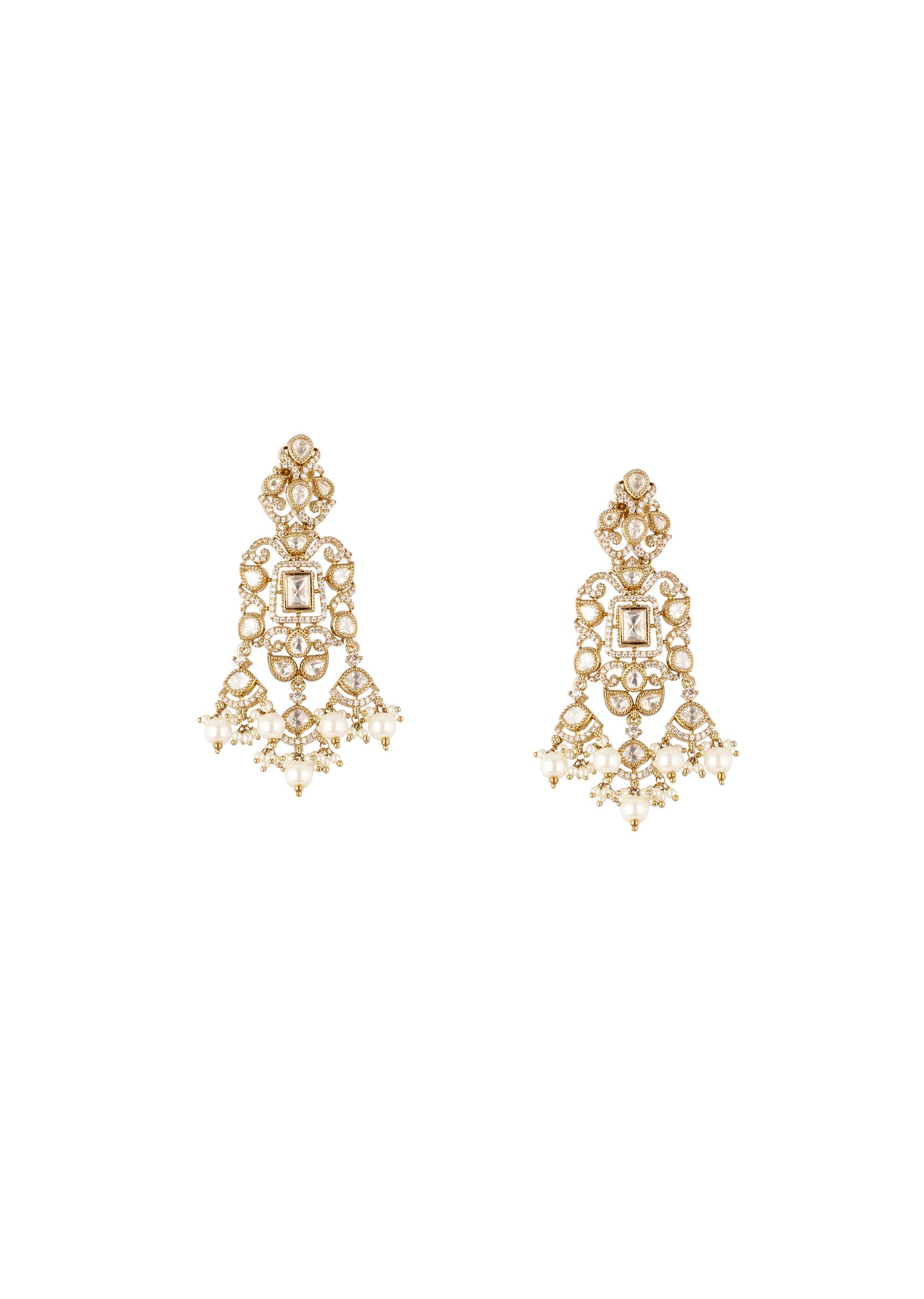 Gold Finish Drop Earrings In Polki With White Simulated Pearls and Clear Marquise Cut Stones