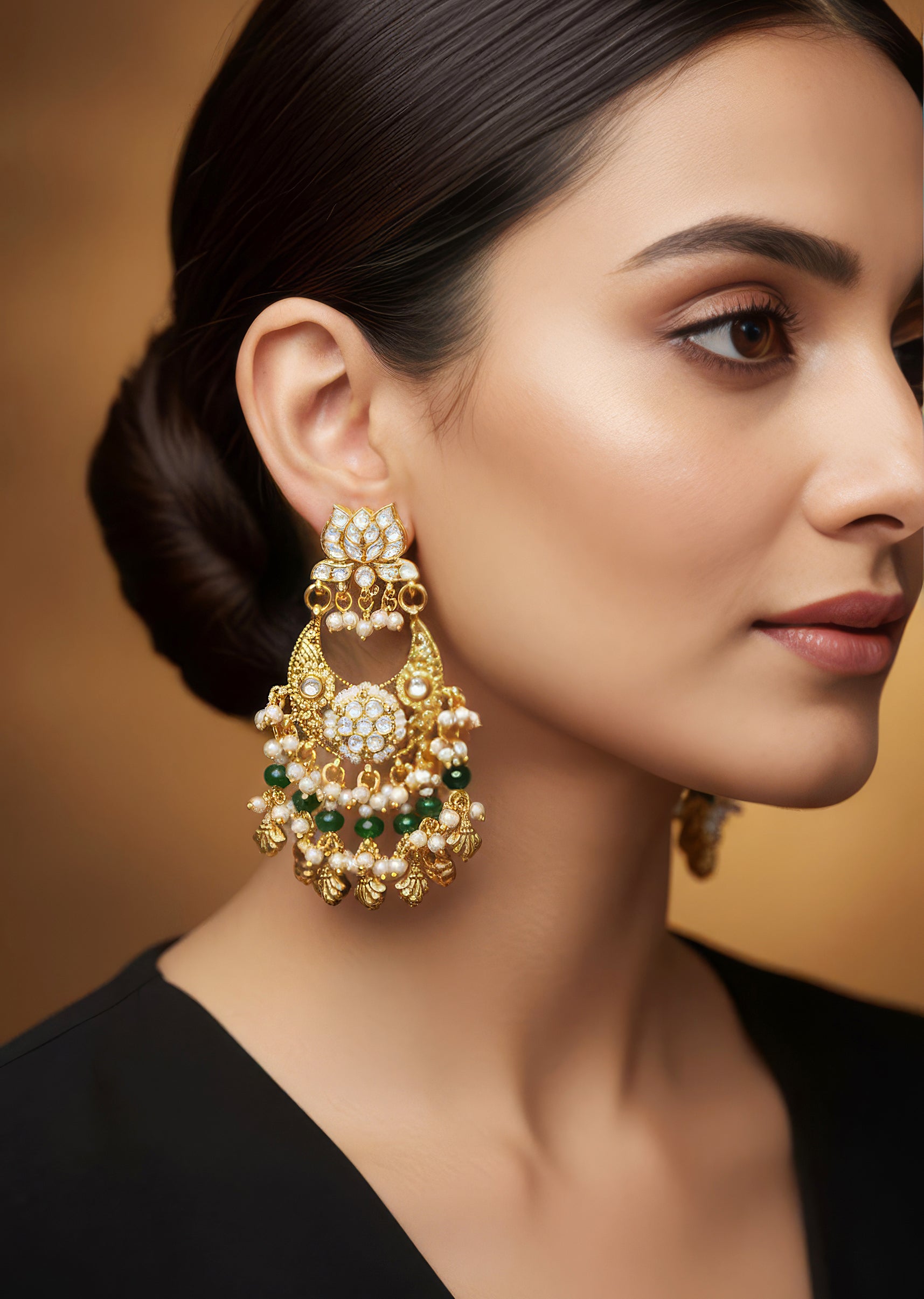 Gold Finish Earrings In Chandelier Style With Kundan And Green Stone And Pearl Detailing