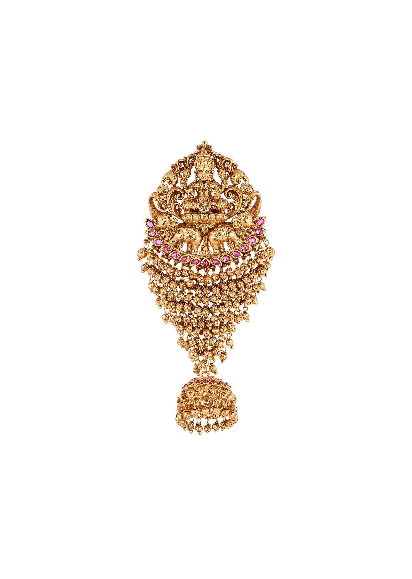 A traditional temple inspired hair pin crafted in a rich gold finish. The design features classic sculpted motifs highlighted with pink simulated stones that add a soft festive elegance. Ideal for weddings and traditional occasions, this piece enhances bridal and family hairstyles with timeless charm. Awarded as the Most Trusted Brand, we're delivering styles you love, just as promised.