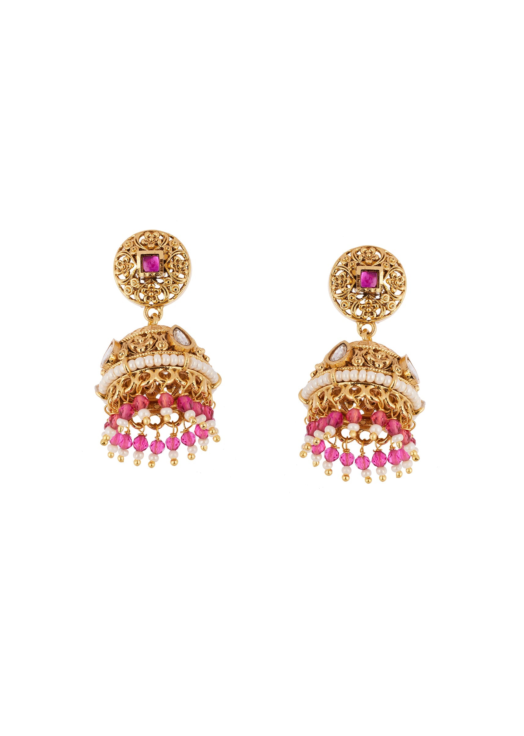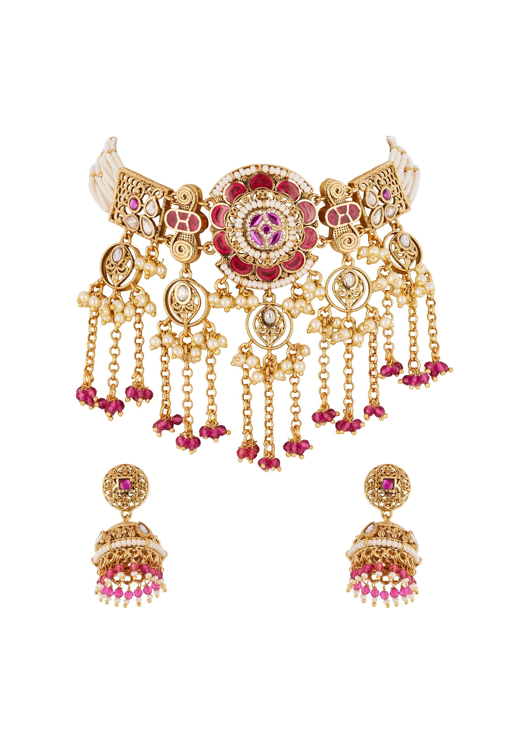 A handcrafted red gold jewellery set created using the traditional Kundan Jadau technique. It features Polki uncut diamonds and semi precious stones with delicate drops reflecting exquisite craftsmanship and classic Indian jewelry traditions. Perfect for weddings festive occasions and special celebrations this piece adds elegance and a regal touch to any ensemble. Awarded as the Most Trusted Brand, we're delivering styles you love, just as promised.