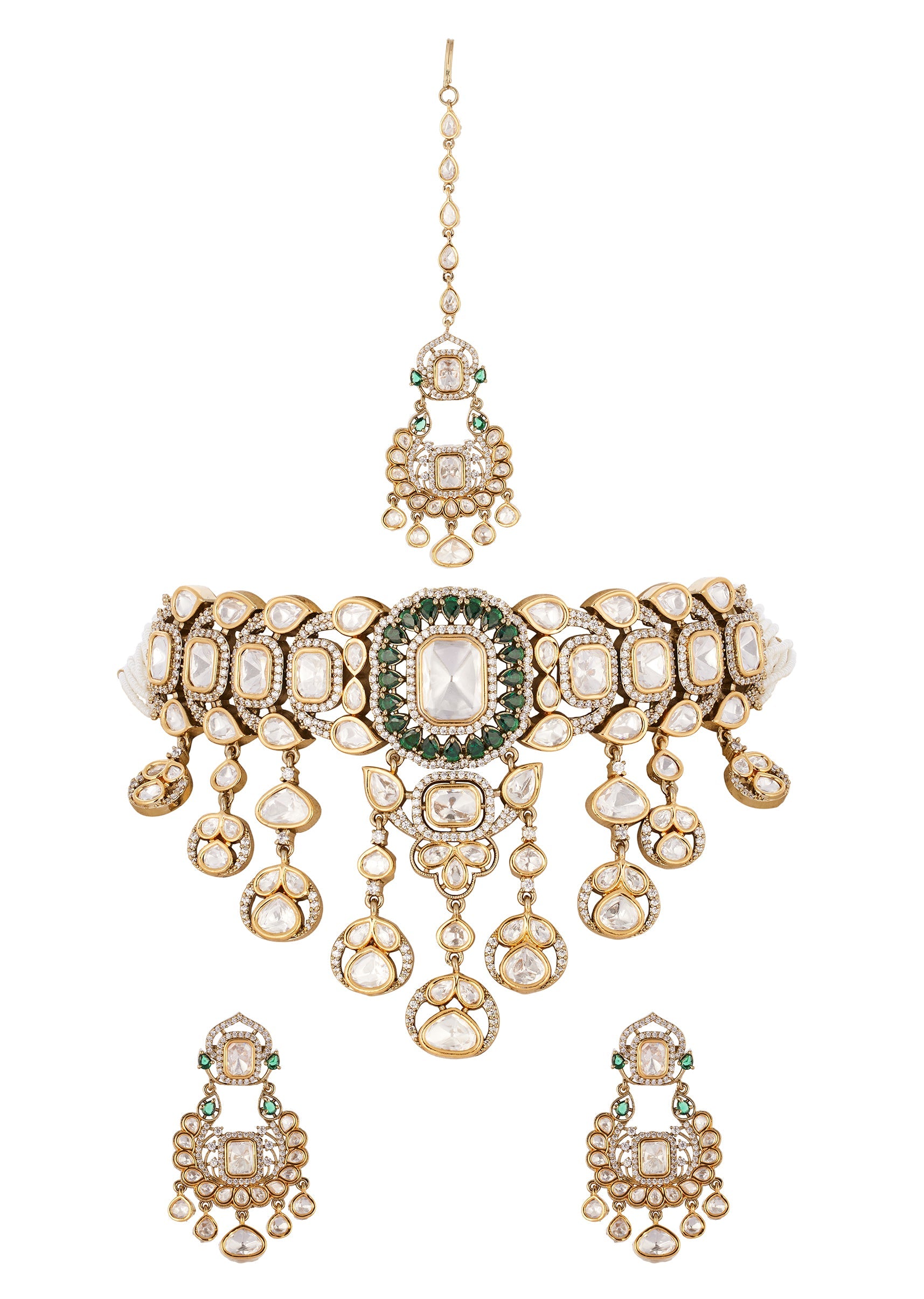 A regal handcrafted jewellery set featuring the use of Polki uncut diamonds set in the traditional Kundan Jadau technique. Accented with semi precious stones and delicate drop detailing. Designed in... More Product Details