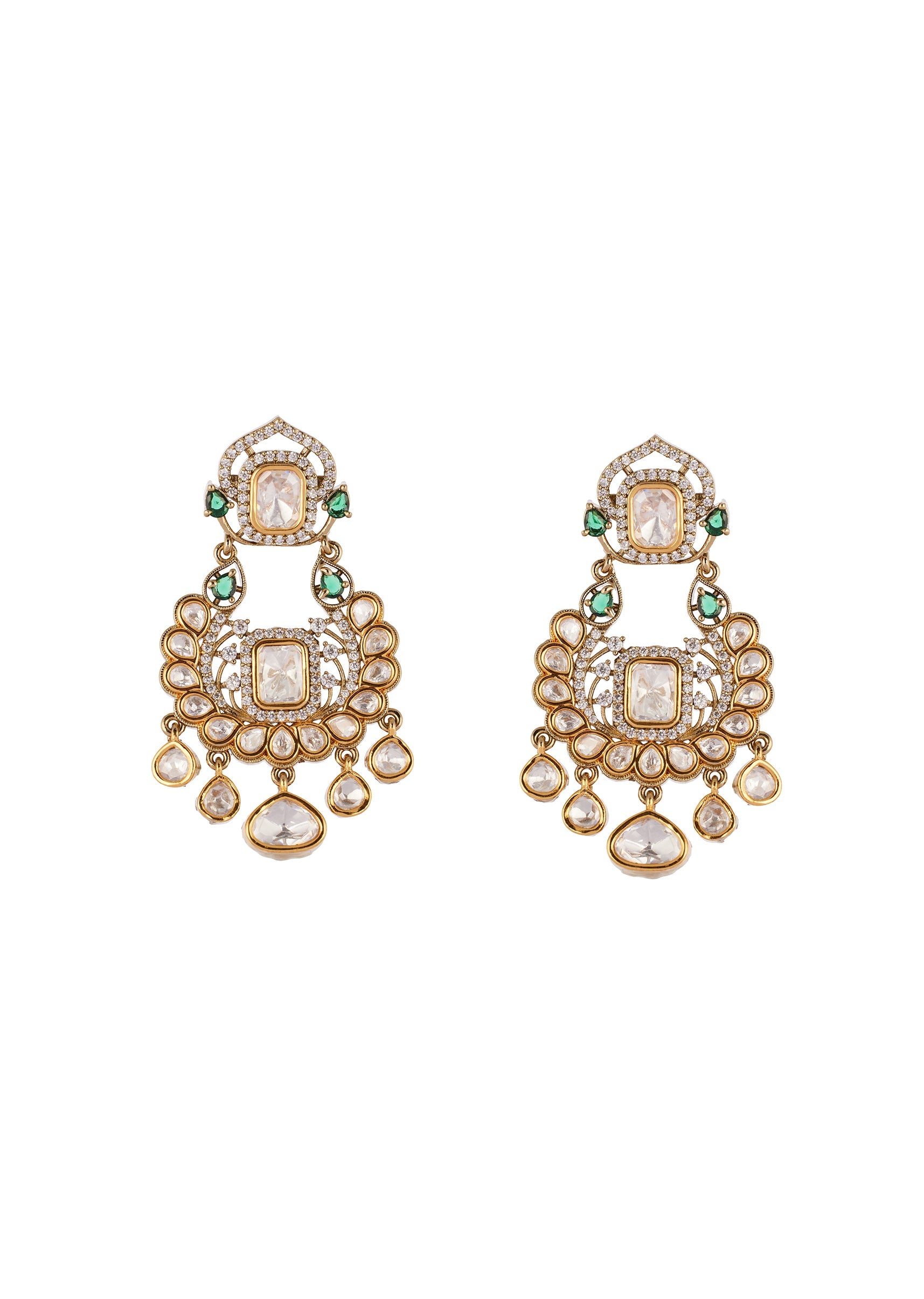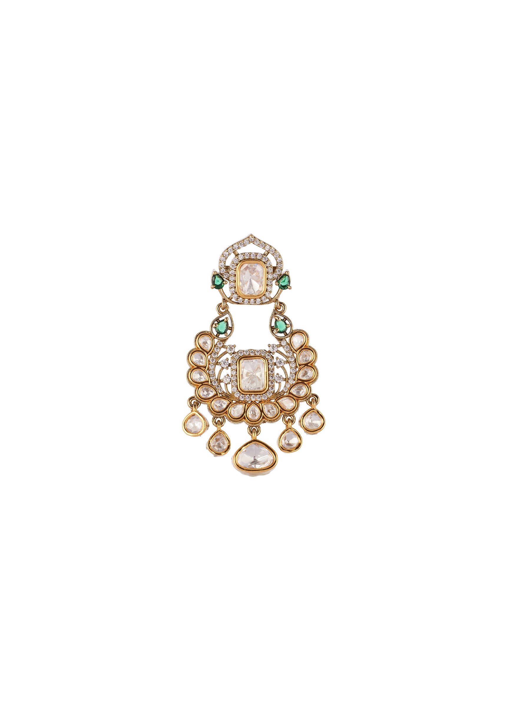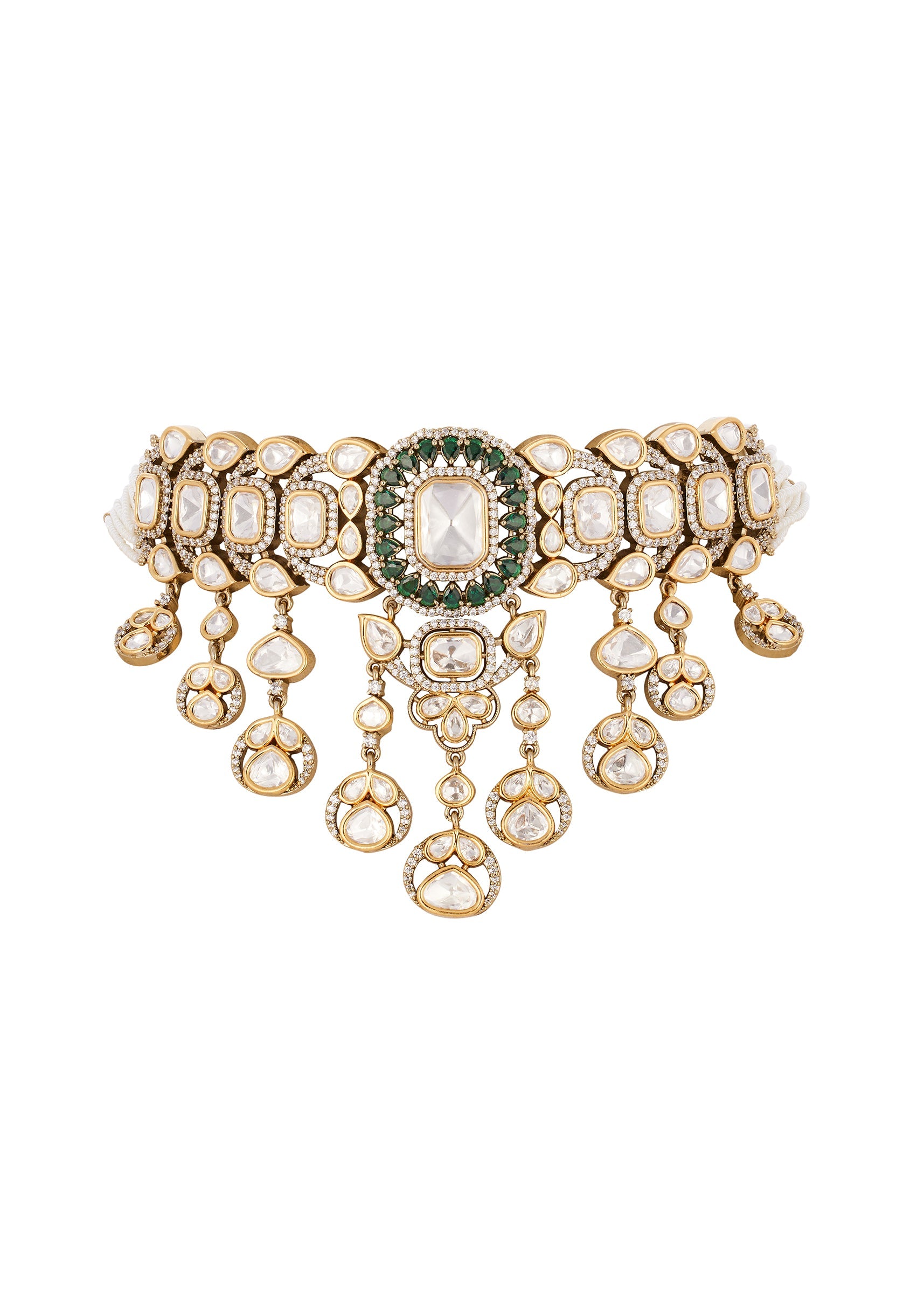 A regal handcrafted jewellery set featuring the use of Polki uncut diamonds set in the traditional Kundan Jadau technique. Accented with semi precious stones and delicate drop detailing. Designed in a rich green gold tone for festive and wedding elegance. Awarded as the Most Trusted Brand, we're delivering styles you love, just as promised.