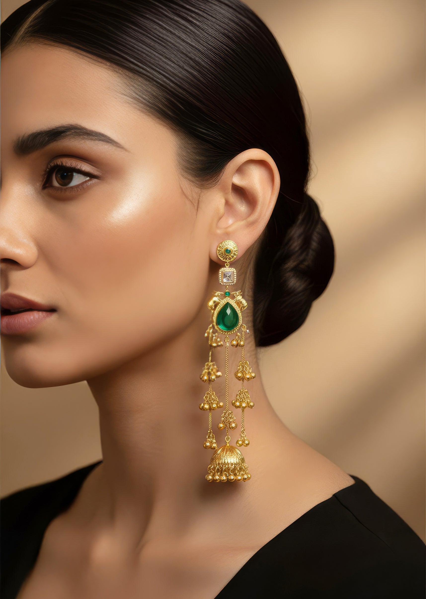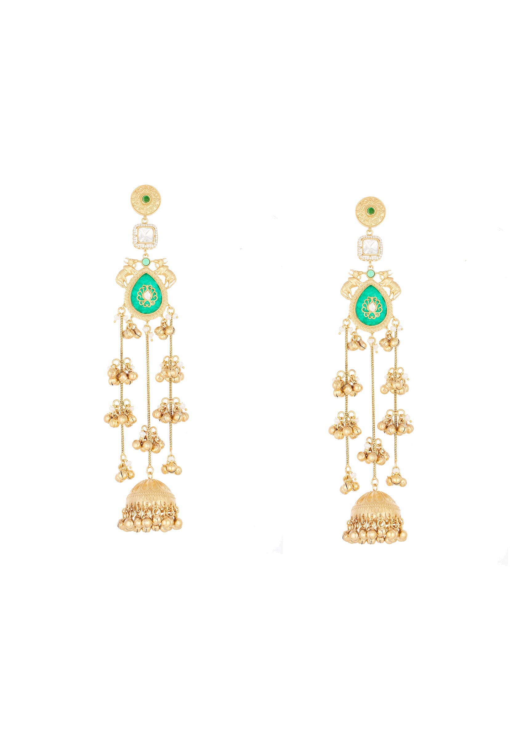 A stunning handcrafted jhumka designed with a vibrant green centre, delicate Kundan inspired detailing, and cascading multi tiered drops. Finished with an ornate dome and gold beads, this piece adds... More Product Details