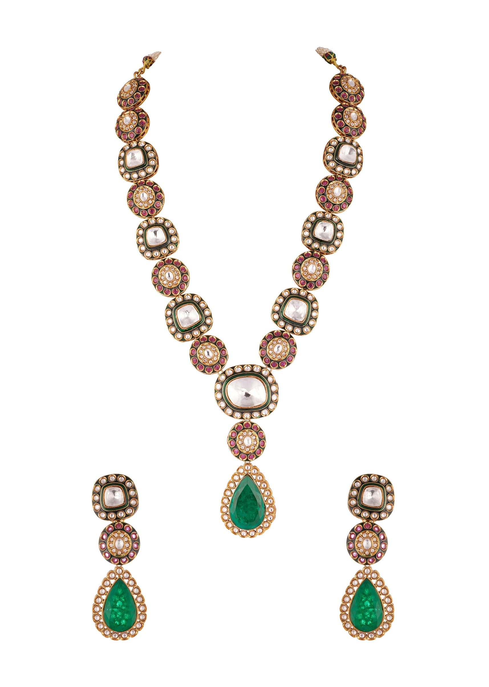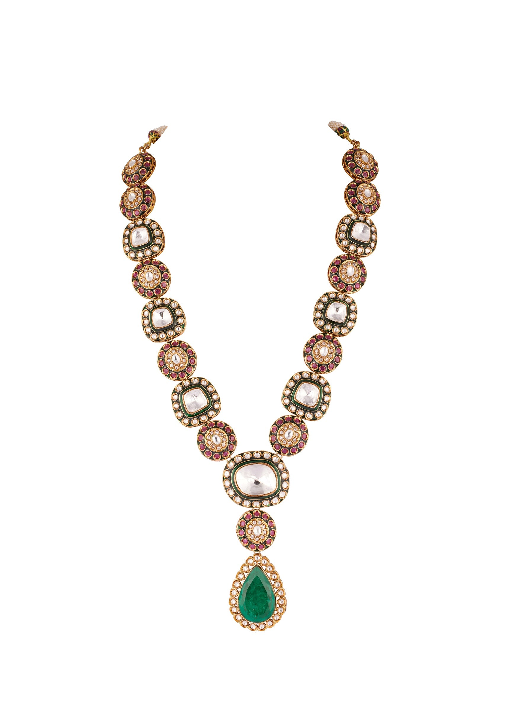 Gold Finish Kundan Long Necklace Set With Central Emerald Drop Pendant And Ruby Pearl Accents