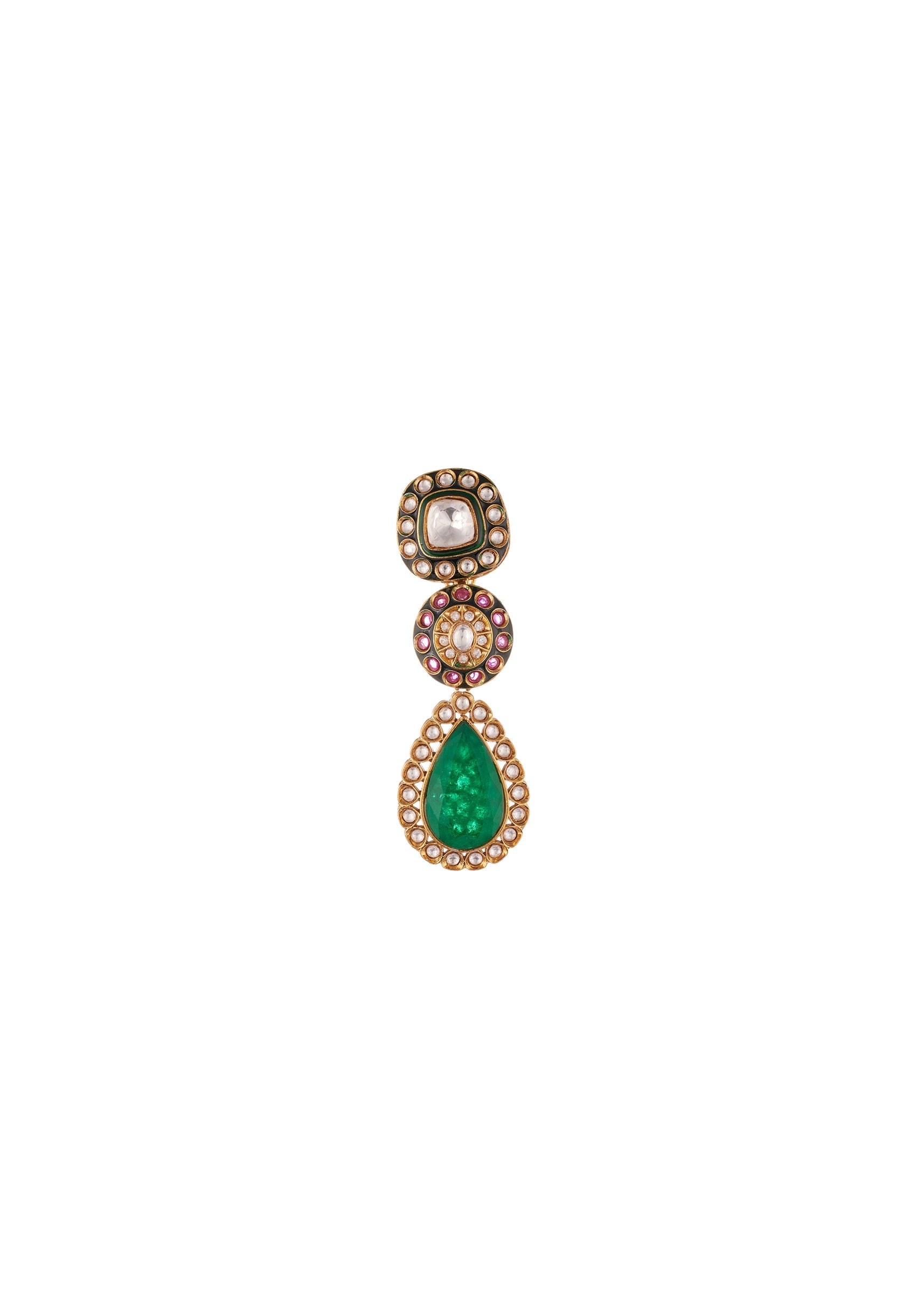 : Pair it with a deep green red or cream lehenga or saree to highlight the emerald pendant and enhance the kundan detailing.