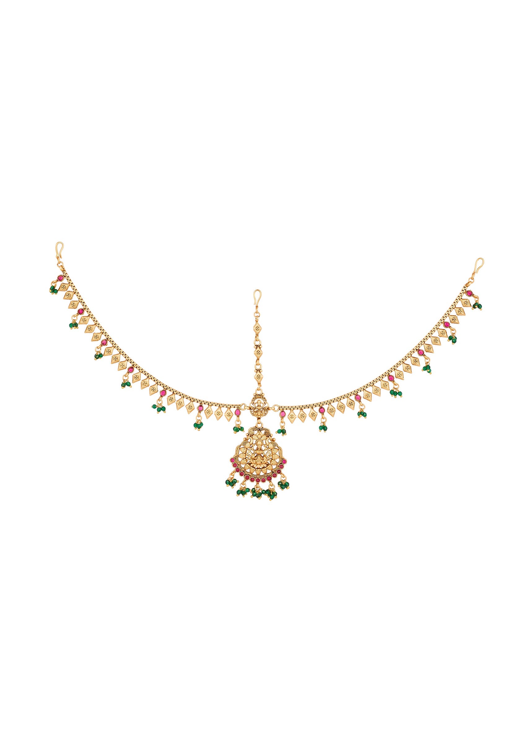 Gold Finish Mathapati With Temple Style Motifs And Green and Pink Simulated Stones