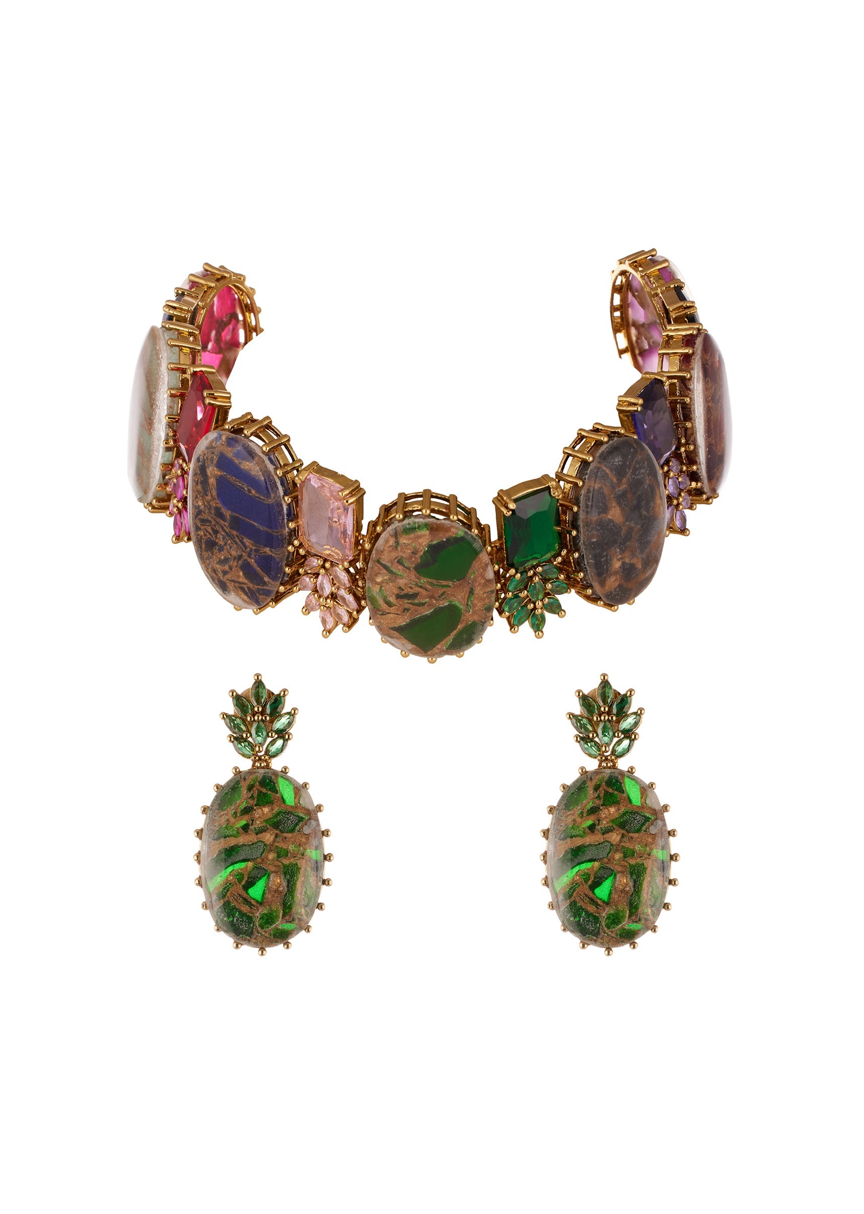 Gold Finish Multi Stone Choker Necklace Set With Large Oval Cabochons And Marbled Stones