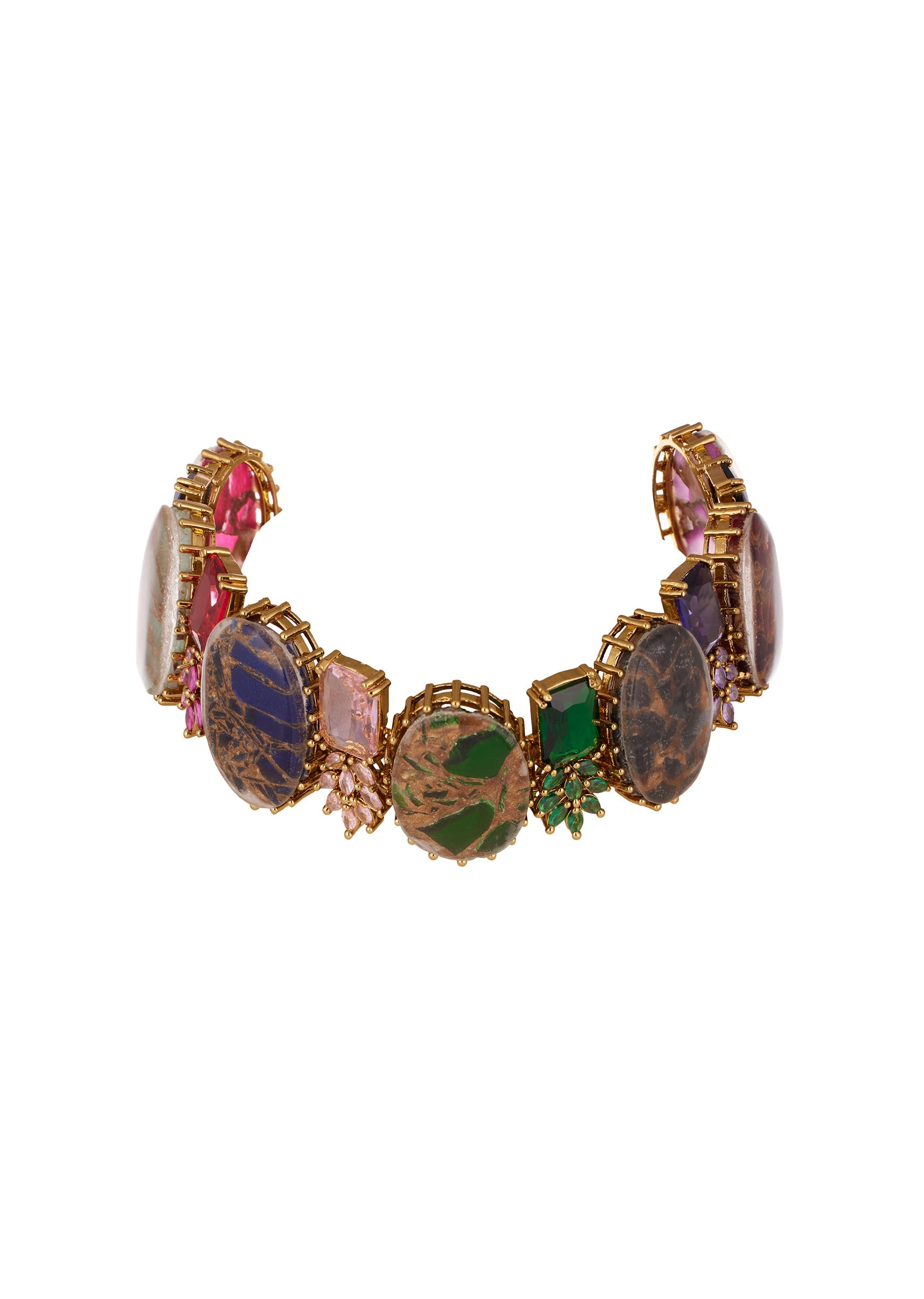 A vibrant festive choker crafted to elevate sangeet and mehendi looks as a wedding guest. The design features large oval cabochon stones in mixed colors and marbled patterns creating a... More Product Details