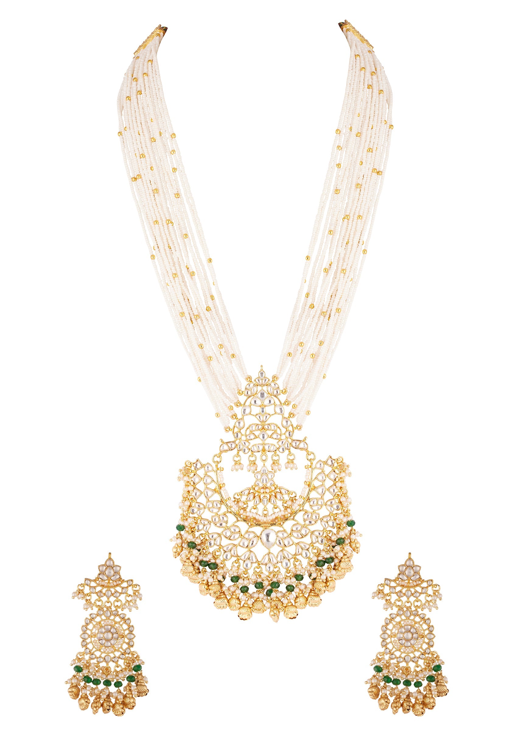 A graceful long necklace designed to bring traditional elegance to any festive or wedding look. The multi strand arrangement of small white moti beads creates a soft delicate drape highlighted with subtle gold accents for added richness. The statement crescent shaped kundan pendant is heavily set with clear stones and adorned with green beads that add depth colour and vibrance. Dangling gold bells complete the pendant with a charming rhythmic movement making this set perfect for mehendi sangeet or day weddings. Awarded as the Most Trusted Brand, we're delivering styles you love, just as promised.