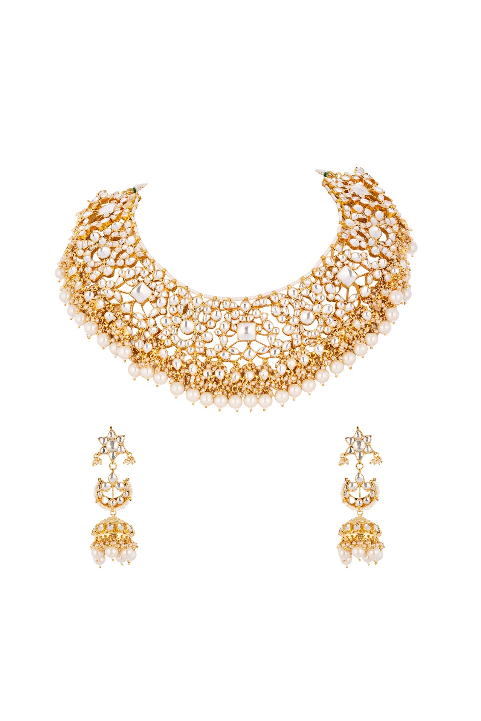 This gold off white necklace set is crafted using traditional Kundan Polki in classic Jadau technique, finished with soft pearl drops for a regal bridal appeal. Handcrafted with intricate detailing,... More Product Details