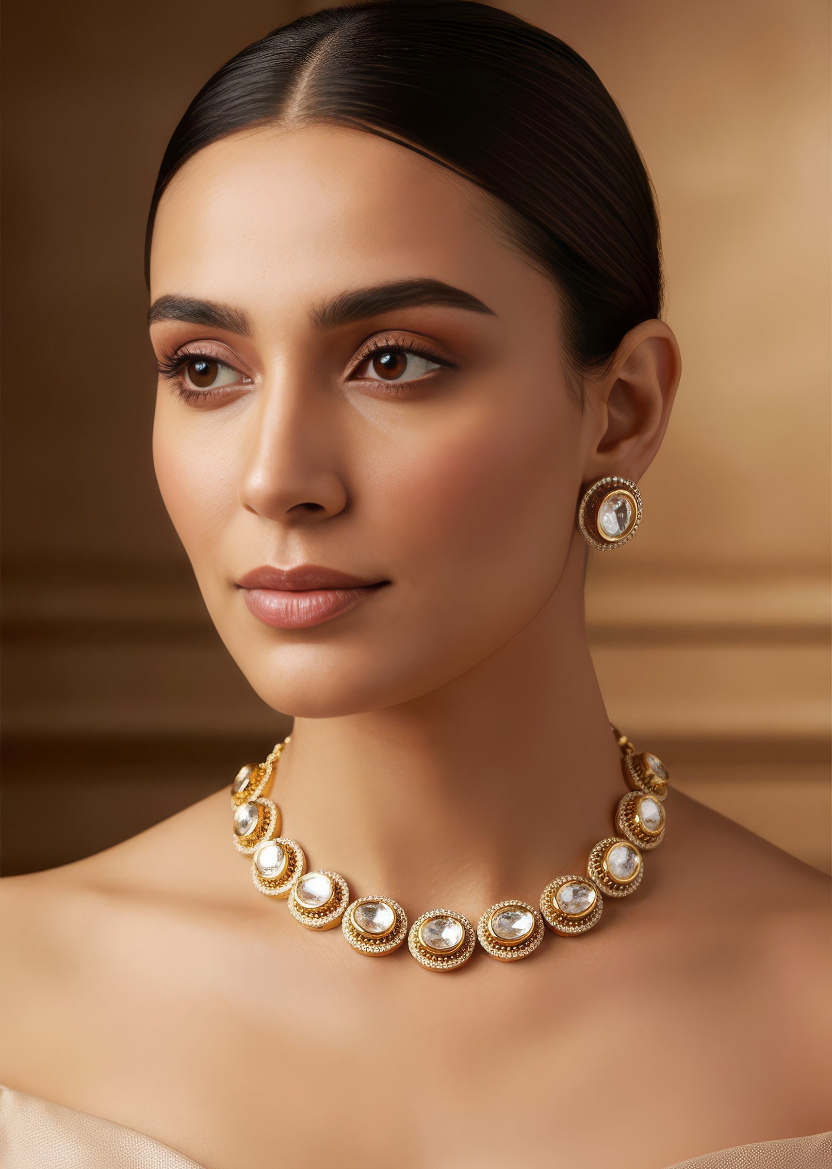 Pair it with a deep neckline lehenga or saree to let the Polki detailing stand out beautifully.