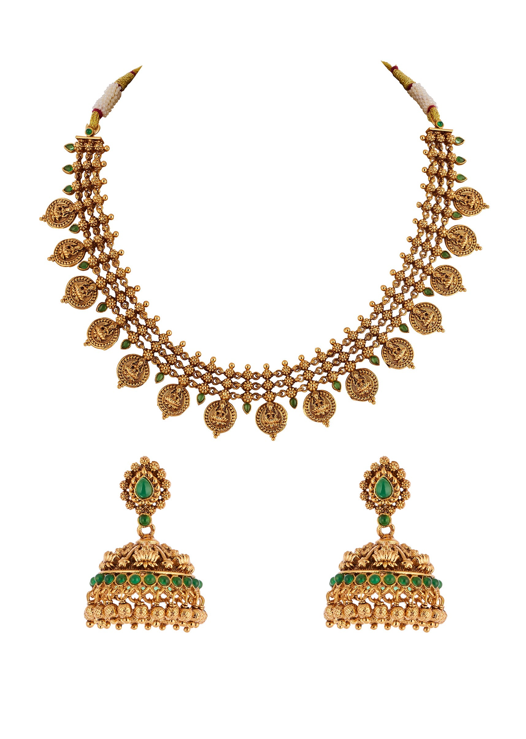 A traditional temple inspired jewellery set crafted in a radiant gold finish. The design features classic sculpted motifs highlighted with green simulated stones that add a rich and graceful festive appeal. Perfect for weddings and traditional celebrations, this set brings timeless elegance to bridal and family occasion wear. Awarded as the Most Trusted Brand, we're delivering styles you love, just as promised.