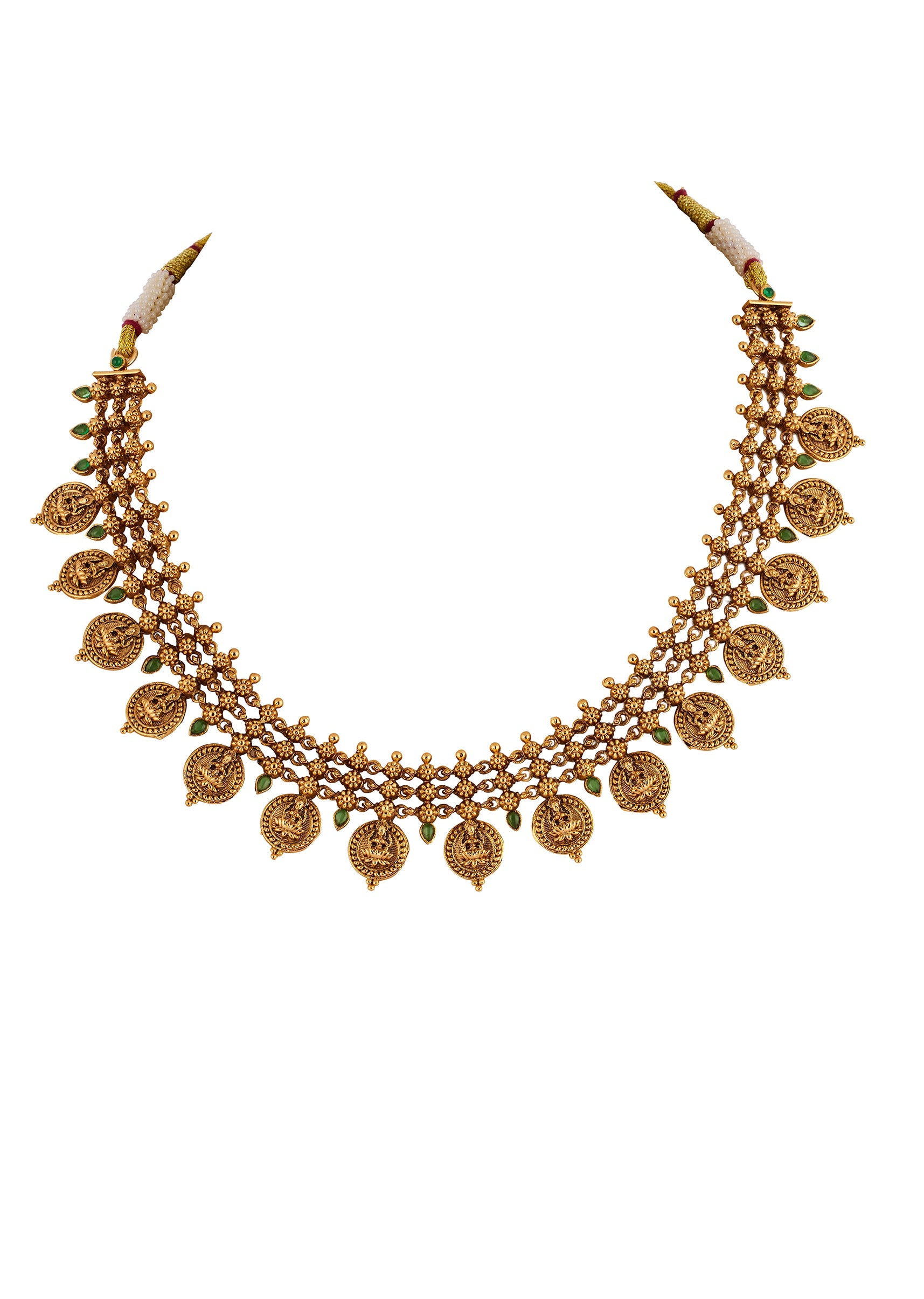 Gold Finish Necklace Set With Temple Style Motifs And Green Simulated Stones