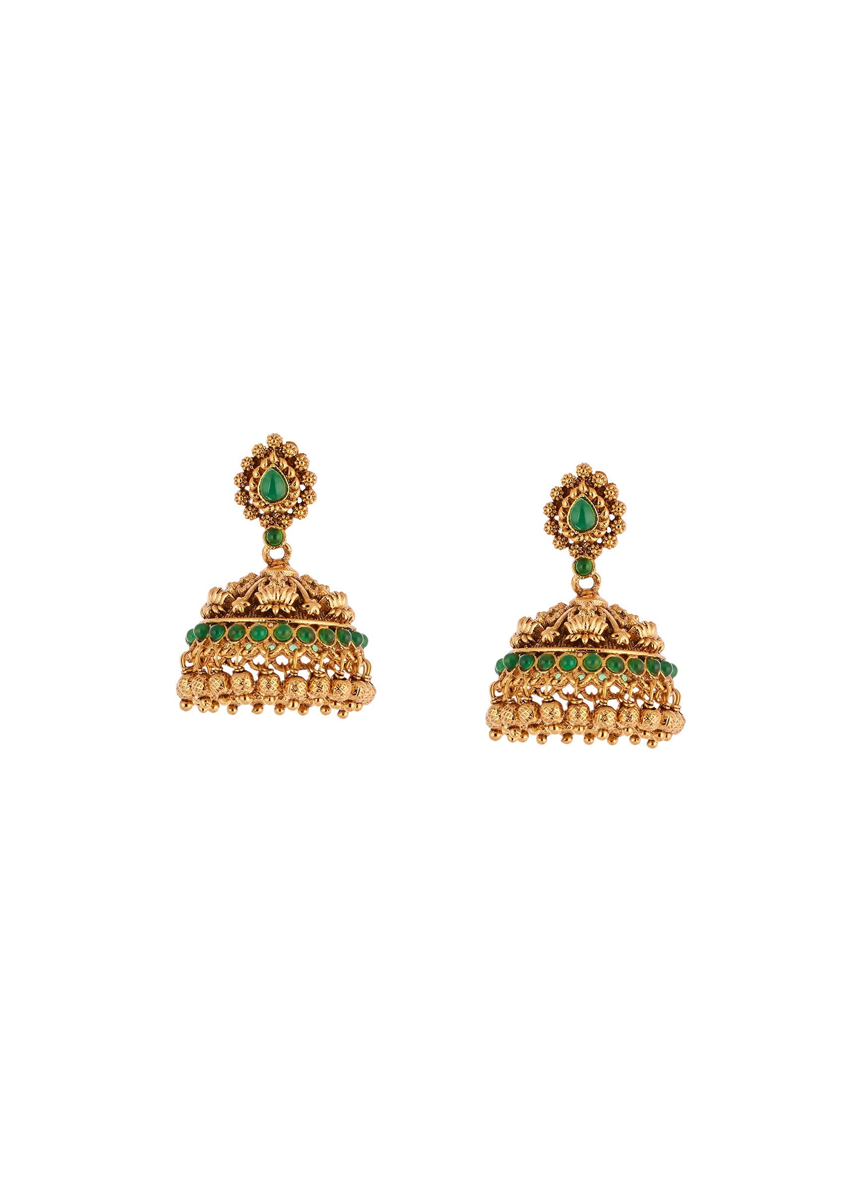 Style it with a silk saree or a traditional lehenga in neutral or jewel tones to beautifully complement the green stone detailing.