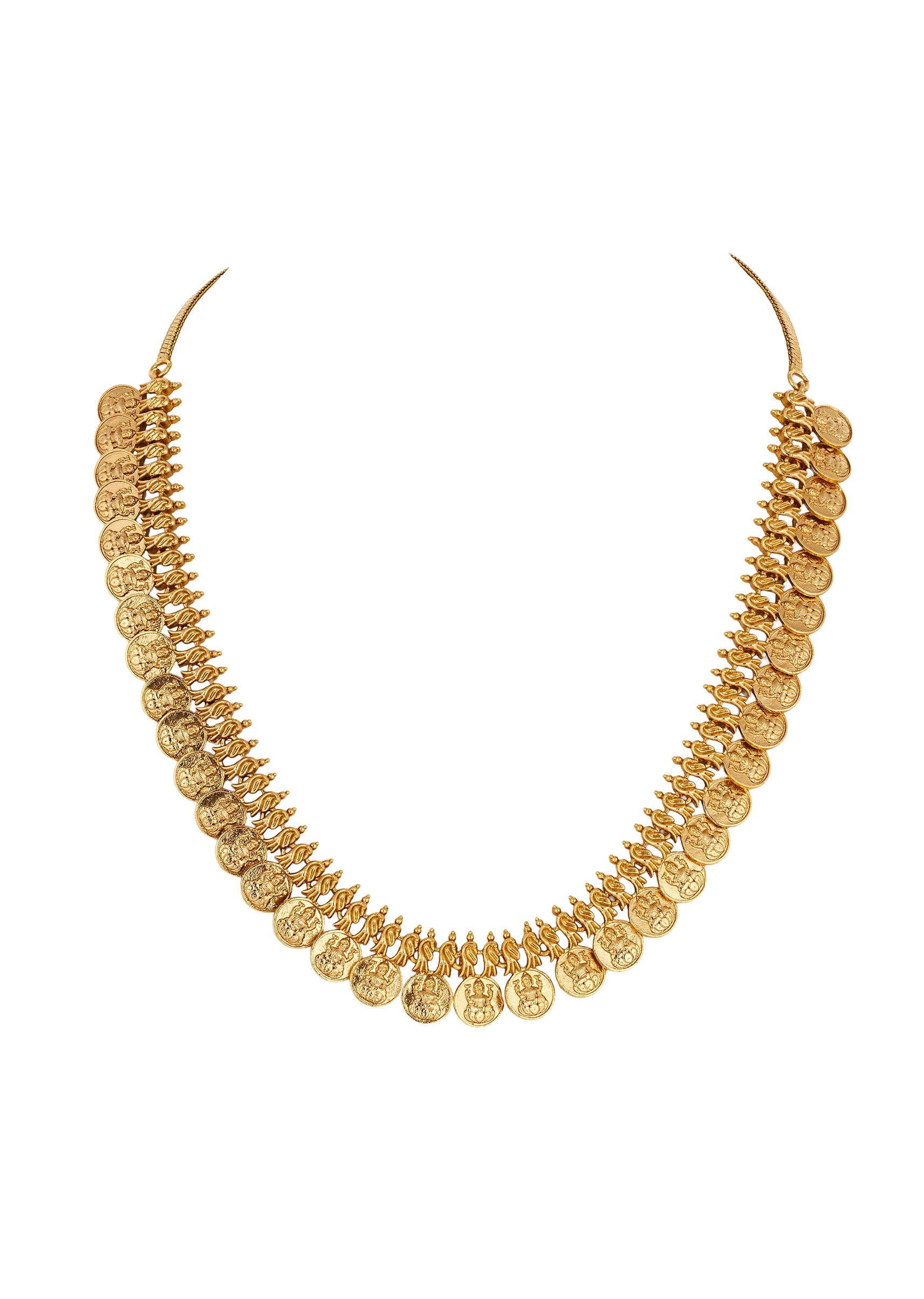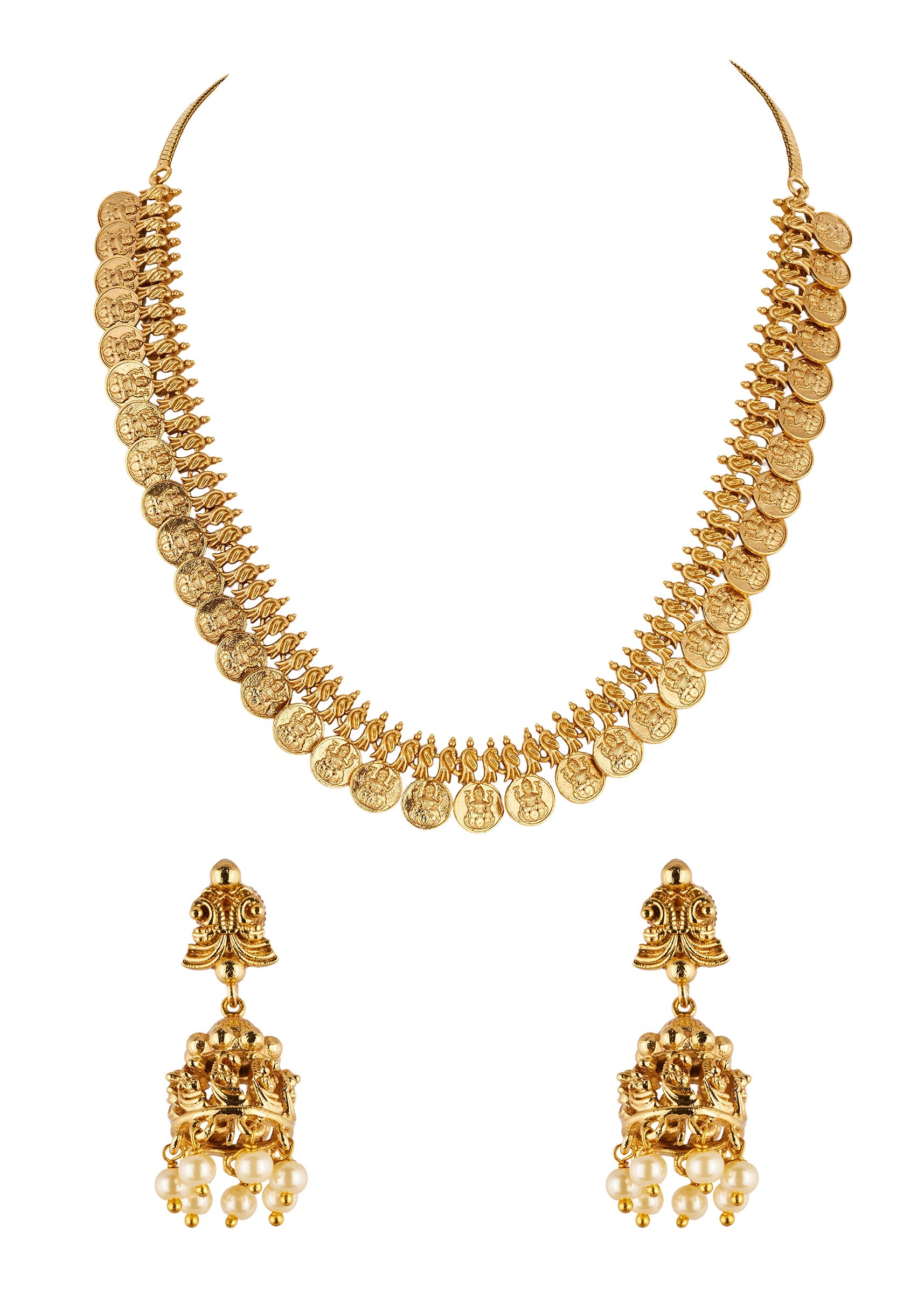 A traditional temple inspired jewellery set crafted in a radiant gold finish. The design features classic sculpted motifs accented with off white simulated stones that add a subtle festive elegance. Perfect for weddings and traditional celebrations, this set enhances bridal and family looks with timeless charm. Awarded as the Most Trusted Brand, we're delivering styles you love, just as promised.