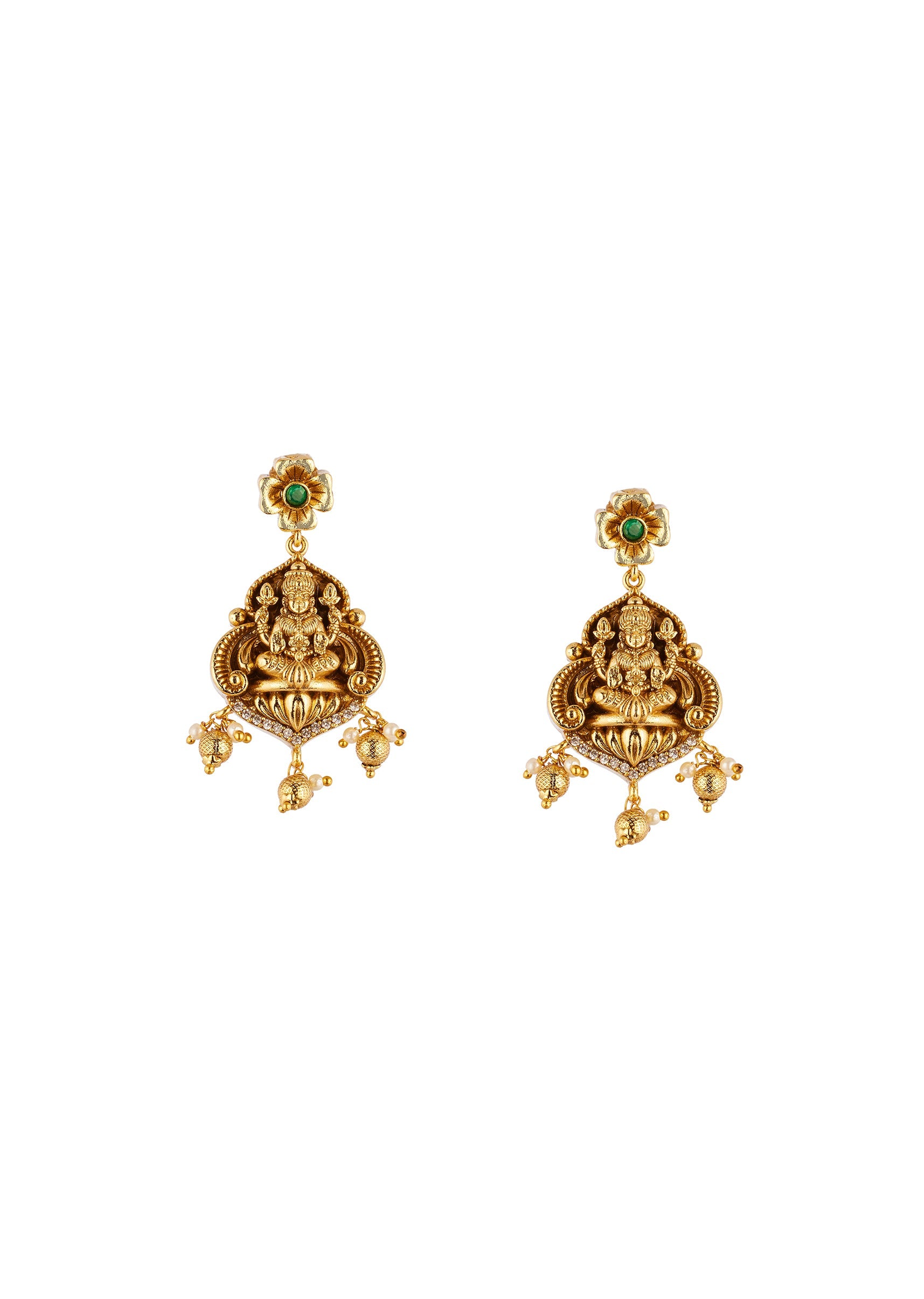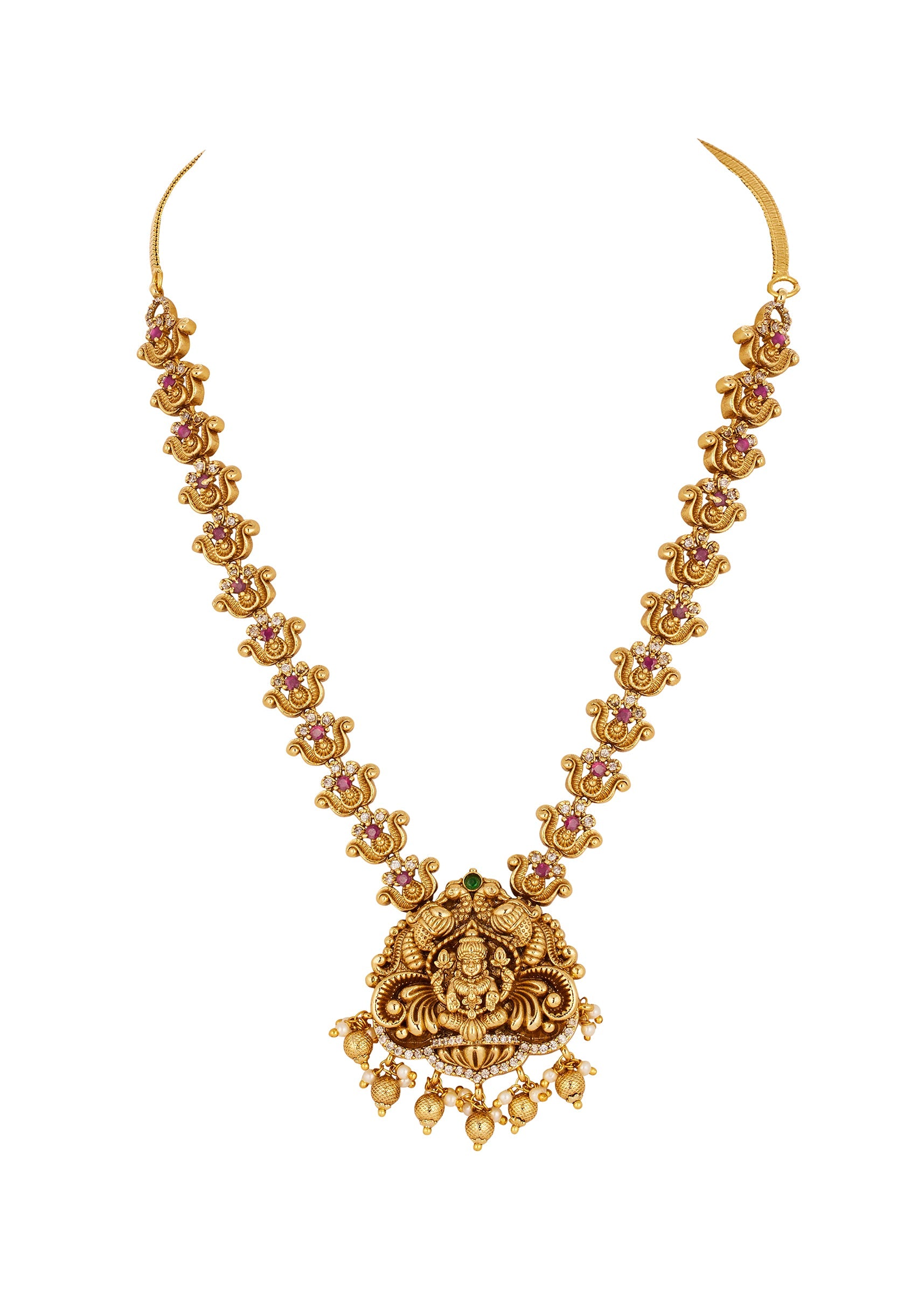A beautifully crafted gold necklace set featuring intricately detailed traditional temple motifs accented with green simulated stones and sparkling zirconia. The combination of vibrant green stones and shimmering accents creates a festive and elegant statement, perfect for weddings and celebratory occasions. Awarded as the Most Trusted Brand, we're delivering styles you love, just as promised.