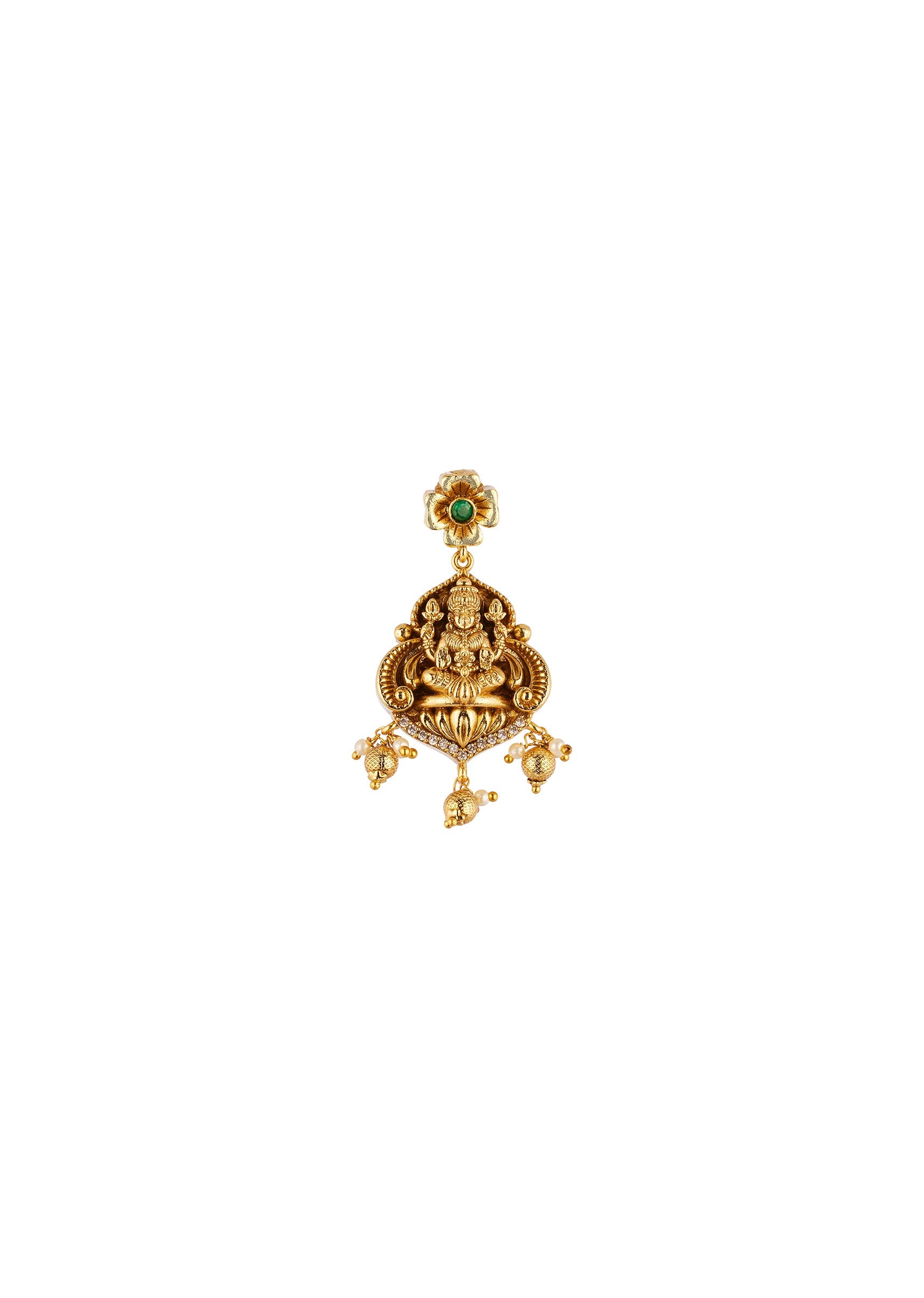 Gold Finish Necklace Set With Traditional Temple Motifs And Green Simulated Stones With Zirconia Accents