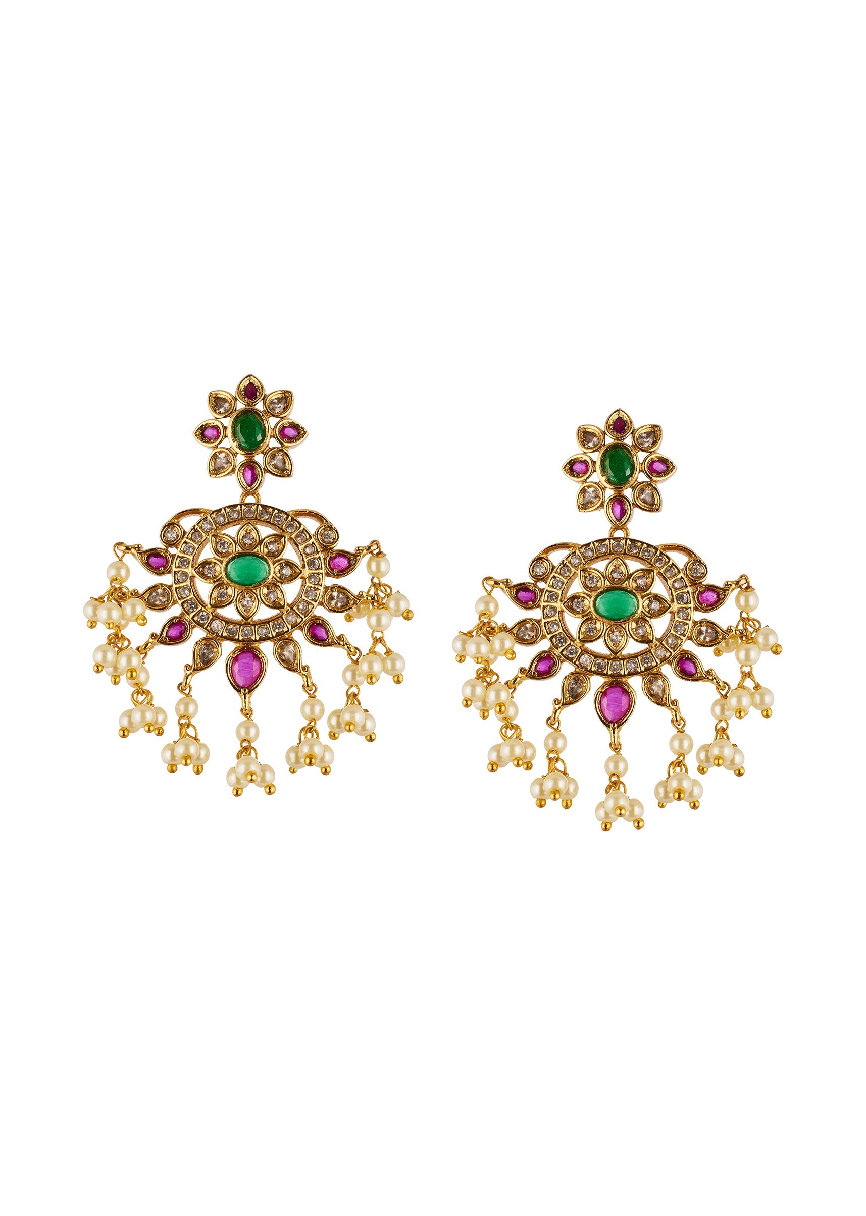A radiant gold necklace set featuring intricately detailed traditional temple motifs accented with pink, green, and off white simulated stones, sparkling zirconia, and delicate pearls. The combination of vibrant colours... More Product Details