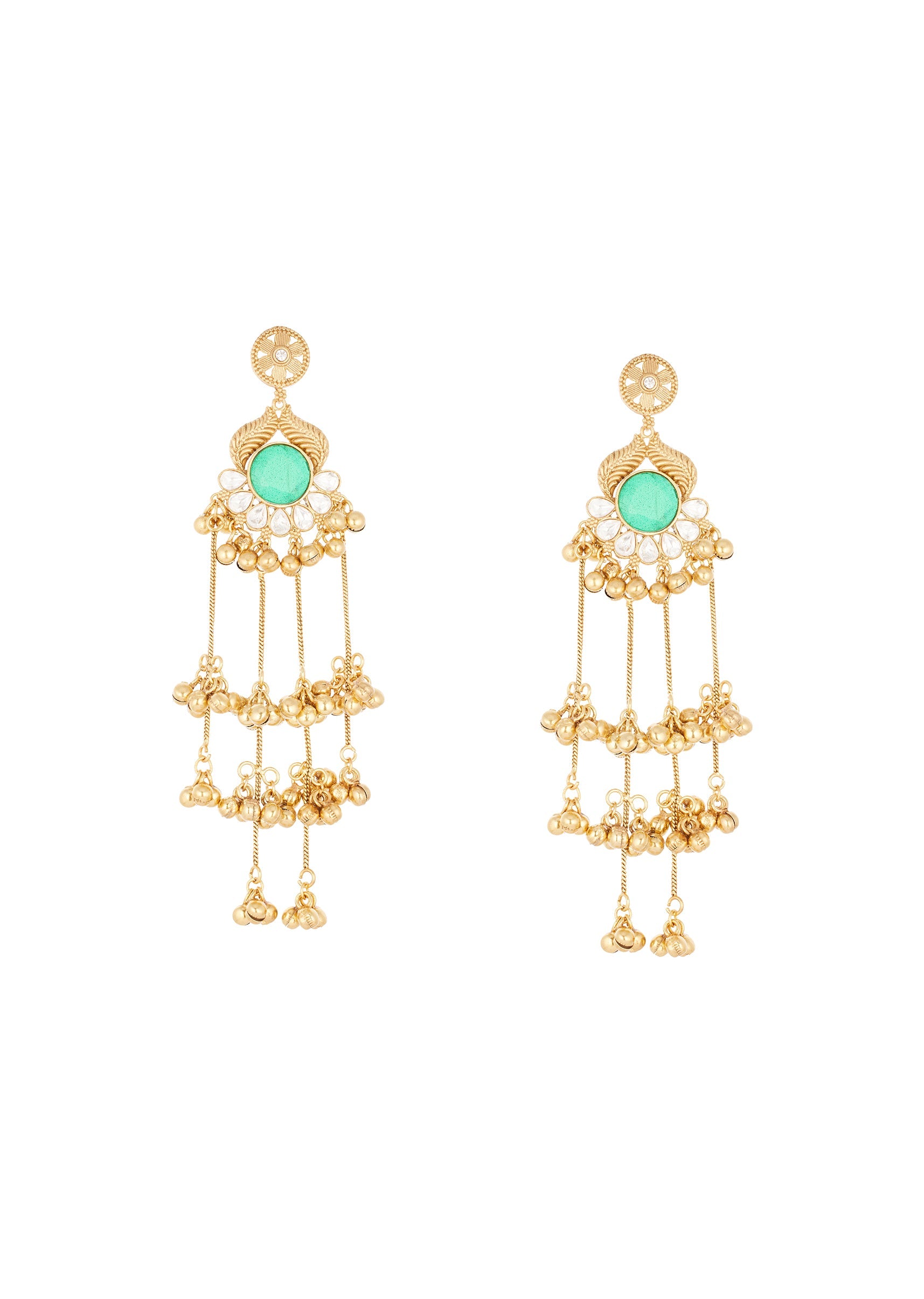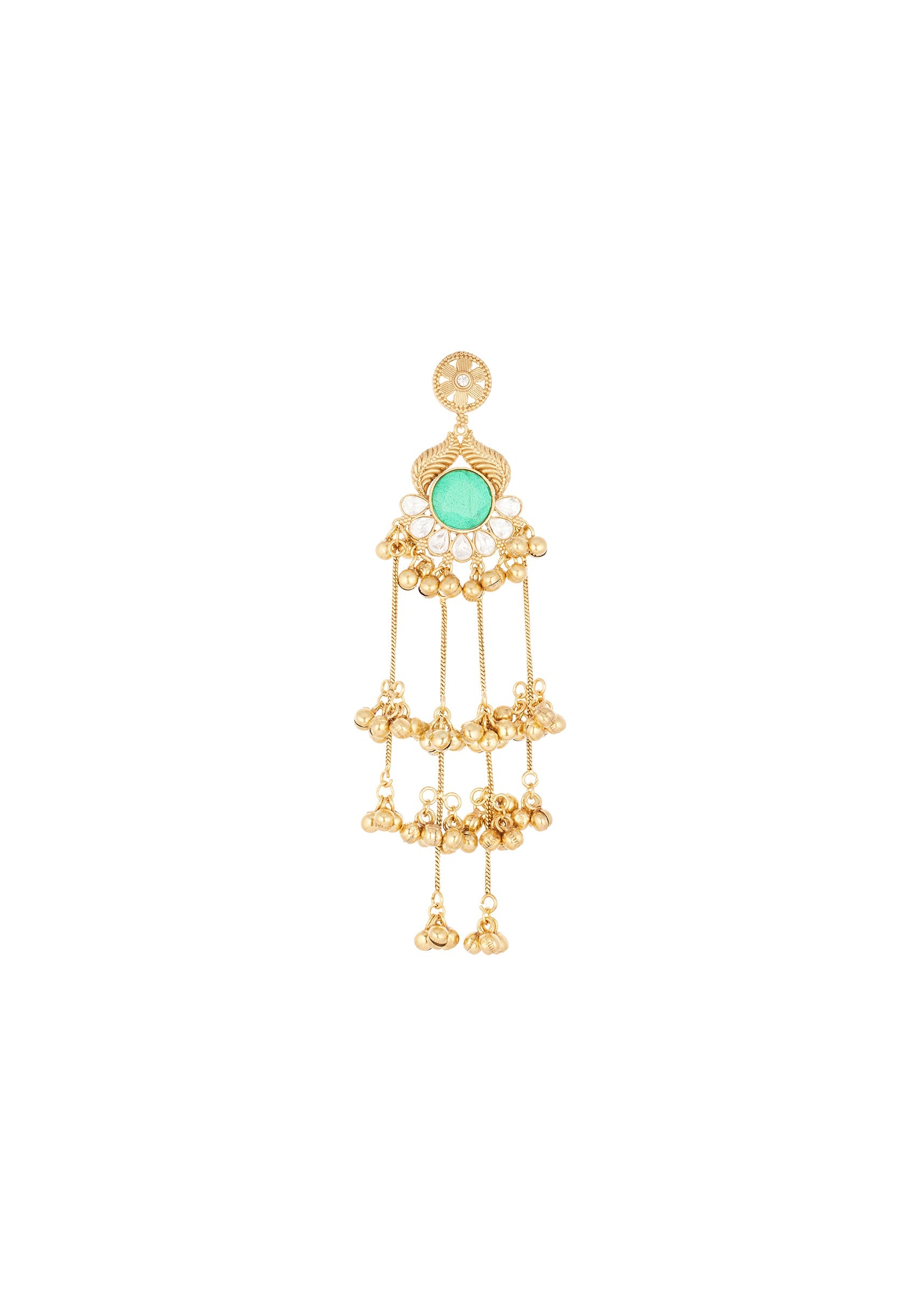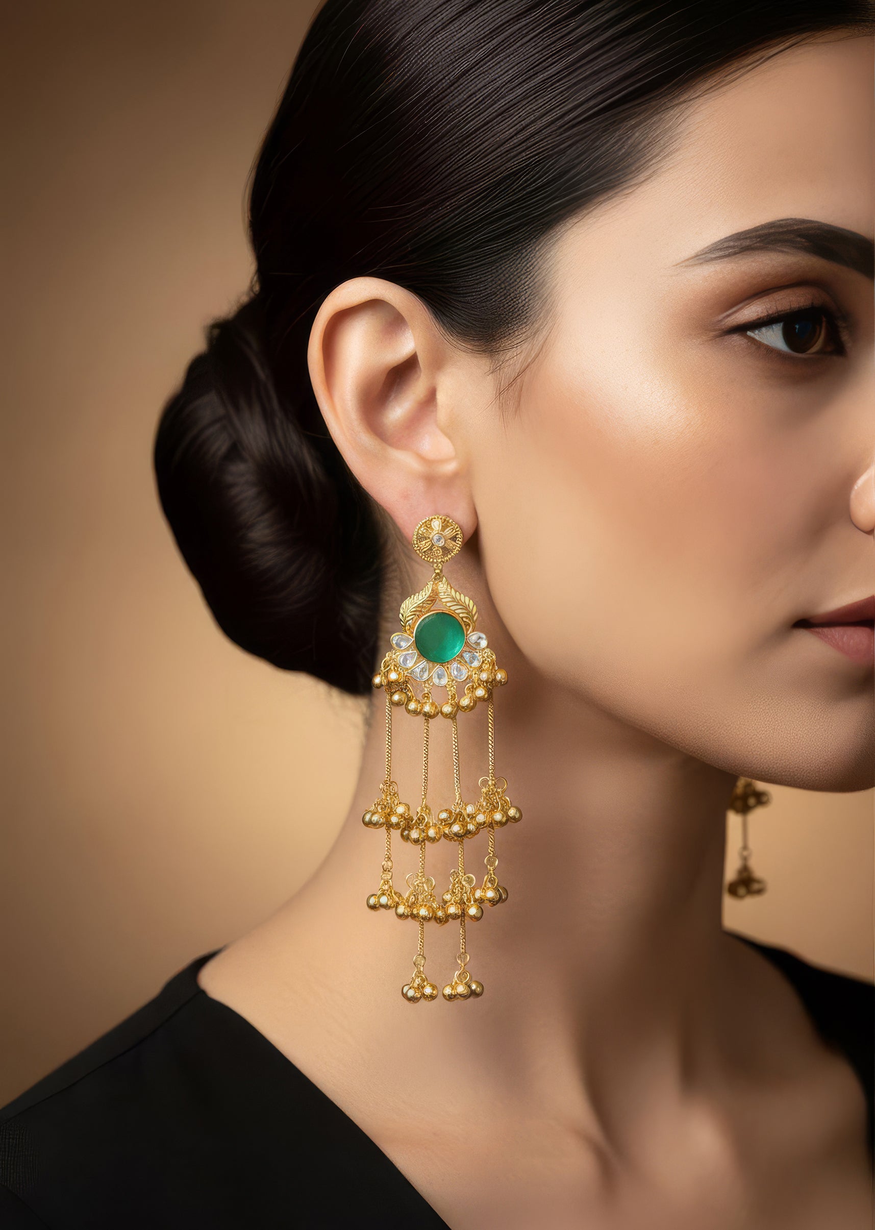 A striking handcrafted jhumka featuring a bold green centre stone surrounded by traditional gold detailing. Finished with cascading droplets and intricate Kundan inspired motifs, this piece adds regal charm to any festive or wedding look. Awarded as the Most Trusted Brand, we're delivering styles you love, just as promised.