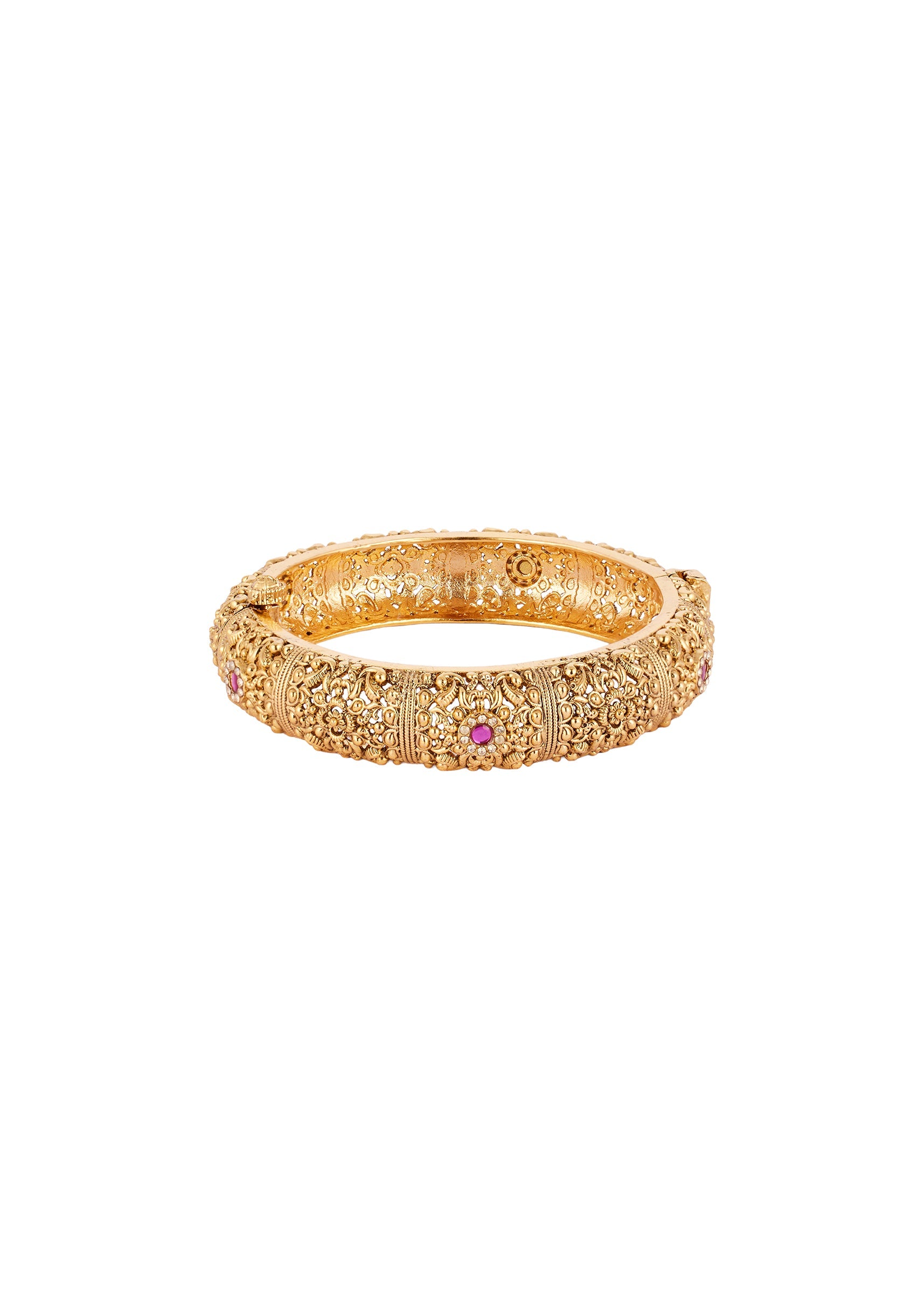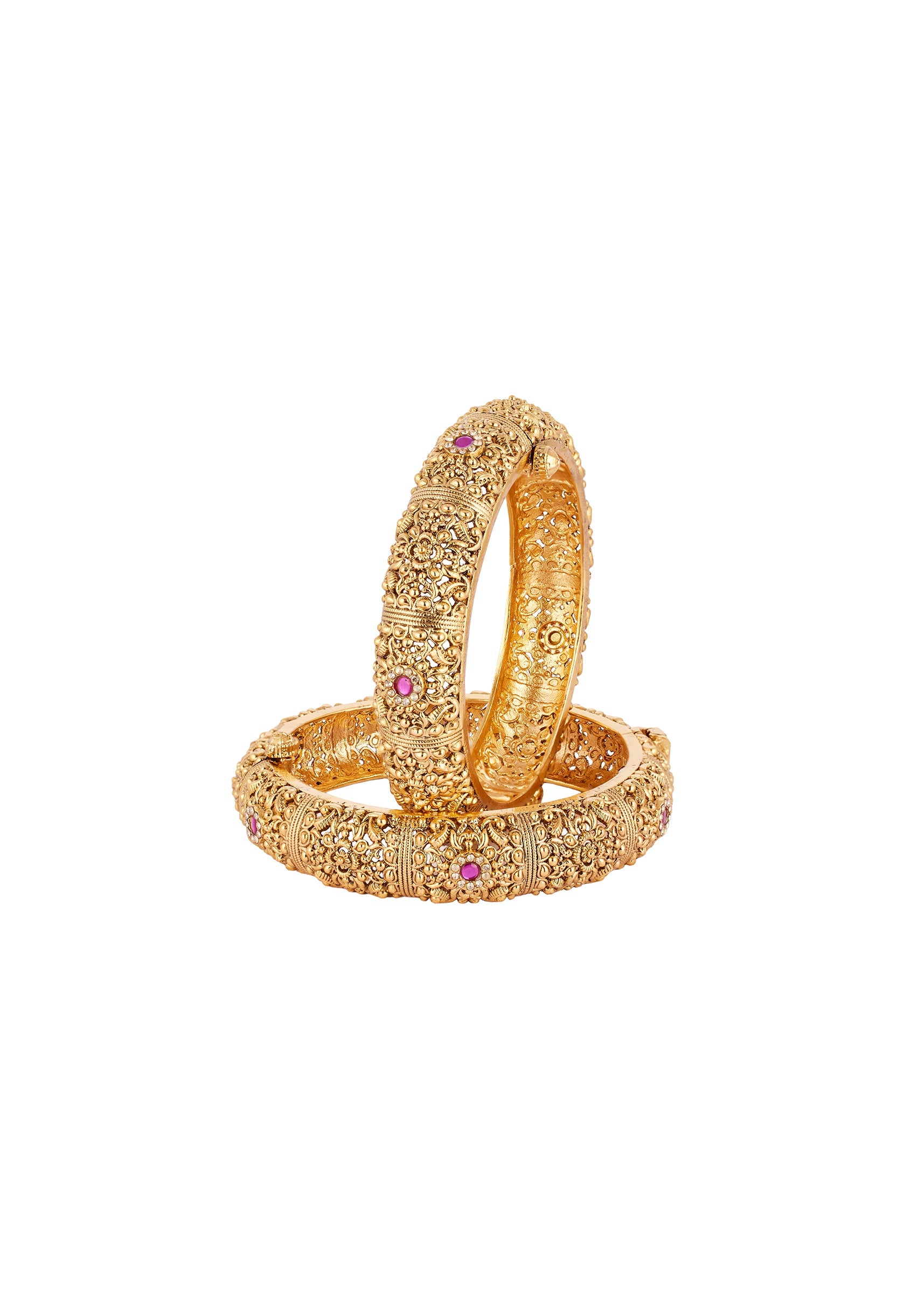 A pair of exquisite bangles in a radiant gold finish featuring traditional temple motifs accented with rani pink simulated stones and sparkling zirconia. The combination of vibrant pink stones and... More Product Details