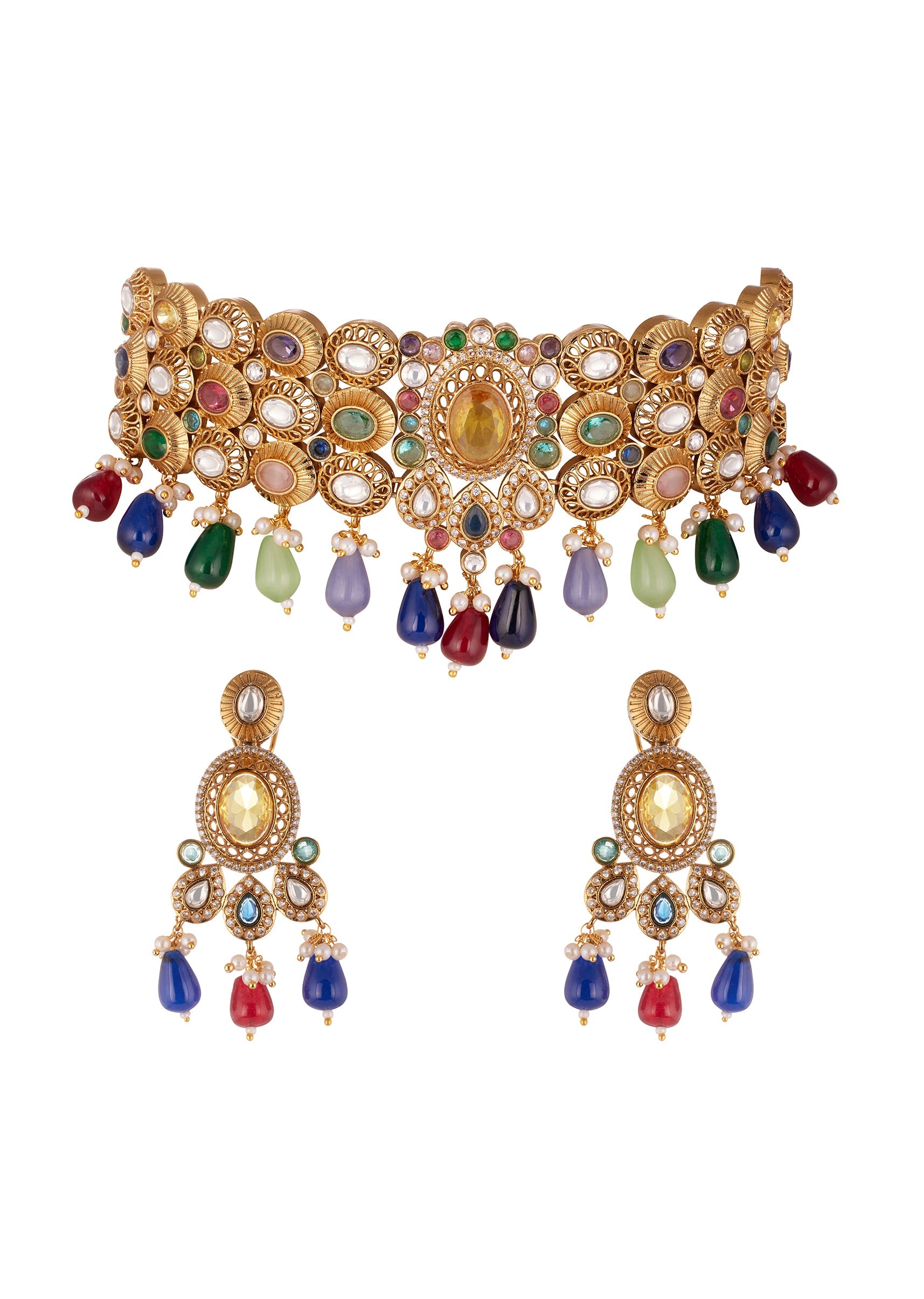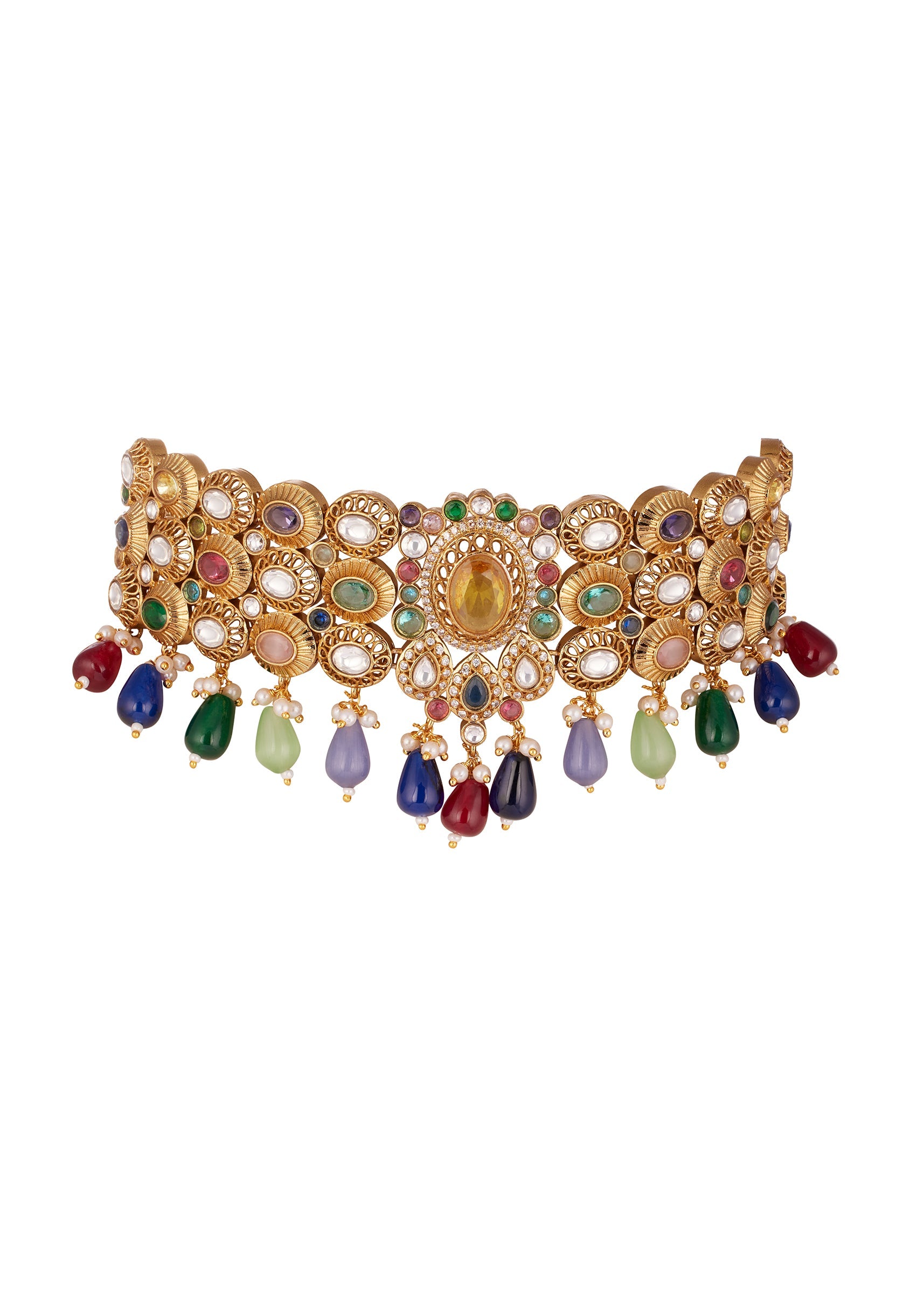 A stunning bridal choker crafted for haldi and mehendi ceremonies. The wide design features a vibrant navratna inspired arrangement with multi colored stones forming a festive and auspicious border. At... More Product Details