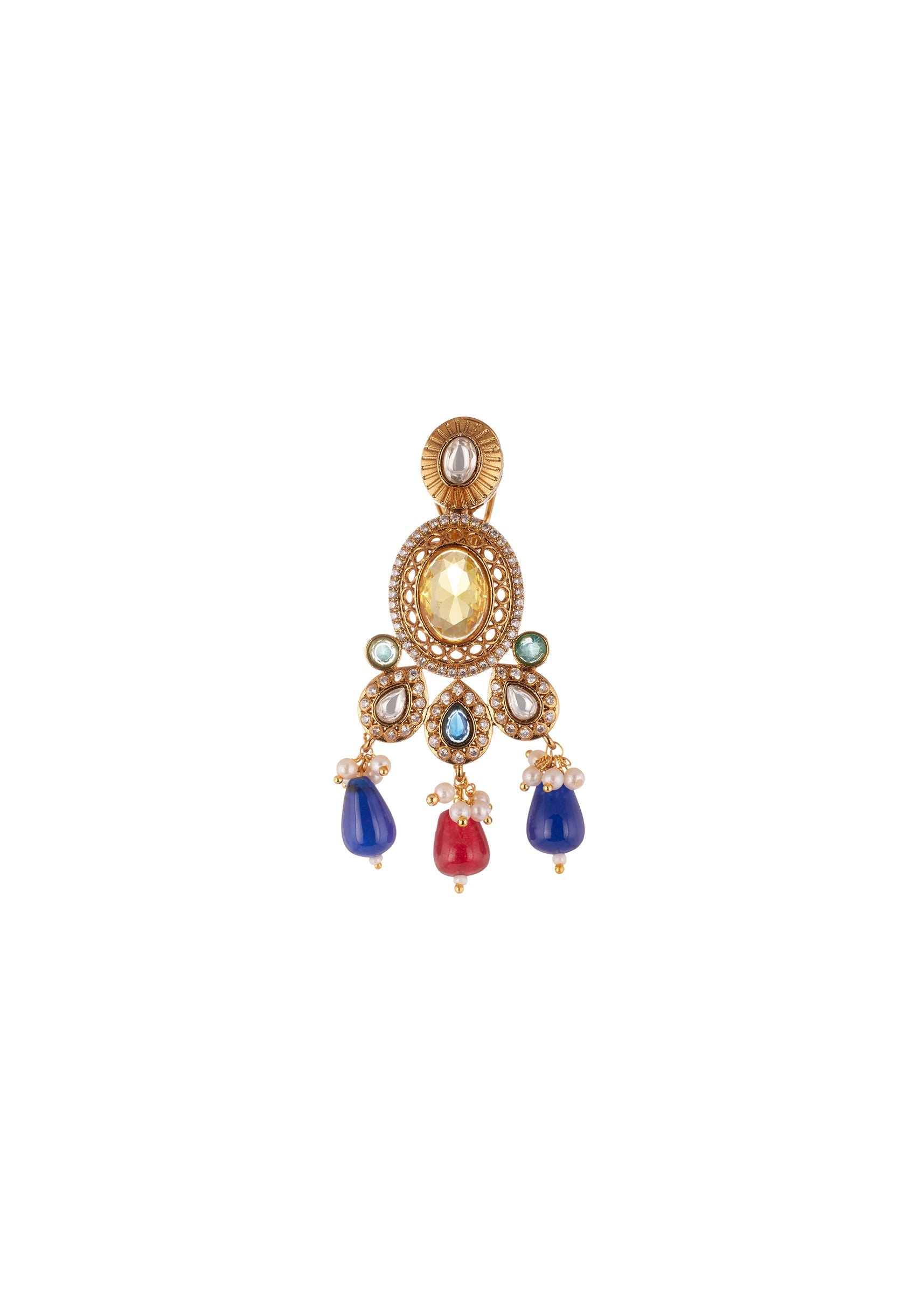 : Pair it with a yellow green or pastel lehenga to highlight the multi colored stones and the central yellow stone for a vibrant festive look.