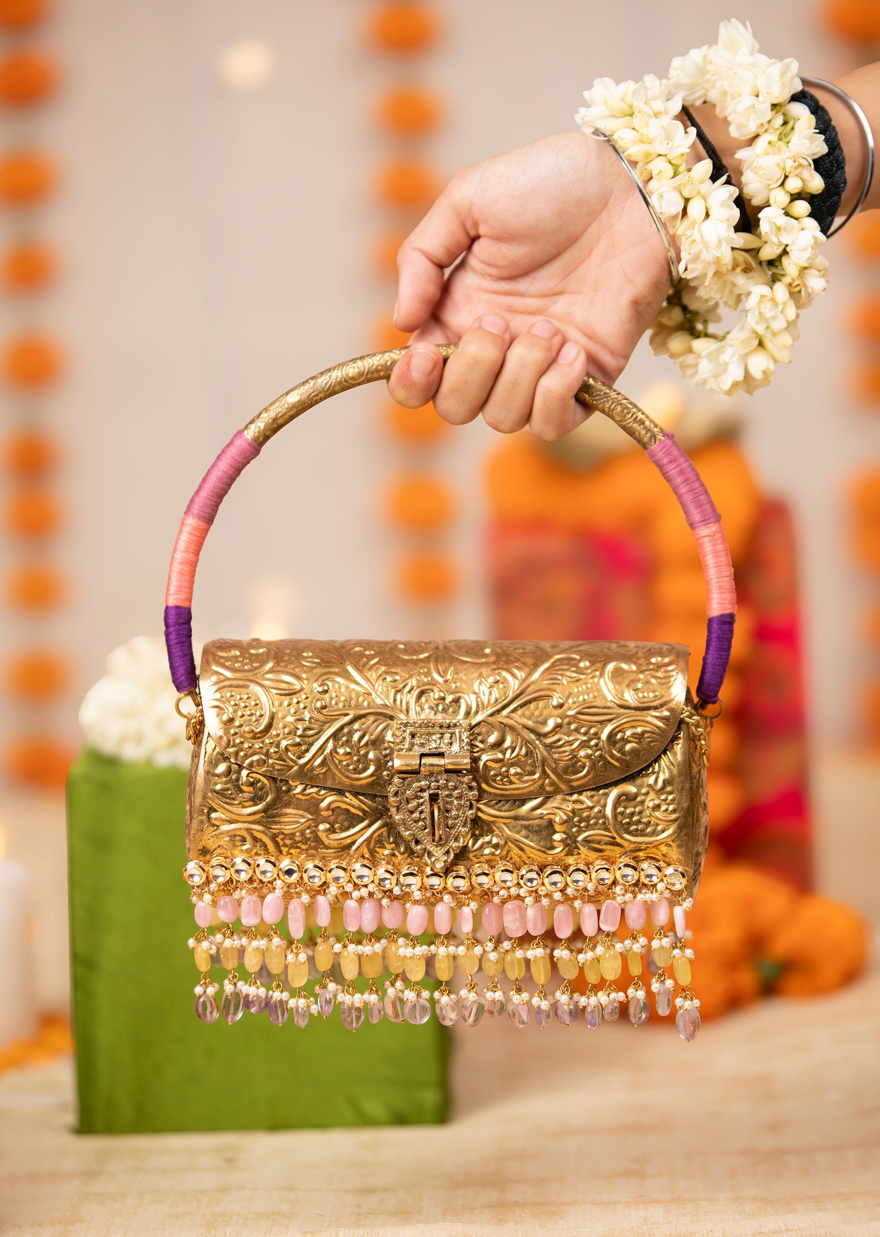 Intricate floral engravings give this gold metal bag a beautifully sculpted, heirloom inspired charm. The embellished finish and rich golden sheen make it ideal for weddings, festive nights, and elegant... More Product Details