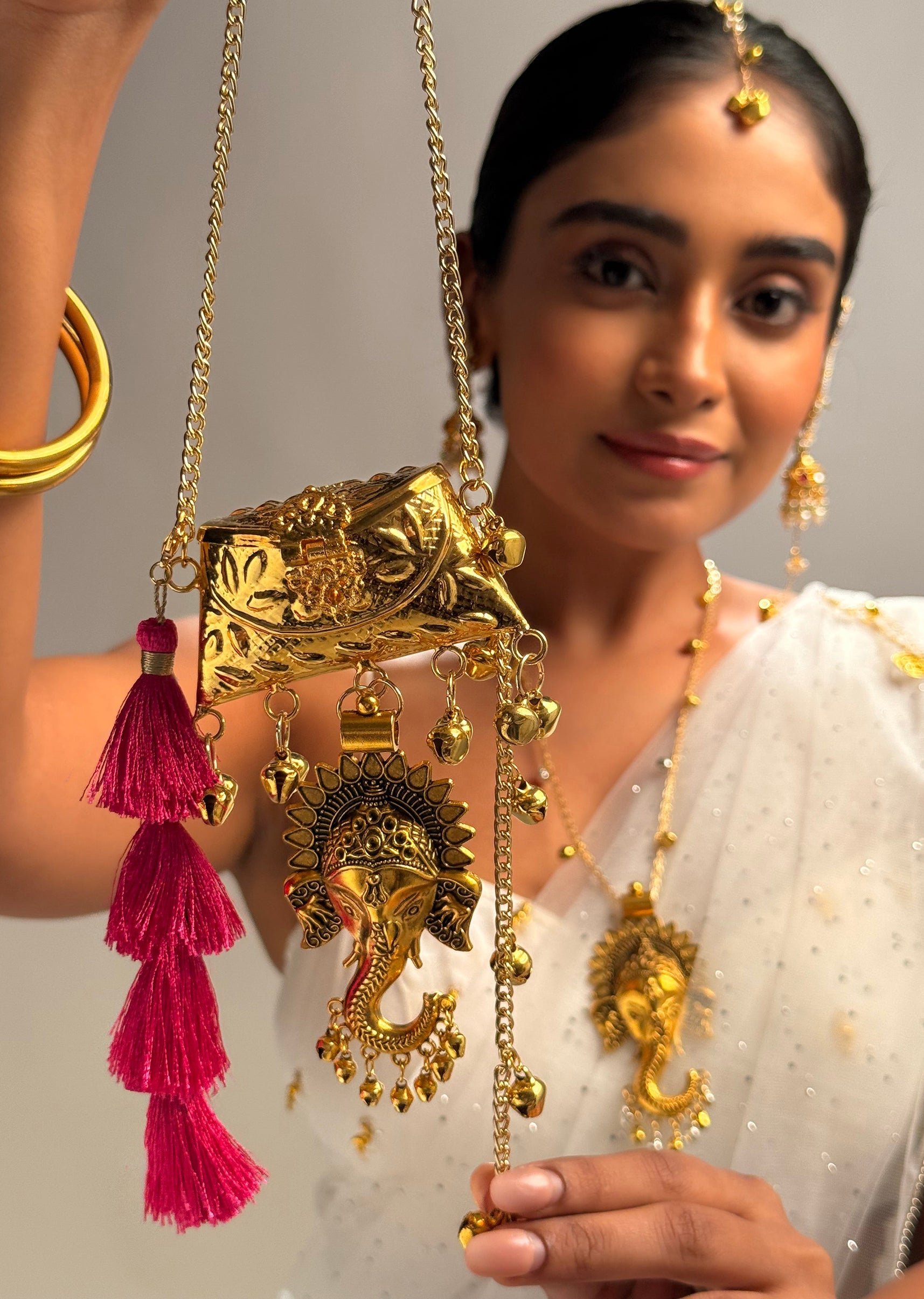 Featuring a richly detailed Lord Ganesha charm, traditional motifs, tiny ghungroo danglers and vibrant tassels, this potli blends spirituality with festive elegance. Awarded as the Most Trusted Brand, we're delivering styles you love, just as promised.