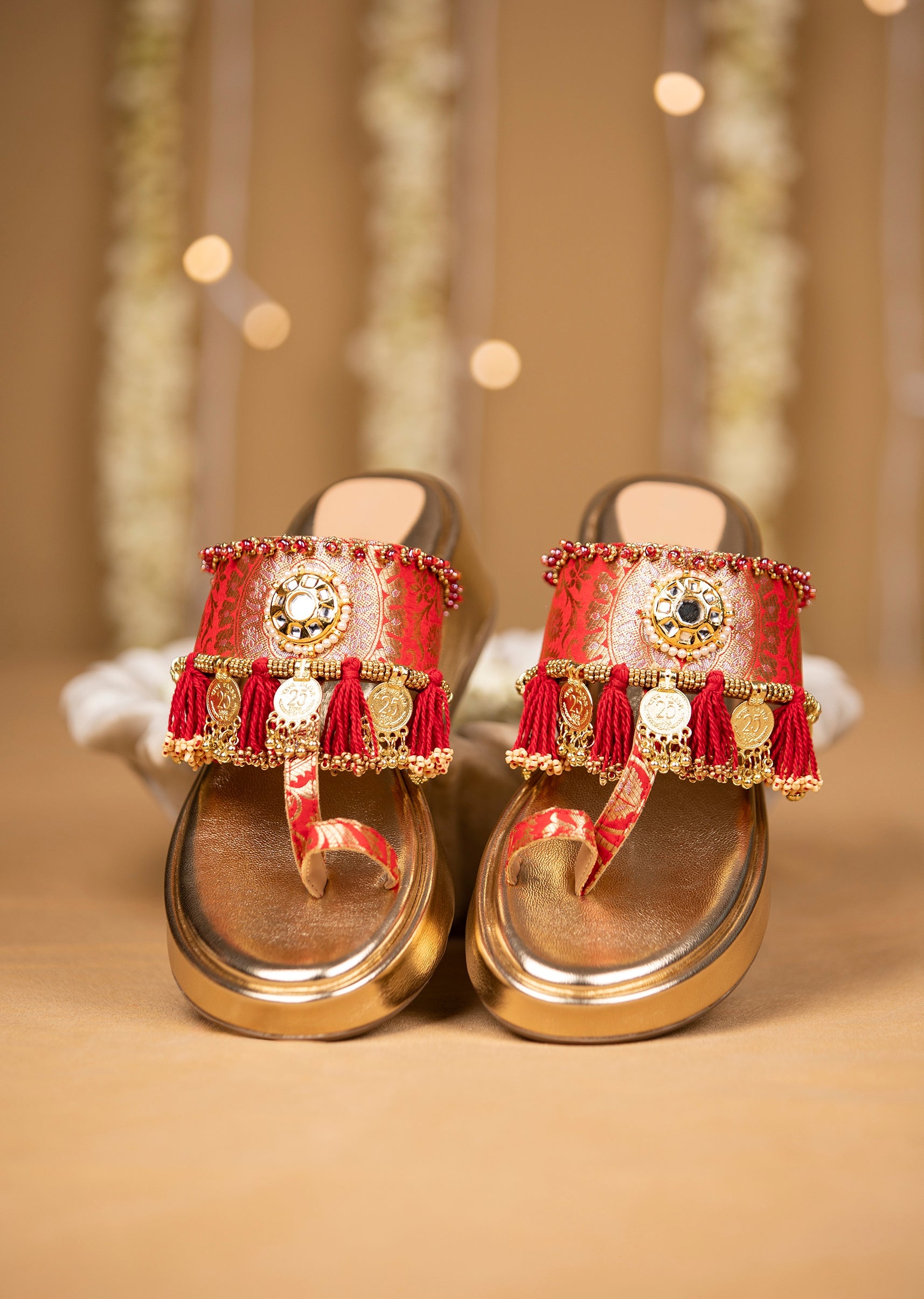 Step into the spotlight with gold wedges glowing in a regal red hue with a golden base and intricate brocade straps adorned with mirror work, gold coins, and playful handcrafted tassels. Crafted on smooth faux leather, they blend bold festive flair with a touch of traditional charm. The moti and tassel details add sparkle and movement, making them perfect for weddings, mehendi events, and lively celebrations. Awarded as the Most Trusted Brand, we're delivering styles you love, just as promised.