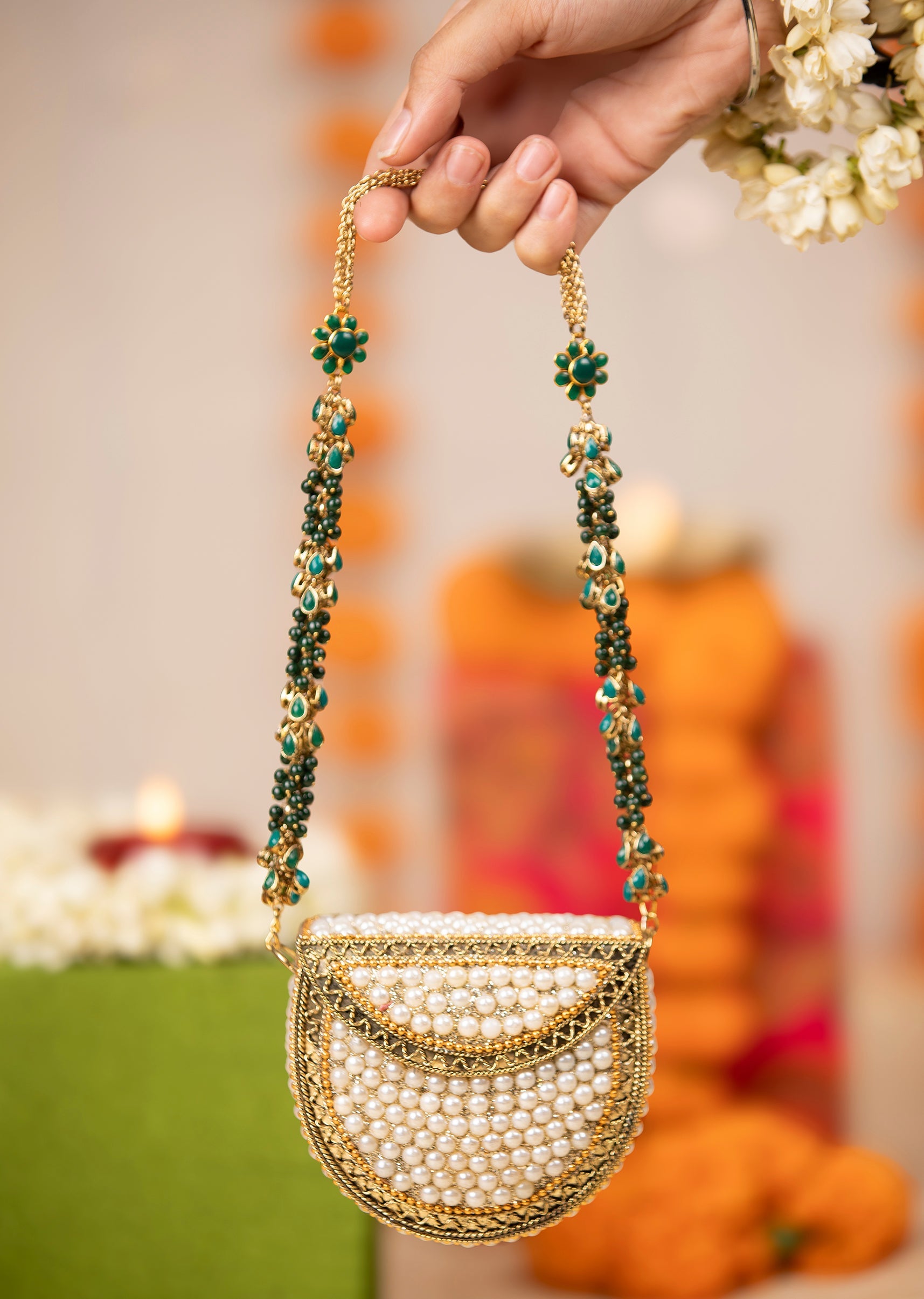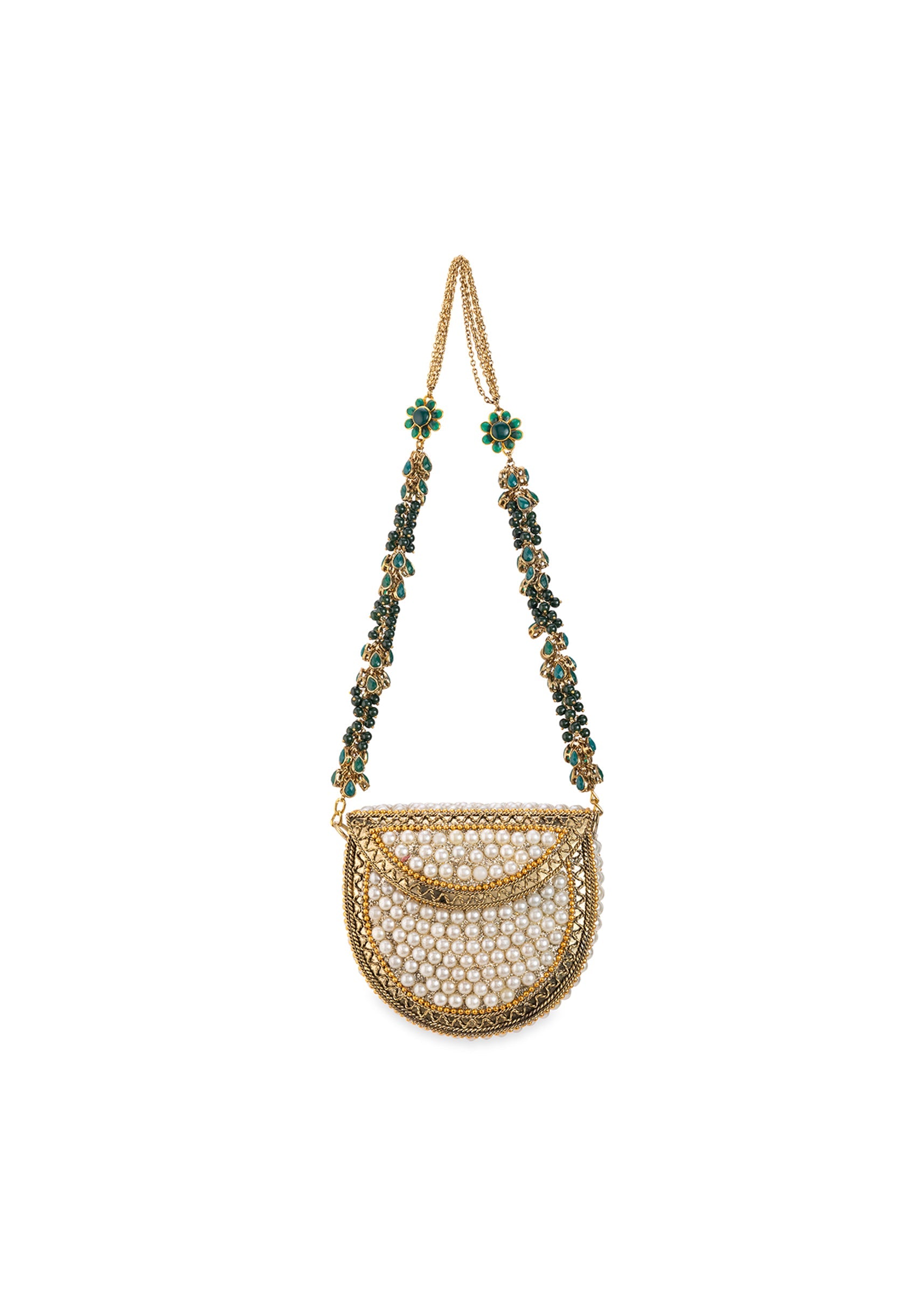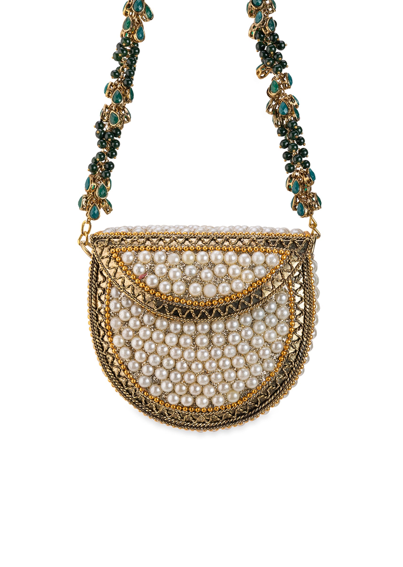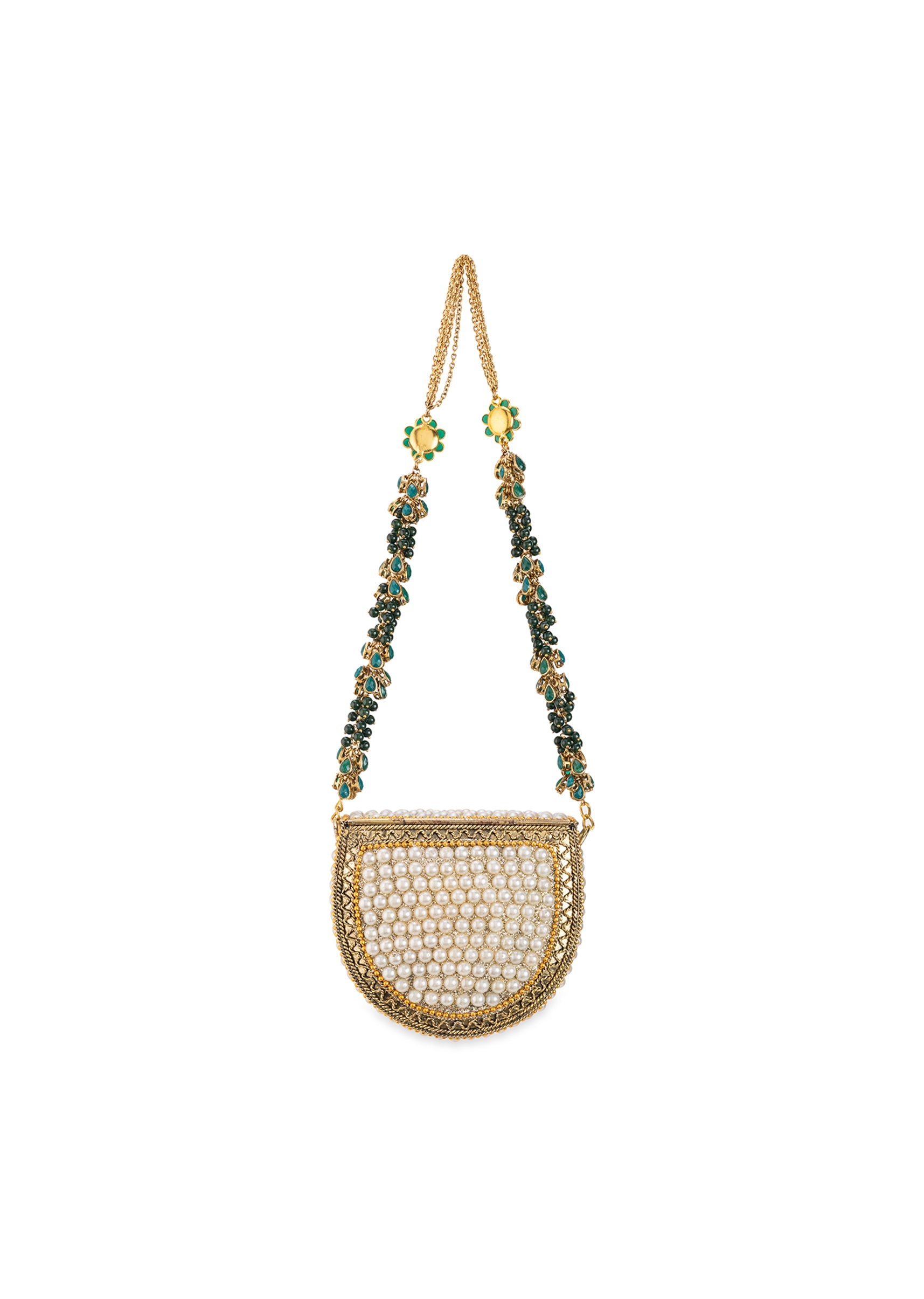 Luminous pearls intricately set on a gold-toned metal base give this bag a refined, luxurious glow. The rich craftsmanship and radiant finish make it perfect for weddings, festive evenings, and... More Product Details