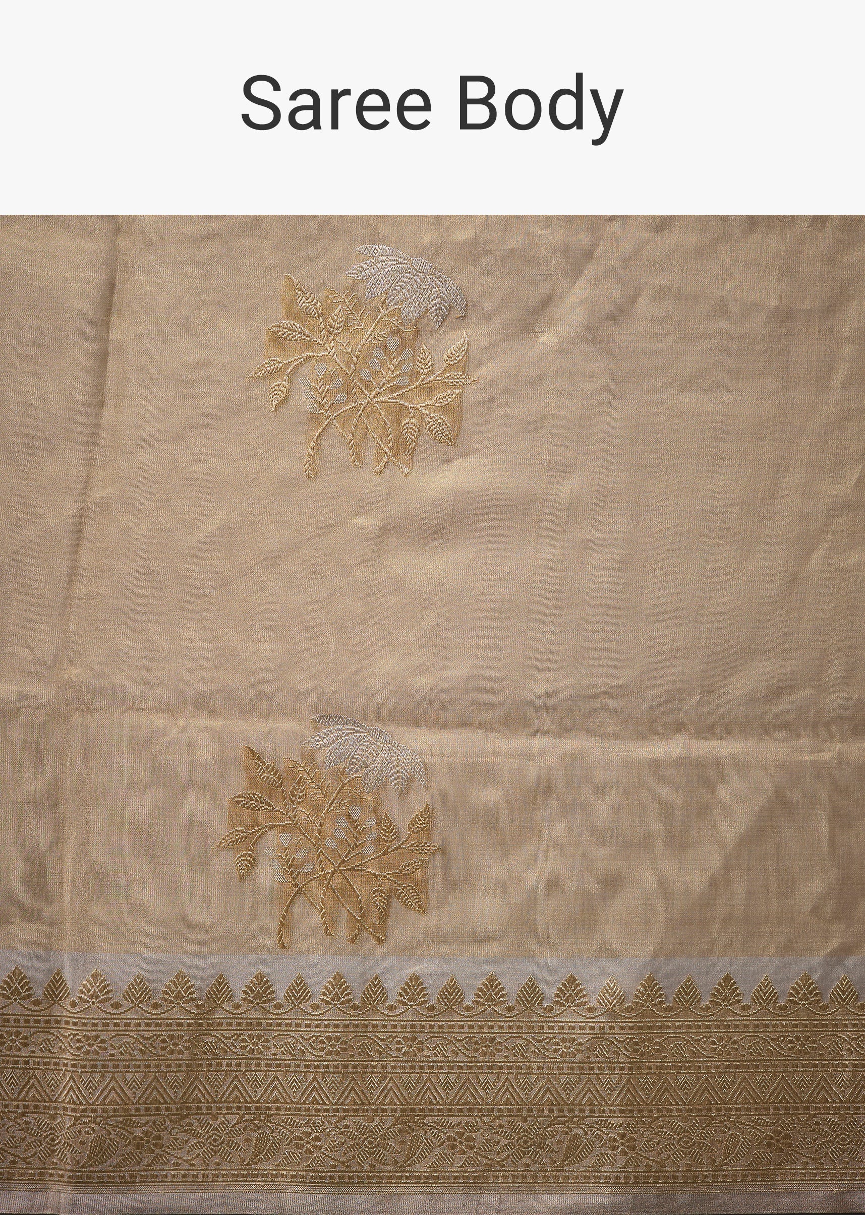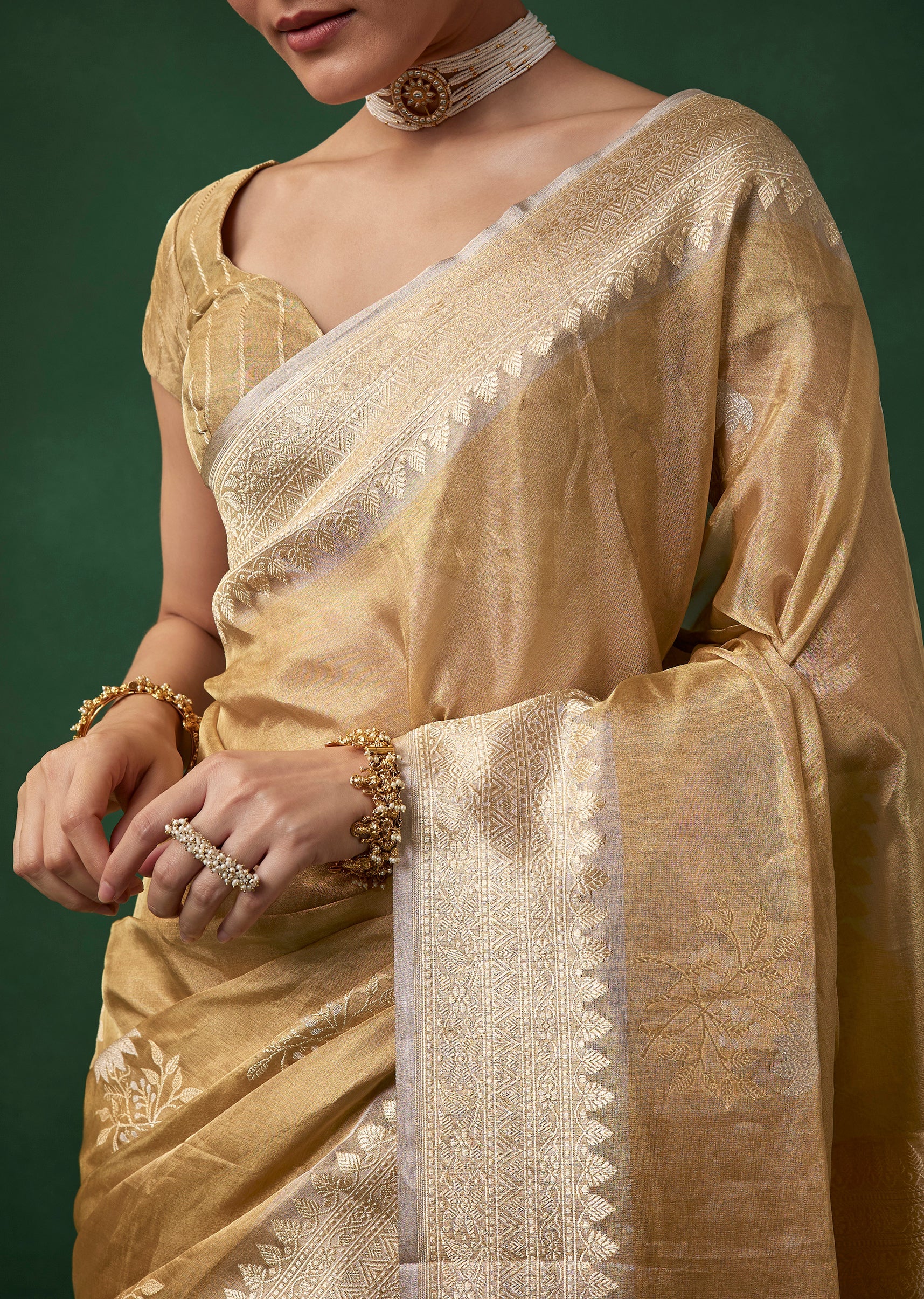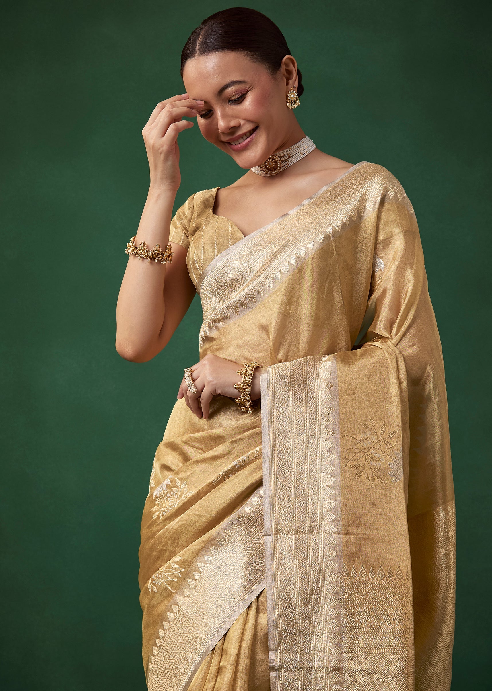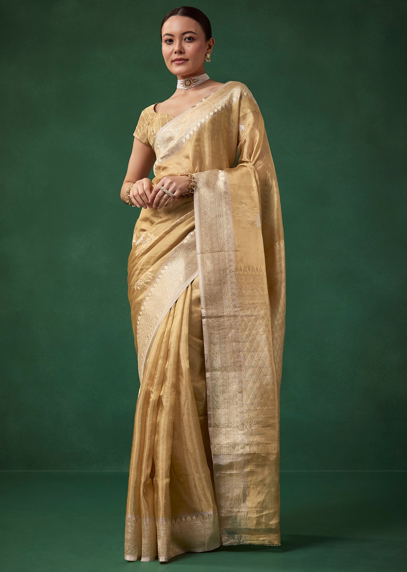 Understated luxury defines this tissue silk saree, beautifully crafted in a warm beige gold tone and woven with a blend of silver and golden zari that adds a soft radiant sheen. The delicate butti detailing and refined border enhance its classic charm, making it a graceful choice for weddings, festive occasions, and sophisticated celebrations. The set includes one saree and one unstitched blouse fabric, allowing for timeless personalized styling. Awarded as the Most Trusted Brand, we're delivering styles you love, just as promised.