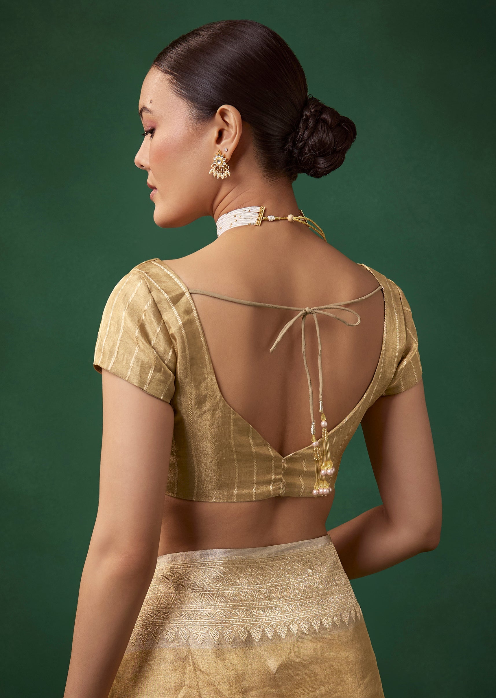 Fit Tips:Keep the pleats smooth for an elegant fall and choose a structured blouse to balance the saree’s delicate sheen and subtle butti work.