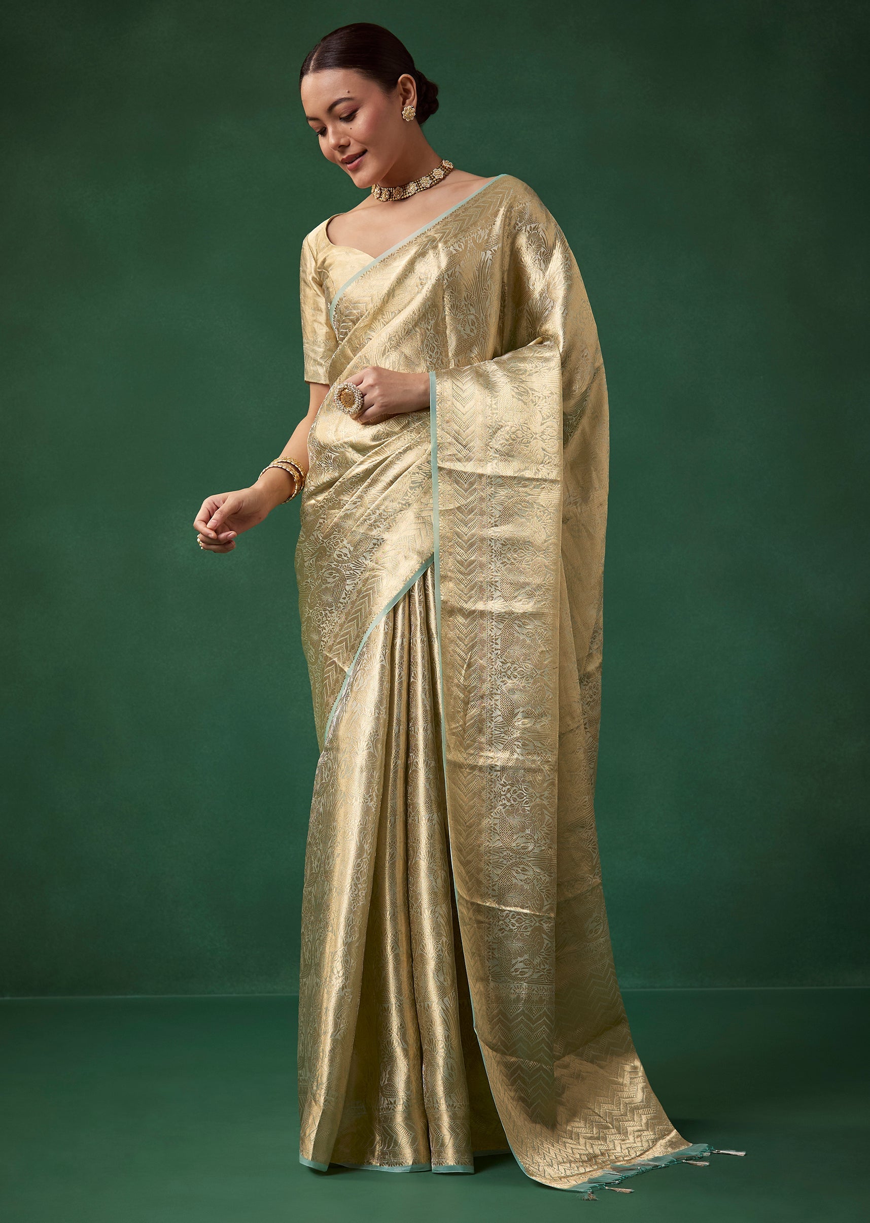 A radiant blend of tradition and contemporary charm, this tissue silk saree shines in gold with a soft touch of seafoam green woven through its delicate jaal and floral jacquard... More Product Details