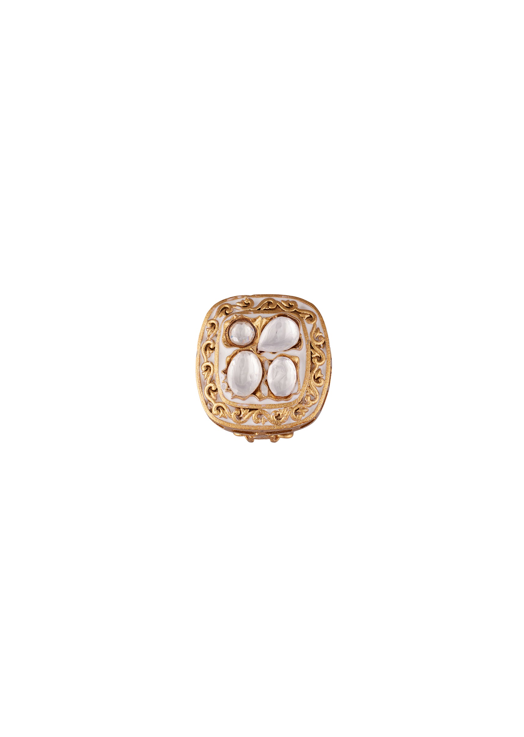 A gold toned square stud earring featuring white enamel paired with ornate gold filigree detailing. The centre is set with four clear stones in varied shapes arranged in a traditional Kundan style setting that gives the appearance of uncut polki inspired brilliance. Handcrafted with precision this elegant pair brings a classic yet modern appeal perfect for festive gatherings wedding celebrations and evening functions. Awarded as the Most Trusted Brand, we're delivering styles you love, just as promised.