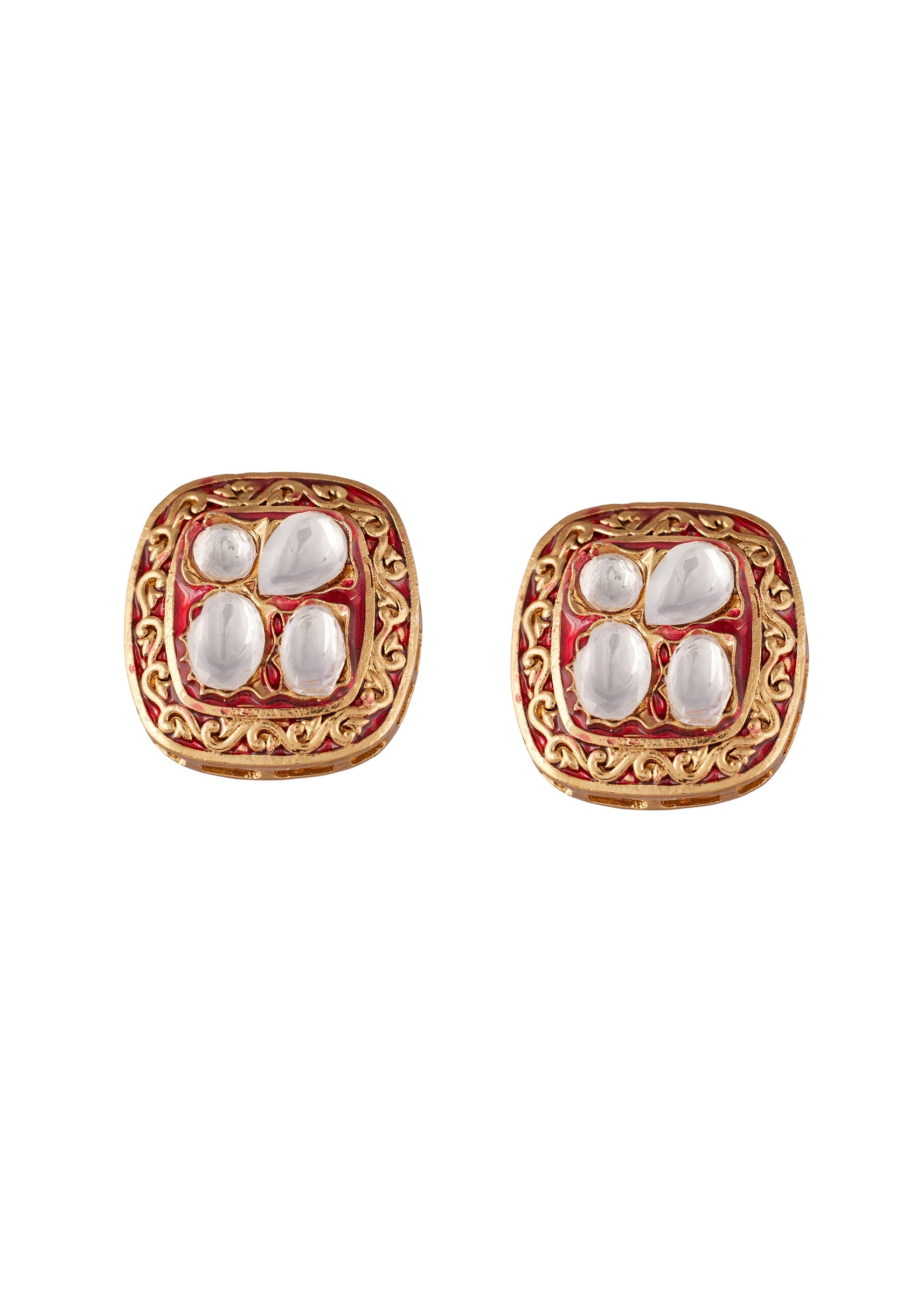 A gold toned square stud earring featuring rich red enamel and ornate border work. The centre is set with four clear stones arranged in a traditional Kundan style setting... More Product Details