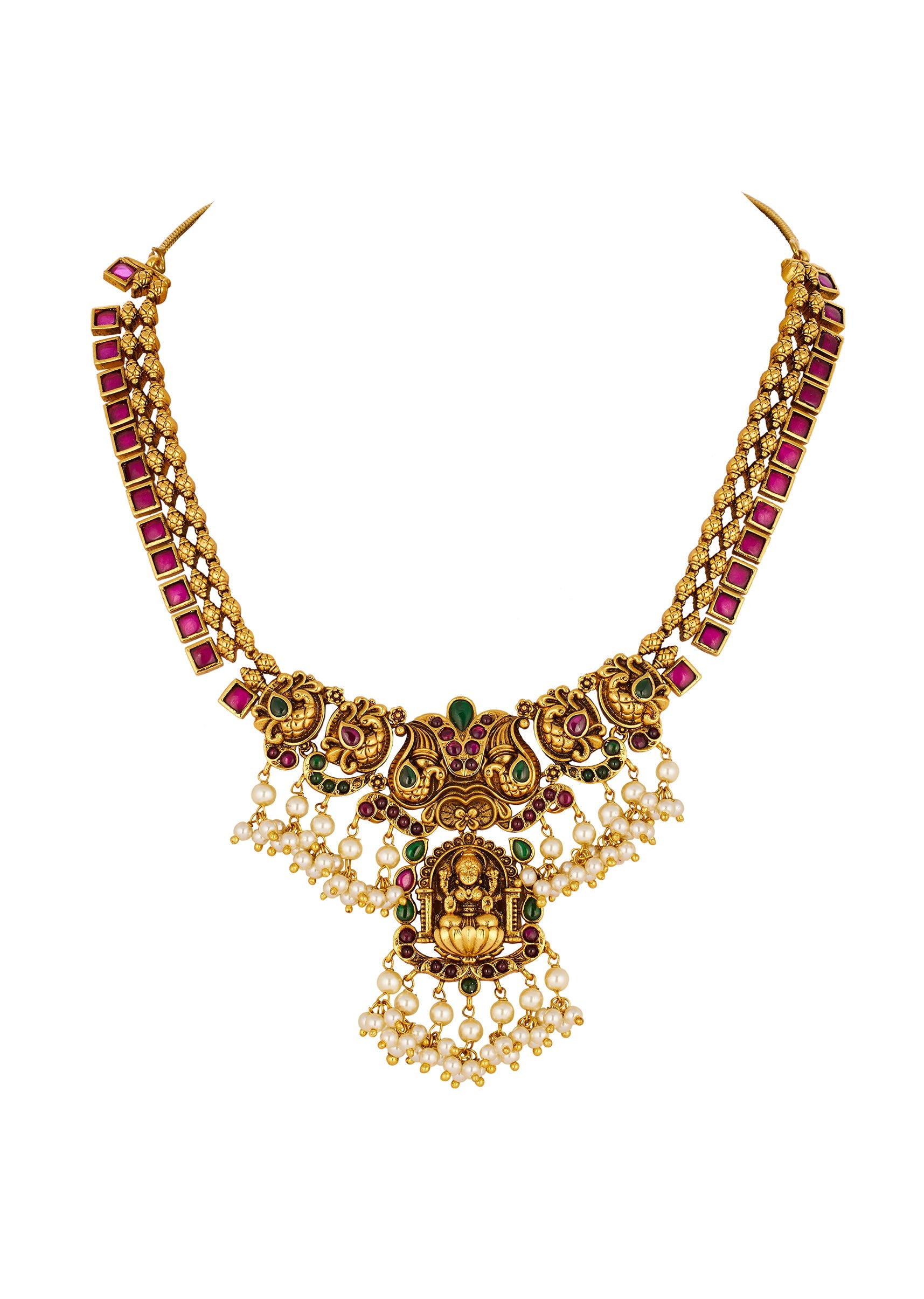 Gold Toned Necklace Set With Temple Style Motifs And Green Pink and Off White Simulated Stones