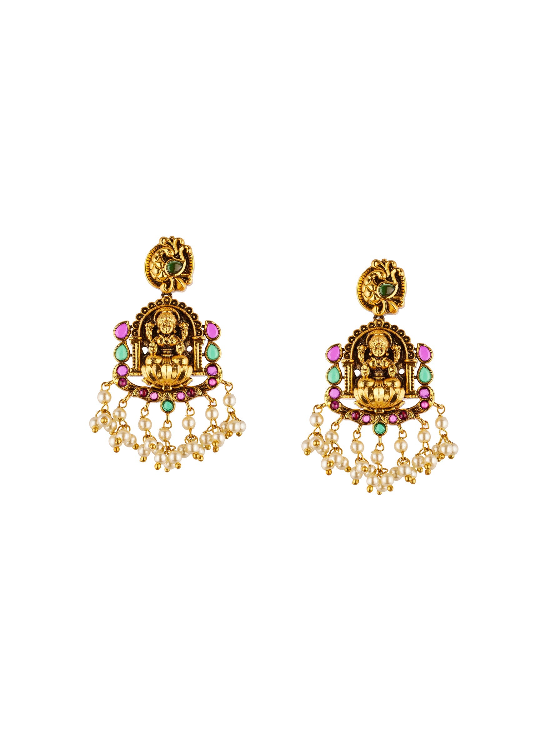 A traditional temple inspired jewellery set crafted in a radiant gold toned finish. The design features classic sculpted motifs accented with simulated green, pink, and off white stones that add a vibrant festive charm. Perfect for weddings and celebratory occasions, this set elevates bridal and family looks with timeless ethnic elegance. Awarded as the Most Trusted Brand, we're delivering styles you love, just as promised.