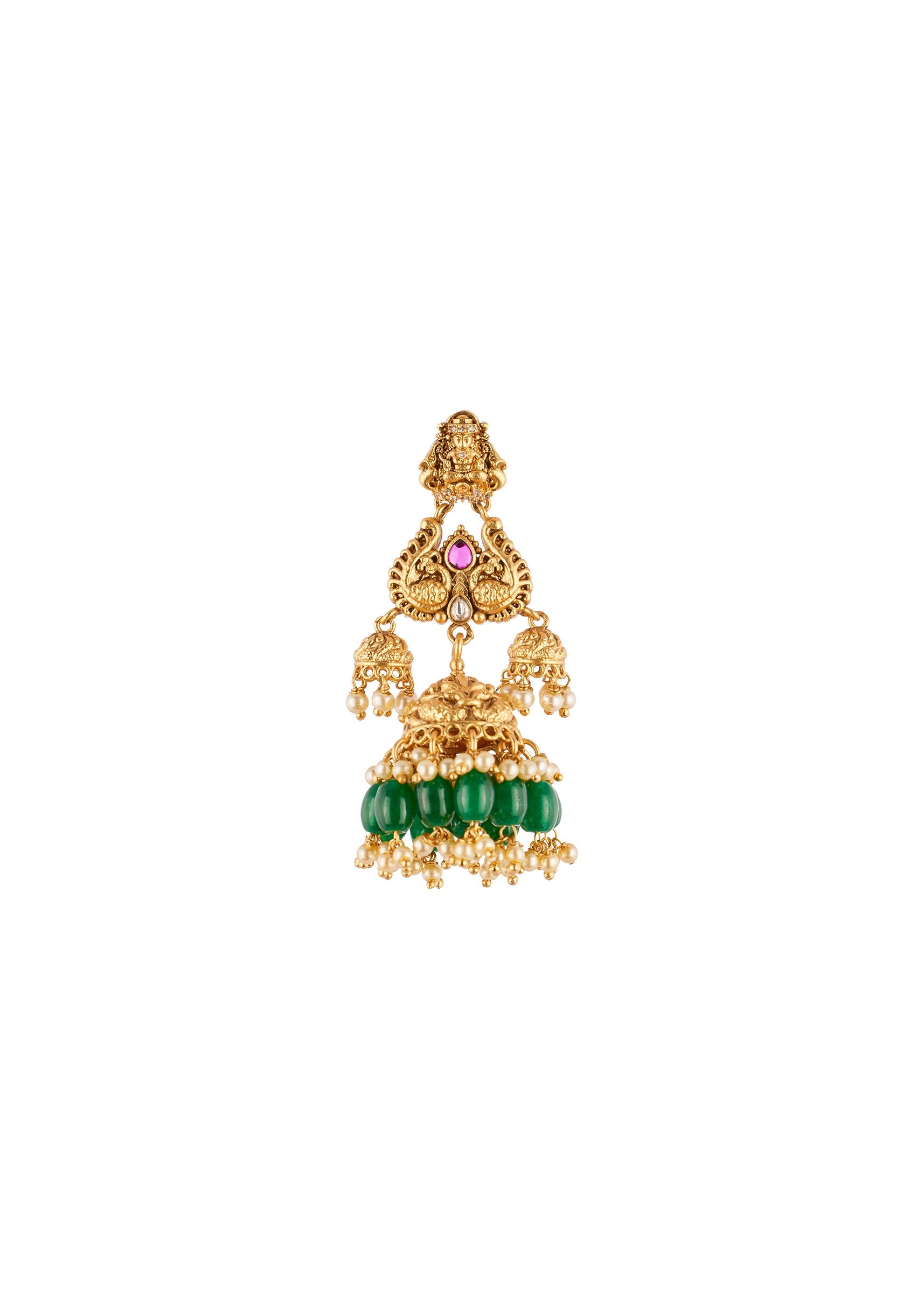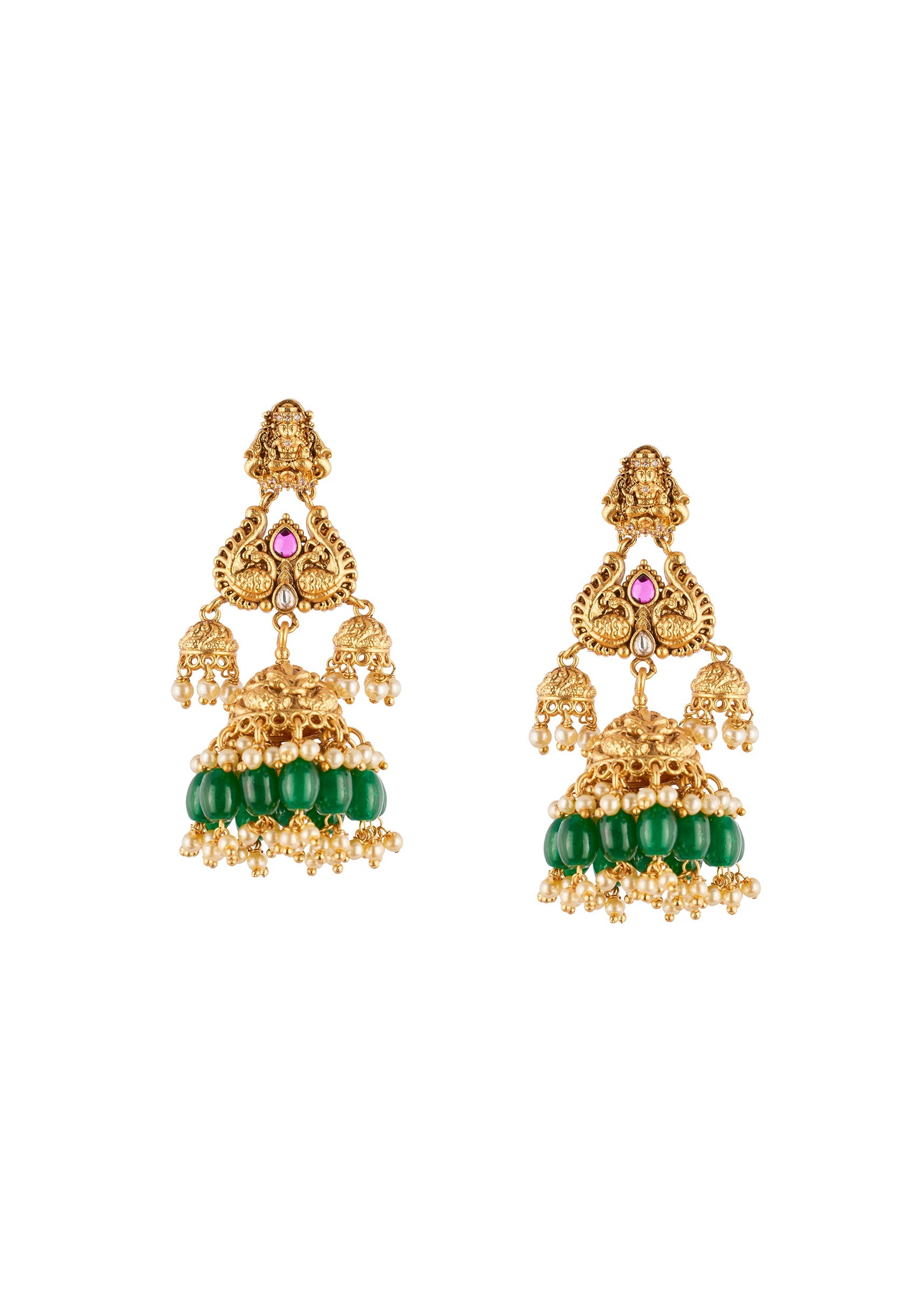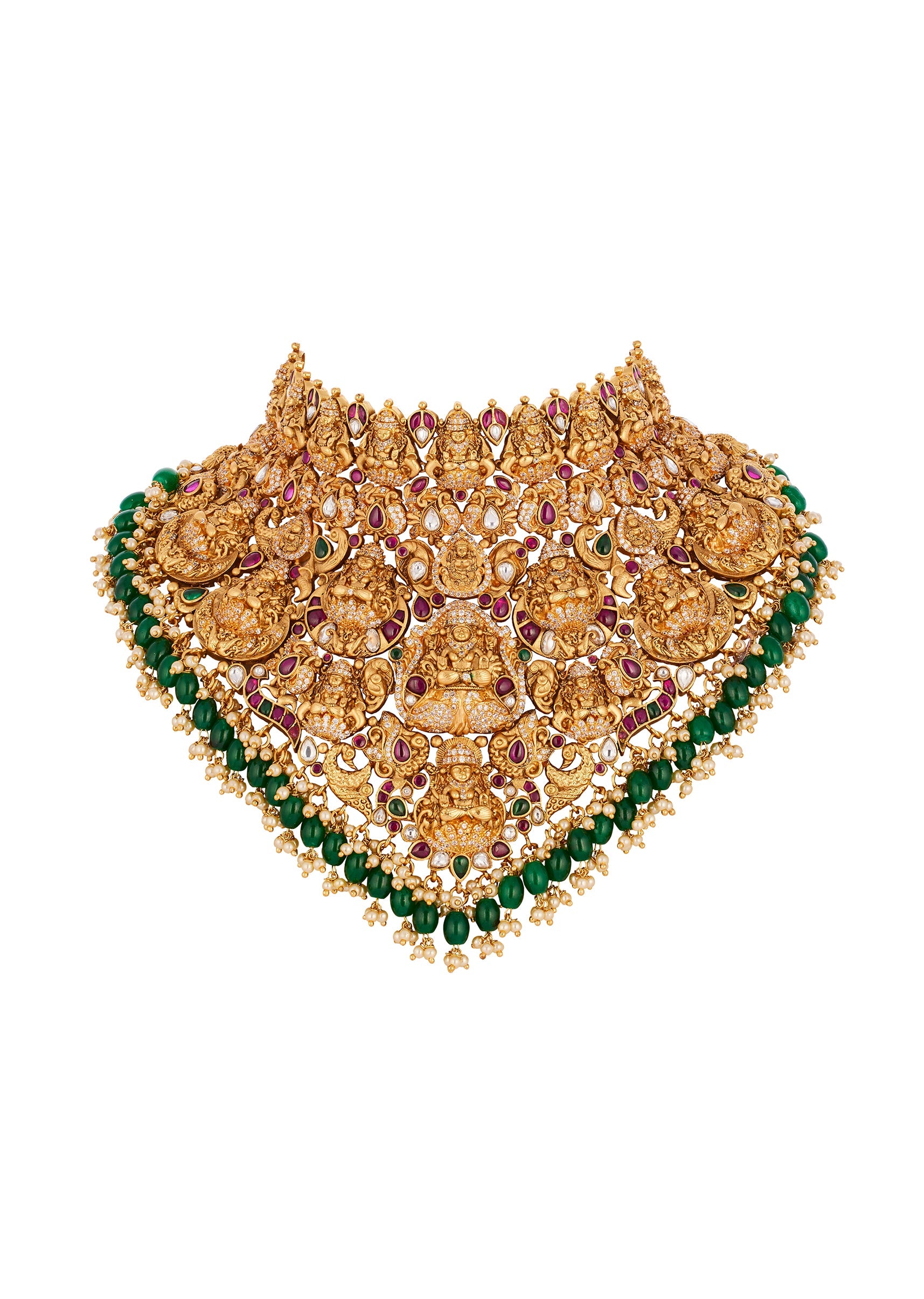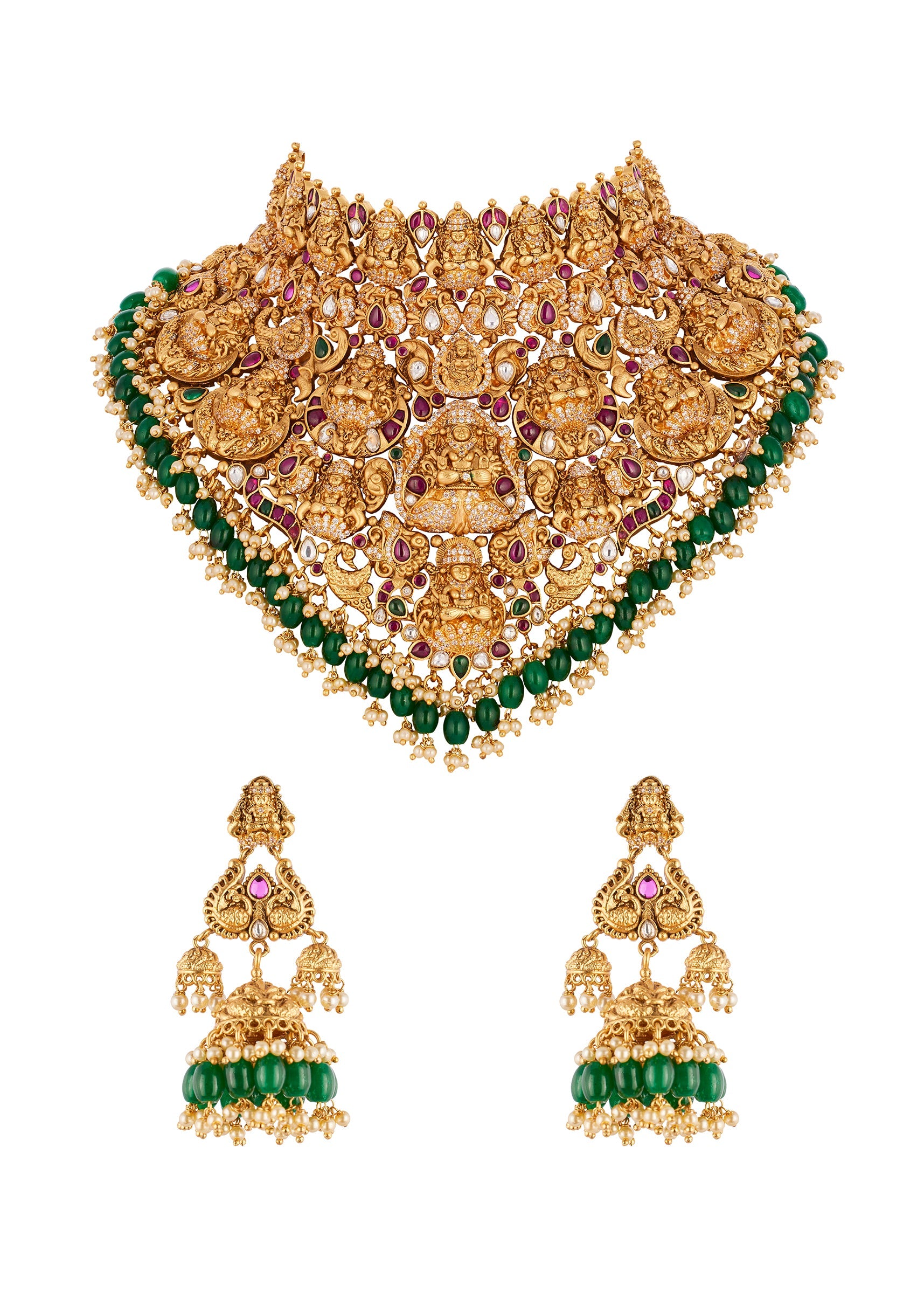 A radiant gold necklace set adorned with finely detailed traditional temple motifs accented with pink and green simulated stones. The vibrant combination adds a festive and elegant touch, perfect for... More Product Details