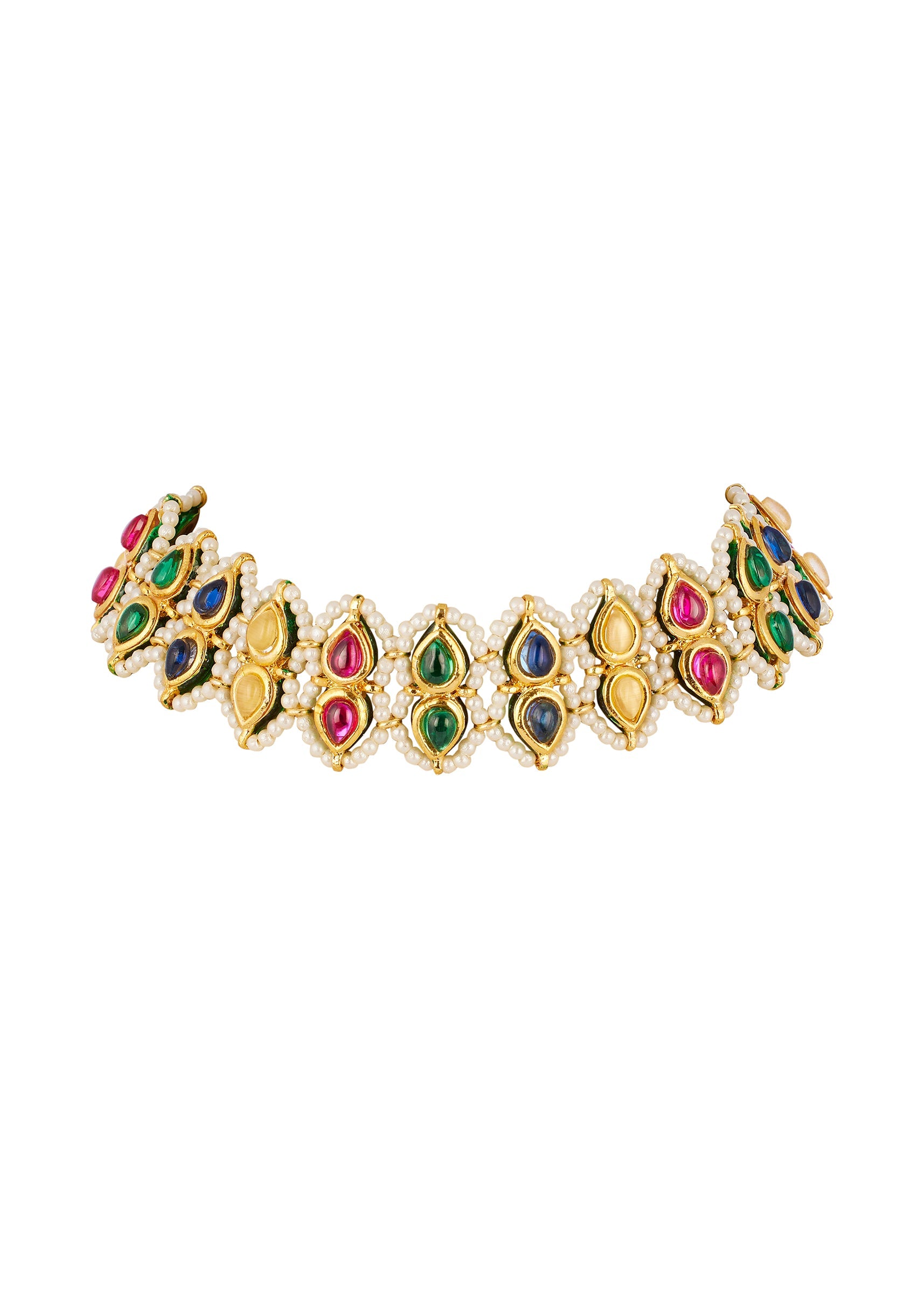 Bring timeless elegance to your ethnic wardrobe with this Kundan style jewelry set, designed in a classic gold tone finish. Accented with faux pearls and simulated coloured embellishments, the beautifully... More Product Details