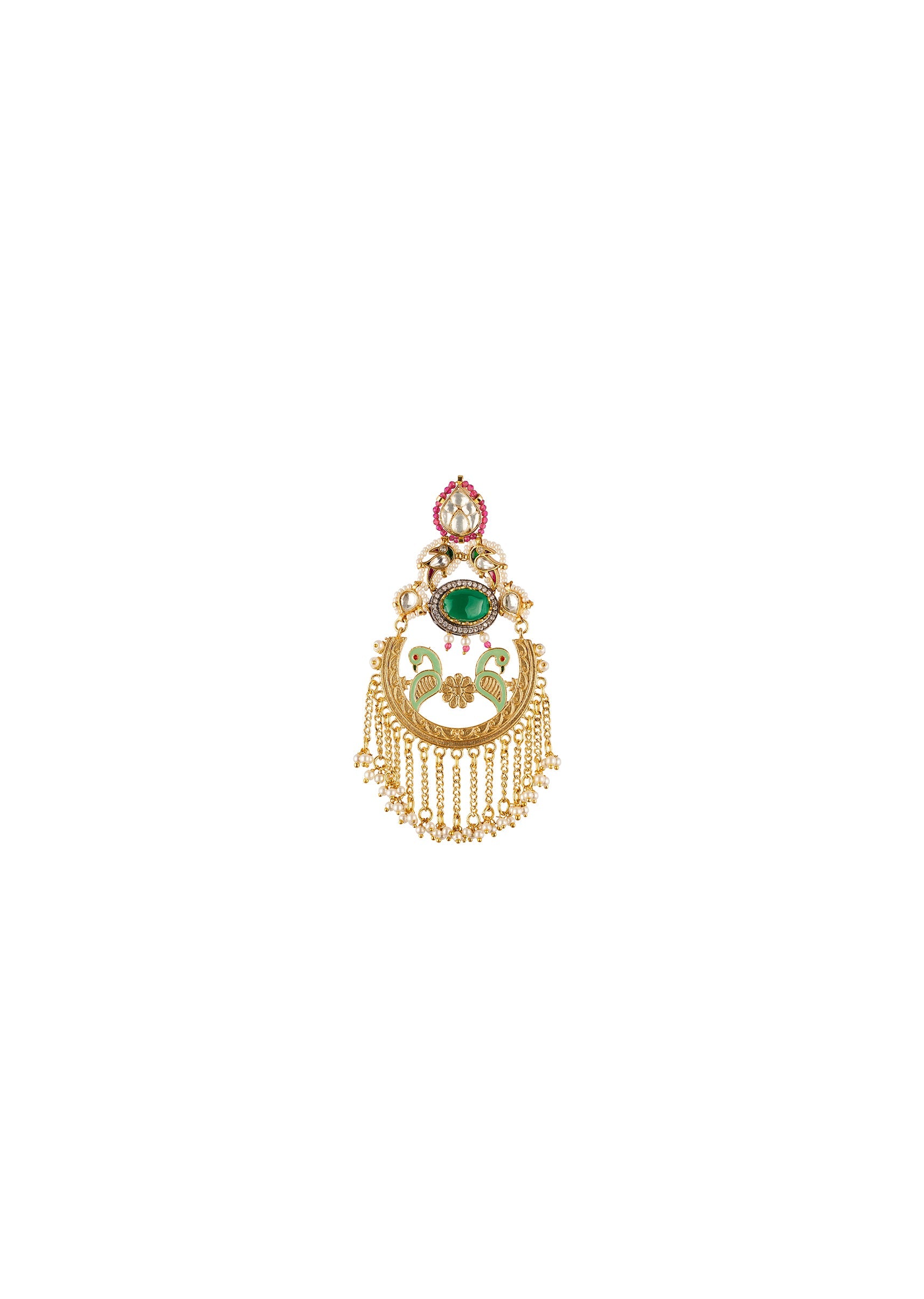 Add classic elegance to your ethnic look with these Kundan Polki style Chandbali earrings, crafted in a rich gold tone finish. Adorned with faux simulated coloured stones, the intricate detailing... More Product Details