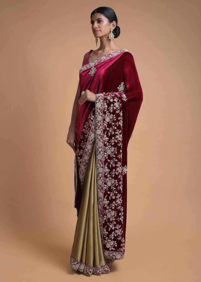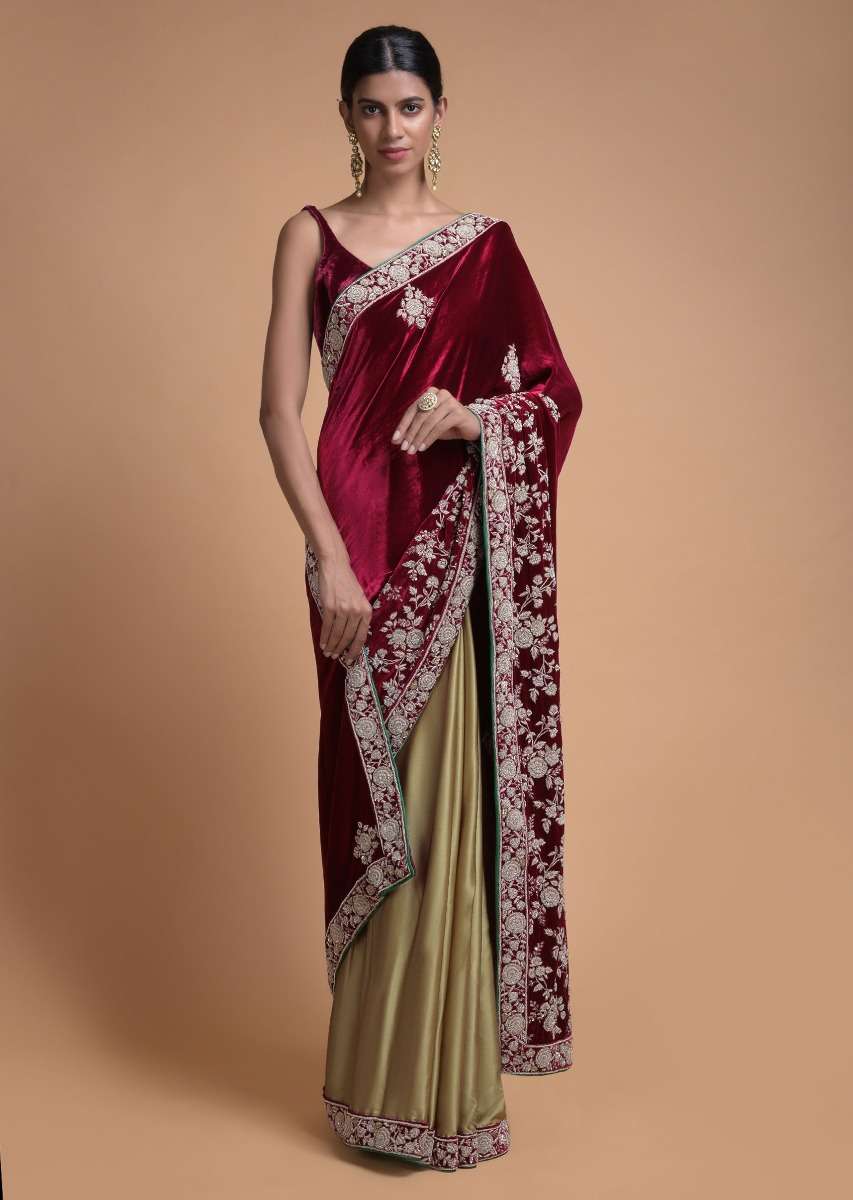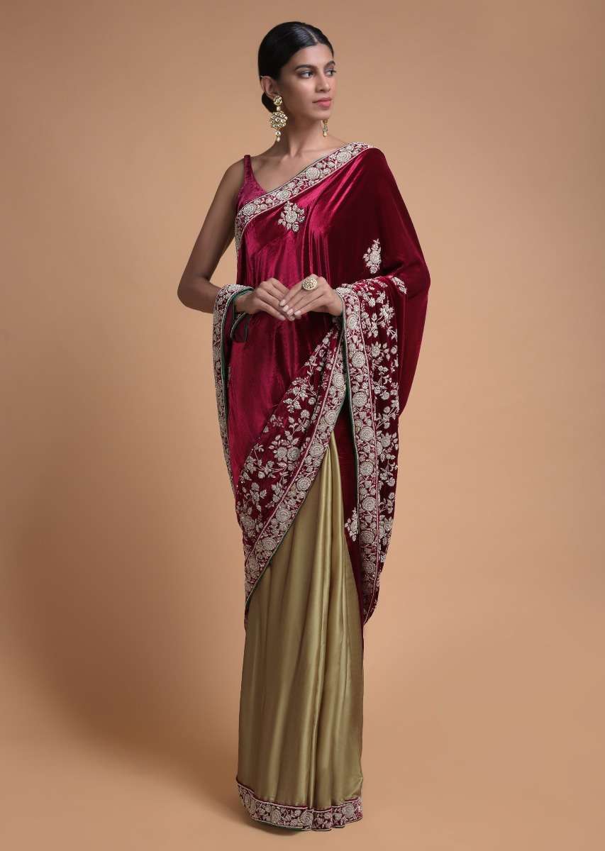Golden Beige Half And Half Saree With Cherry Red Pallu In Velvet Online - Kalki Fashion