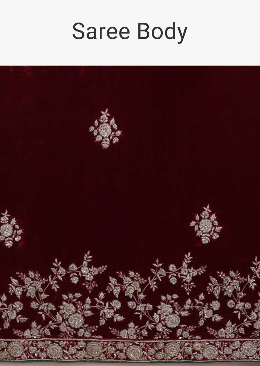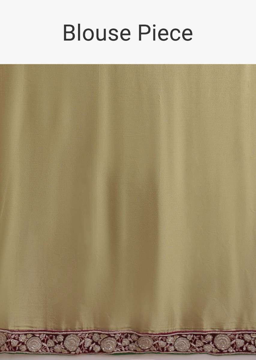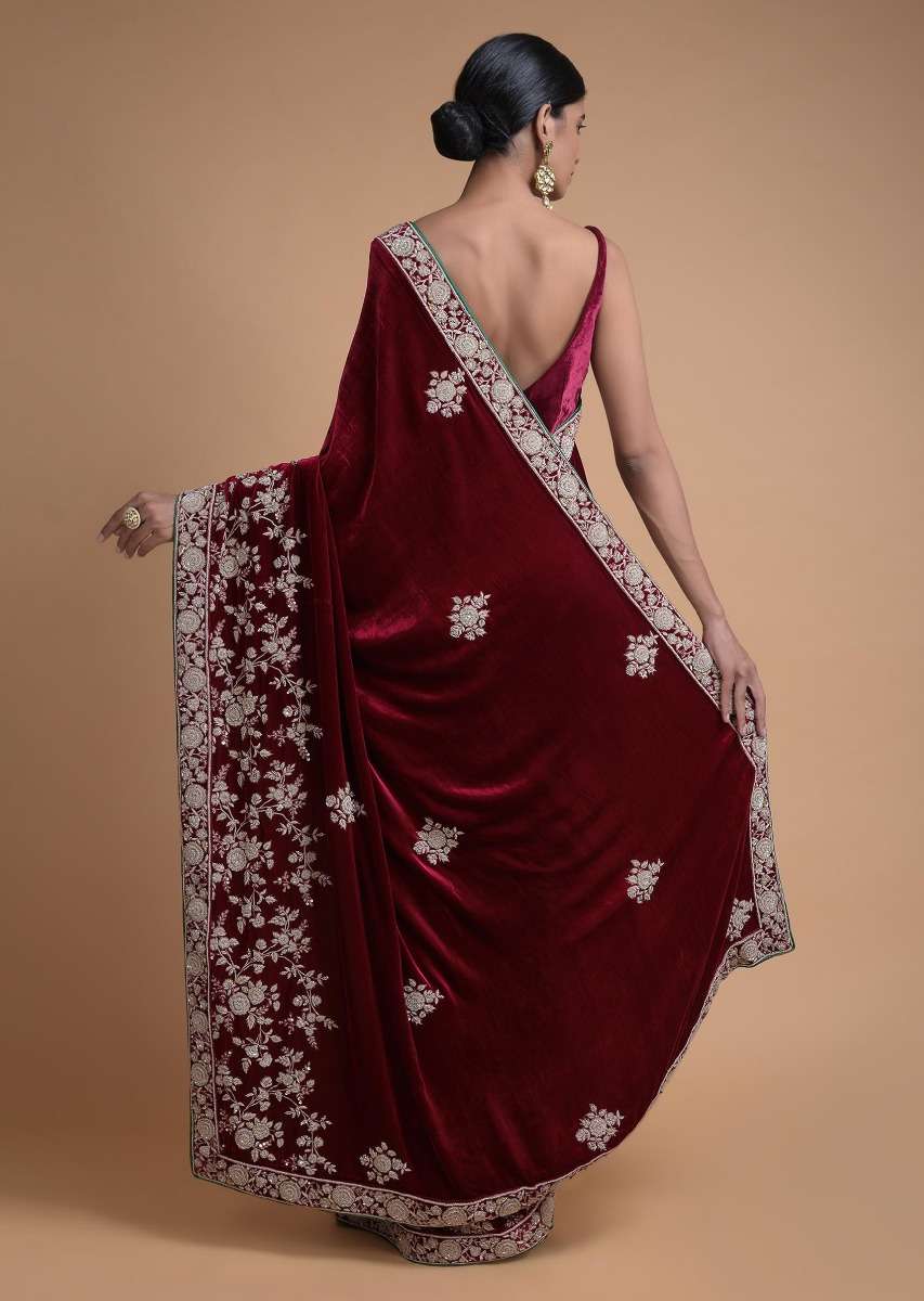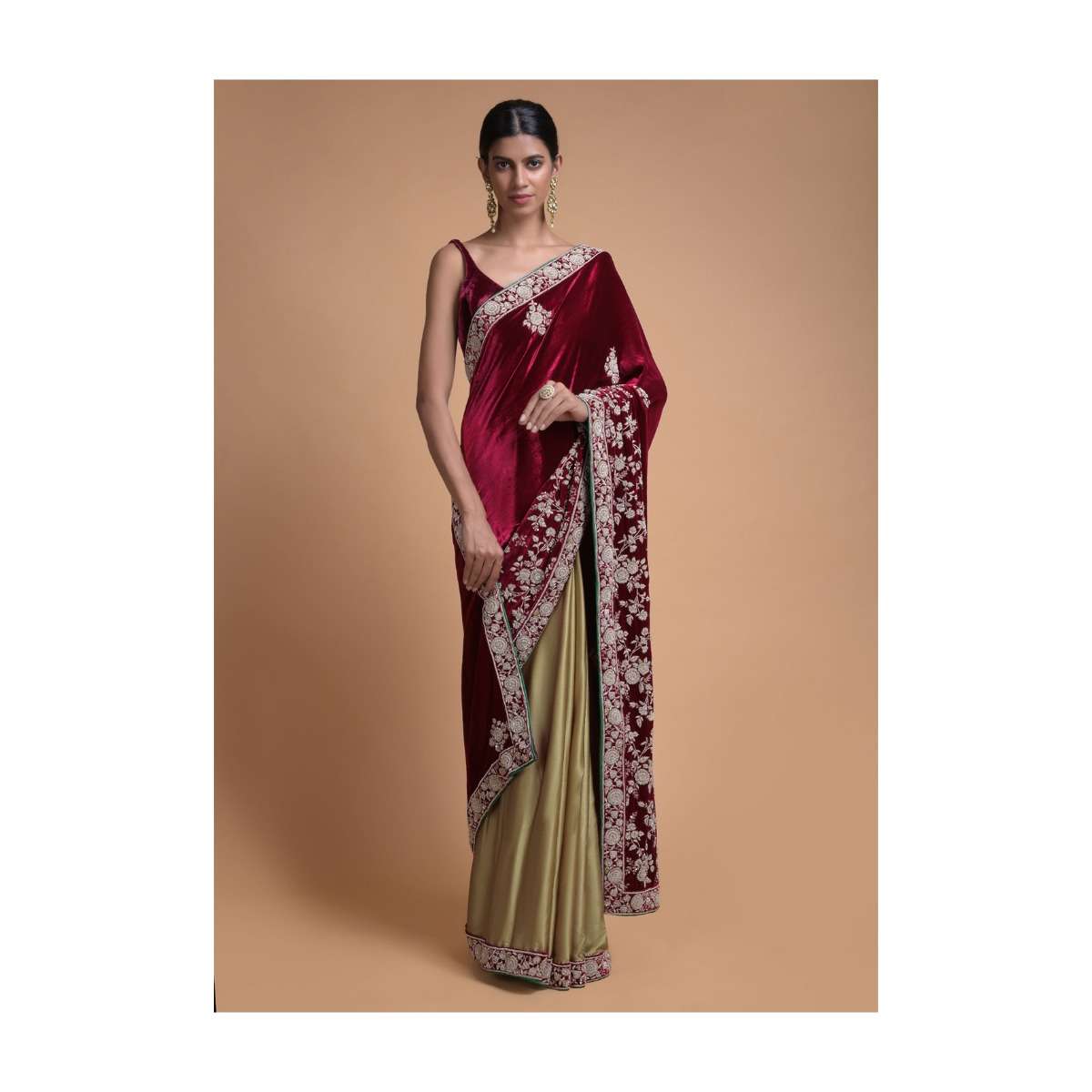 Golden Beige Half And Half Saree With Cherry Red Pallu In Velvet Online - Kalki Fashion