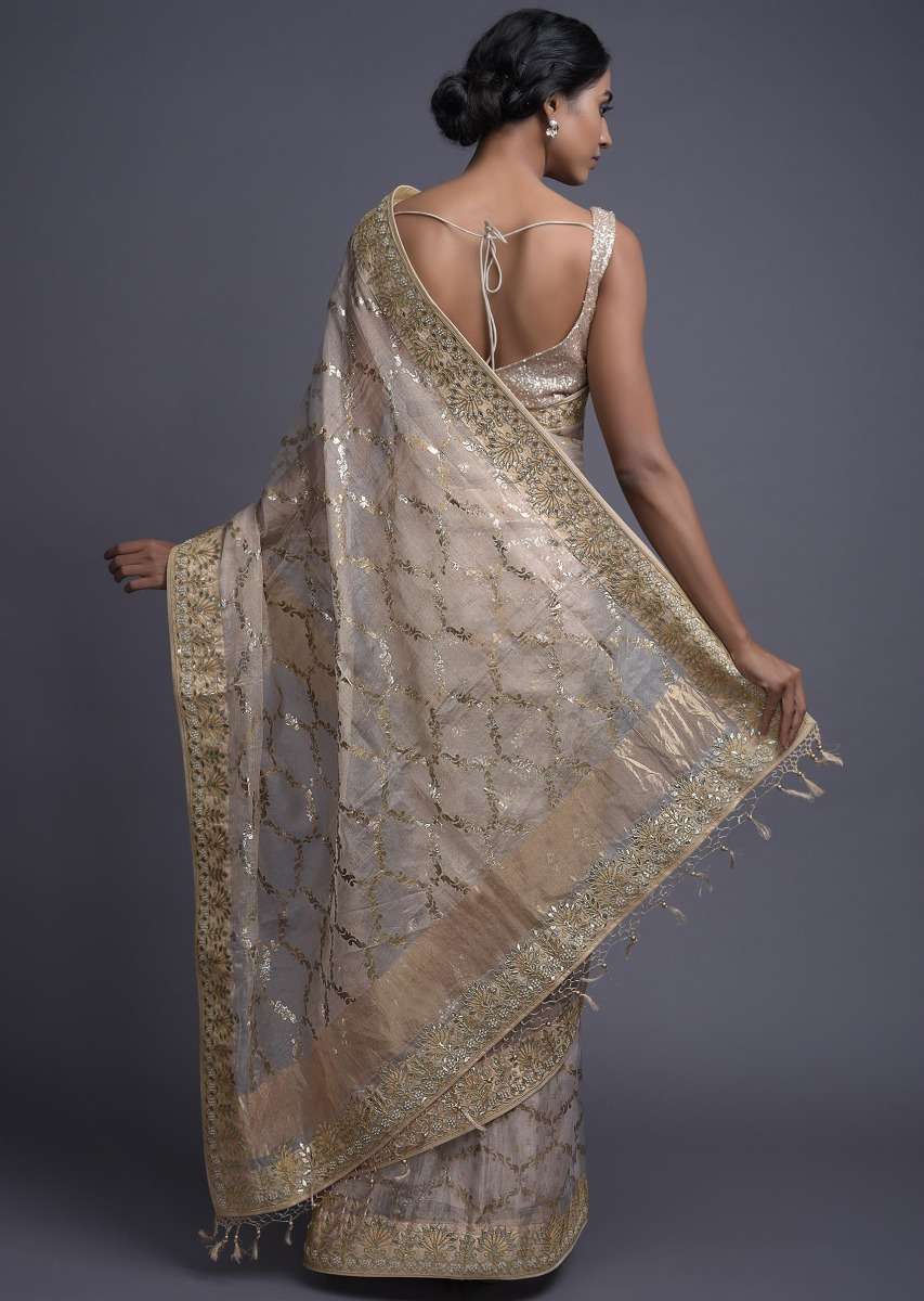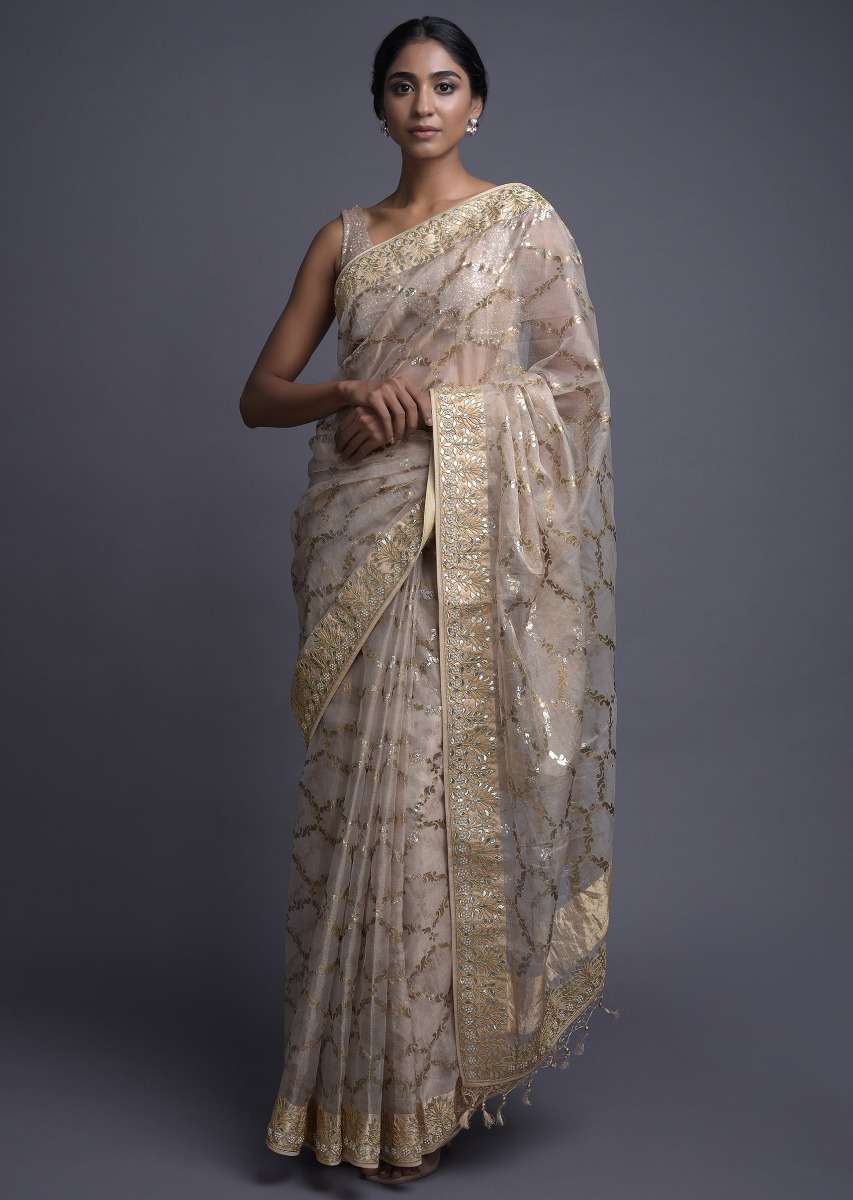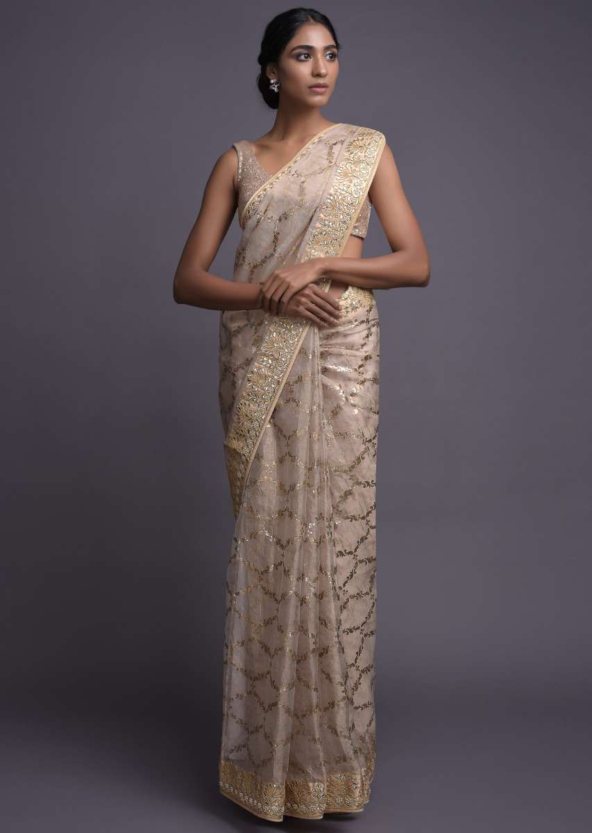 Golden Beige Saree In Silk With Foil Print And Gotta Work Online - Kalki Fashion