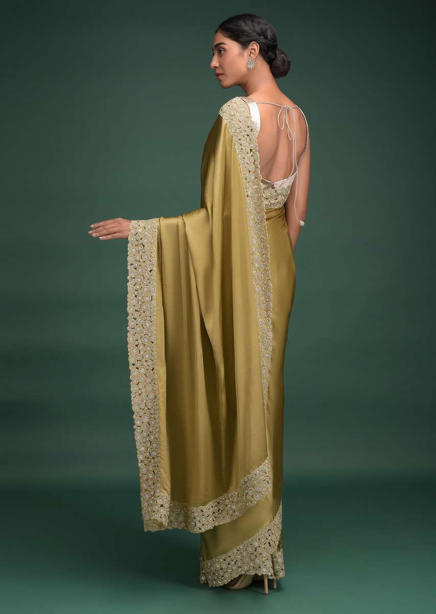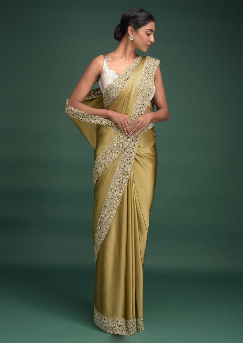 Granola Gold Saree In Satin With Cut Work Border Adorned With Beads And Kundan Online - Kalki Fashion