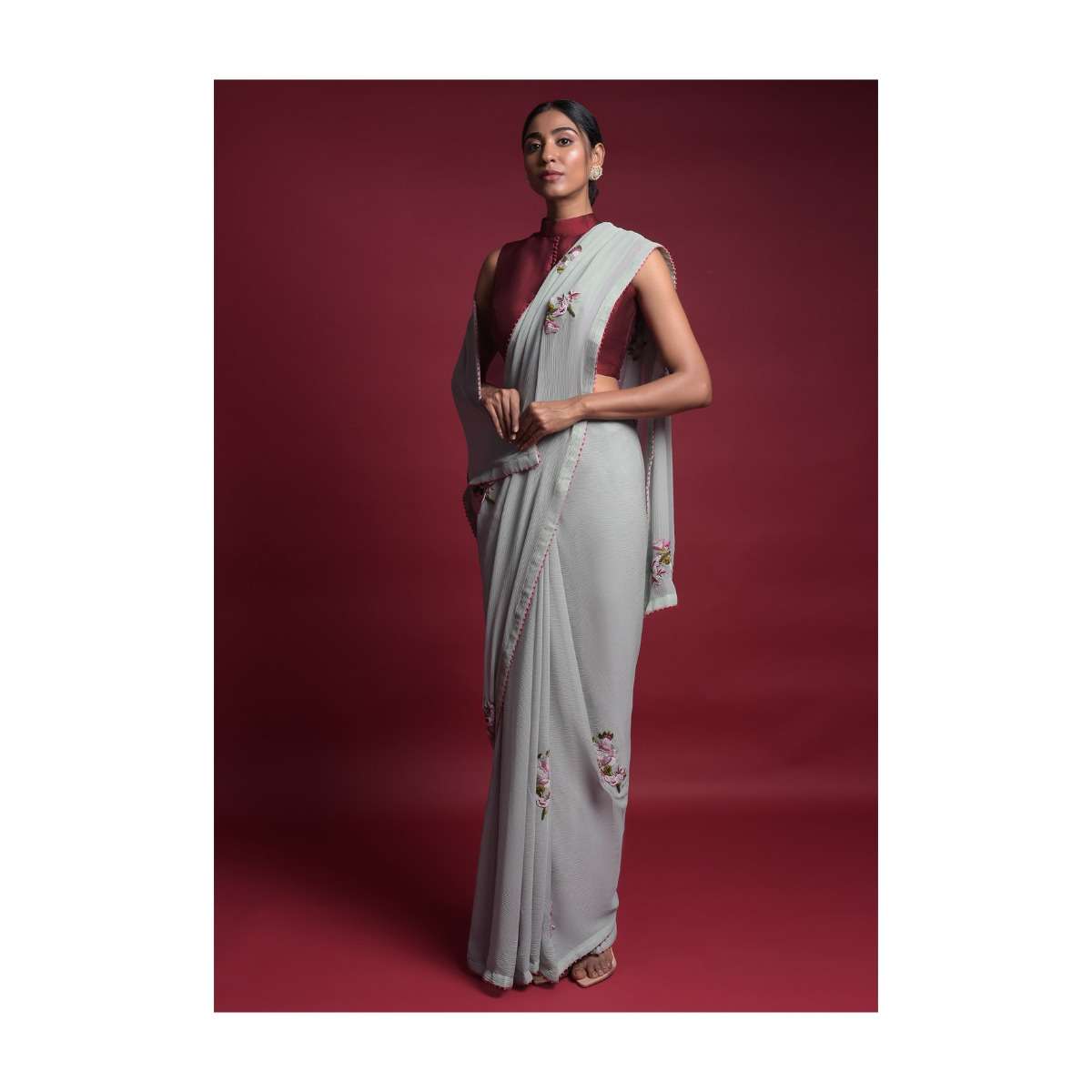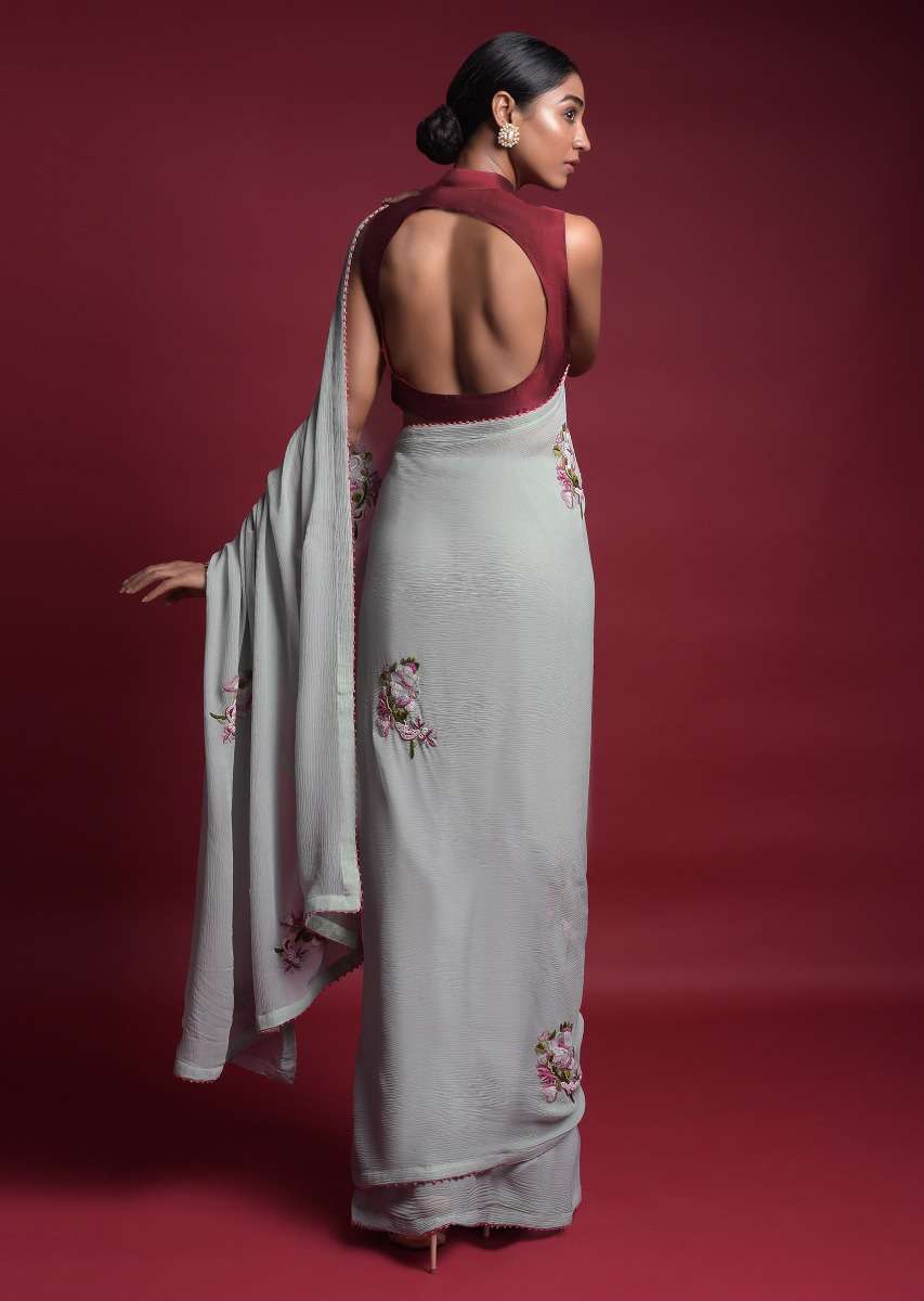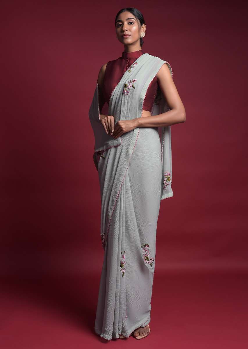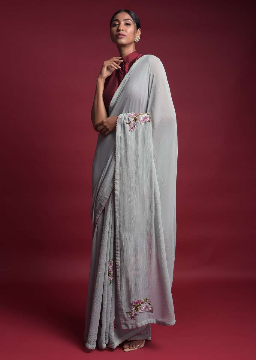 Grayish Blue Saree In Chiffon With Thread And Beads Embroidered Floral Motifs Online - Kalki Fashion