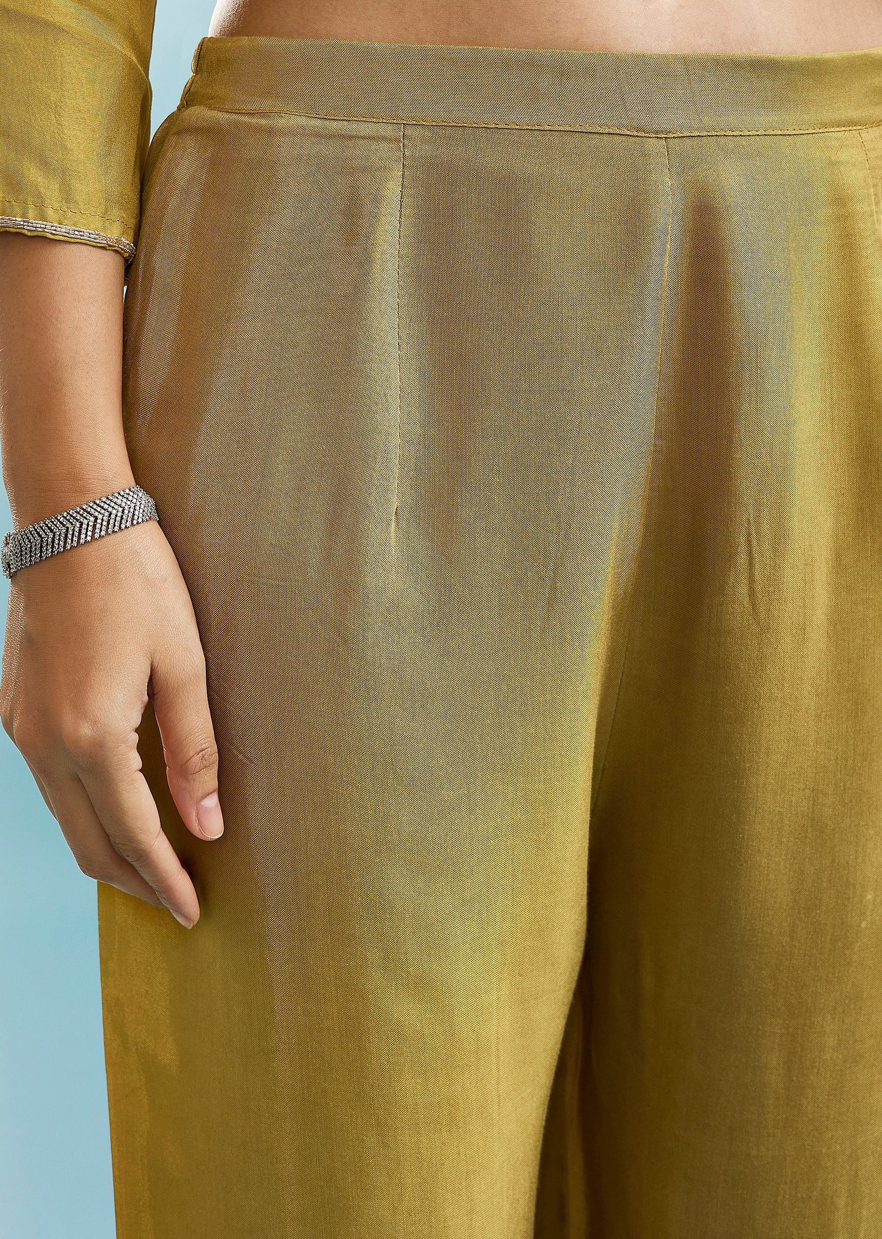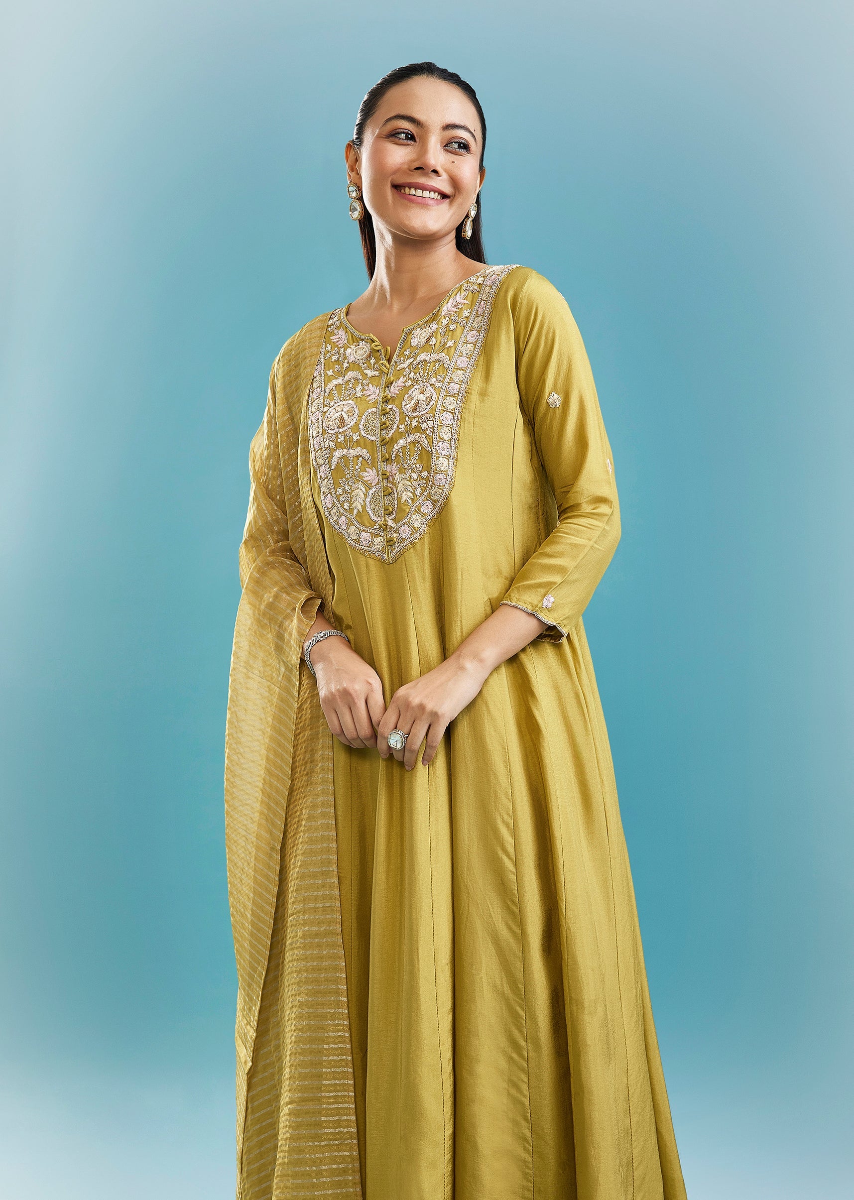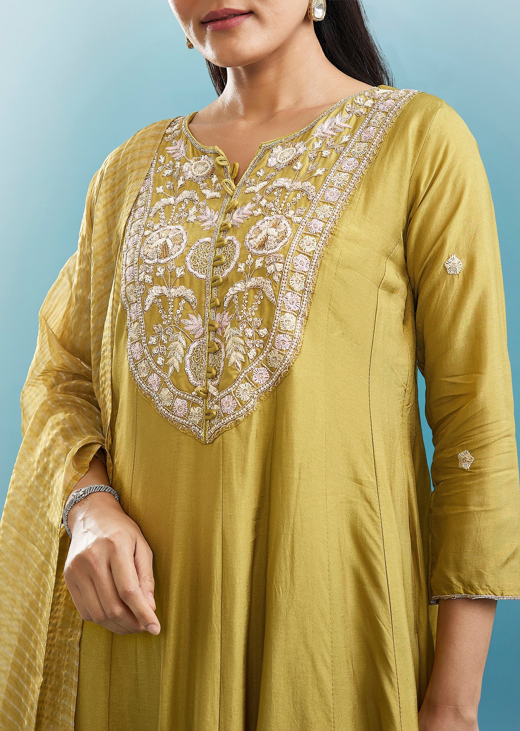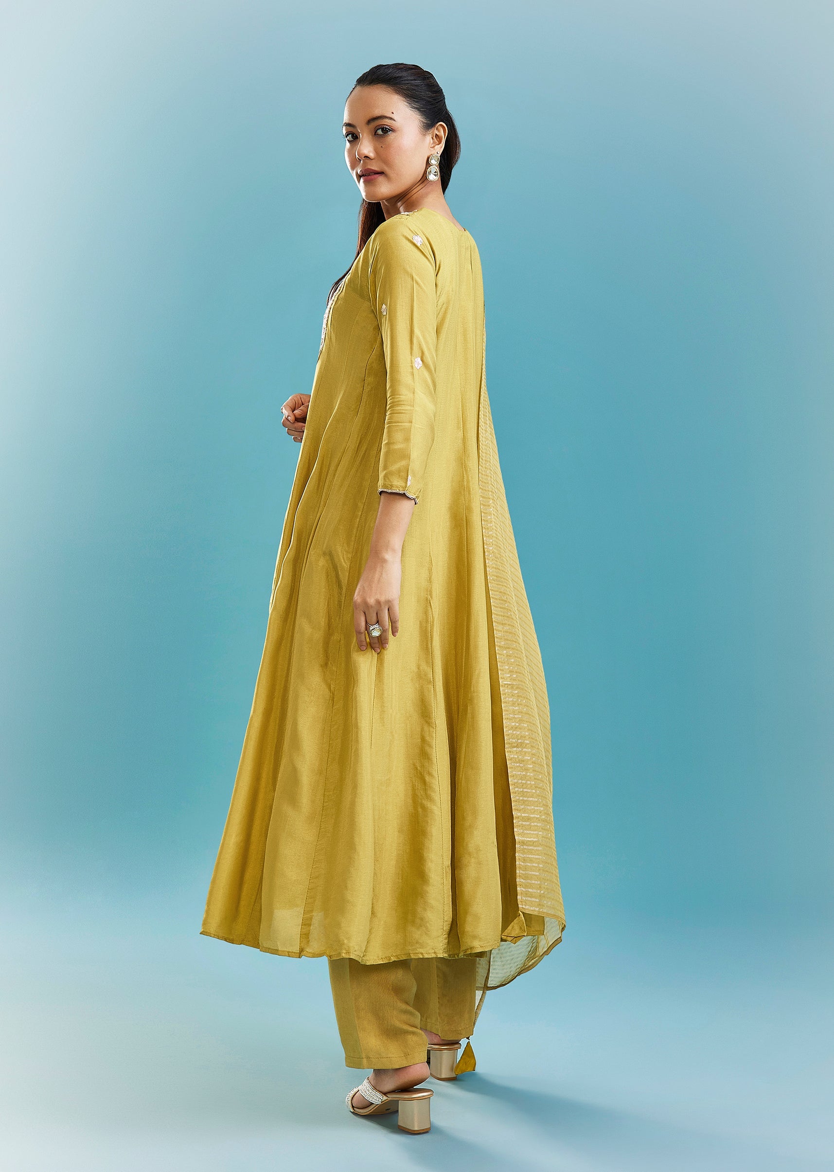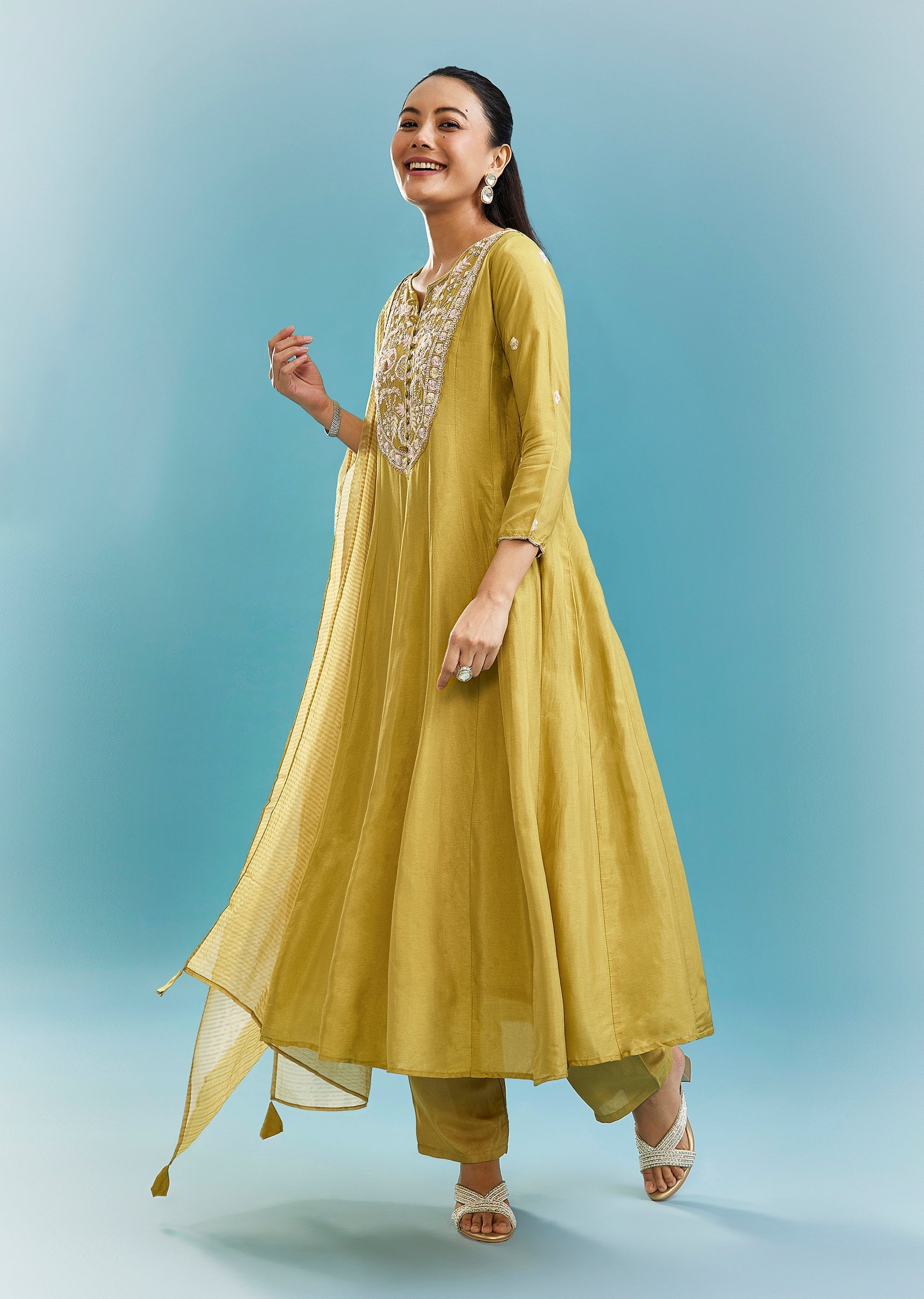 A soft yet festive pick, this green silk anarkali set features delicate sequins and resham work that add subtle texture and shine. The fluid silhouette paired with pants and dupatta... More Product Details