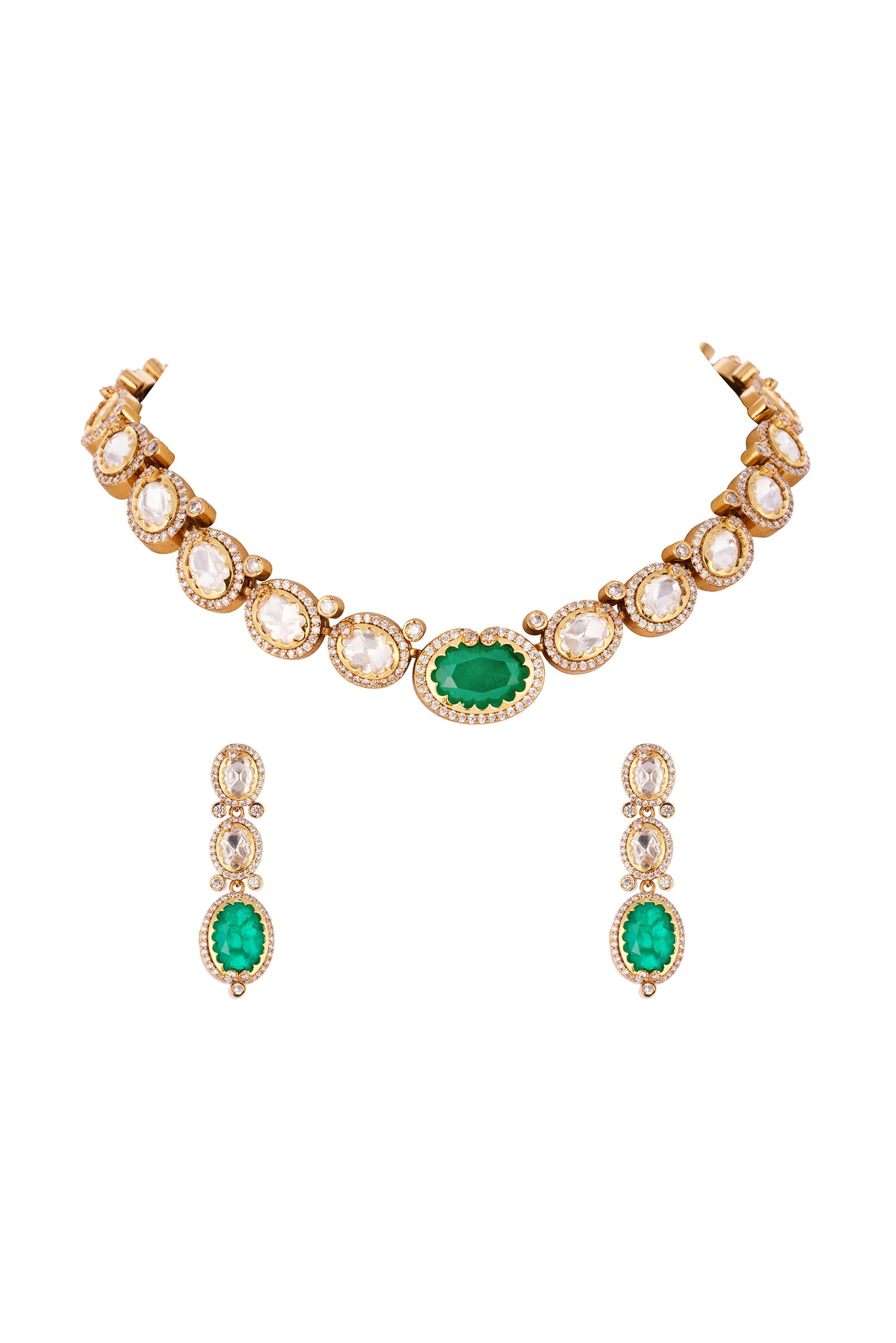 Green and Gold Finish Necklace Set In Polki With Emerald Accents