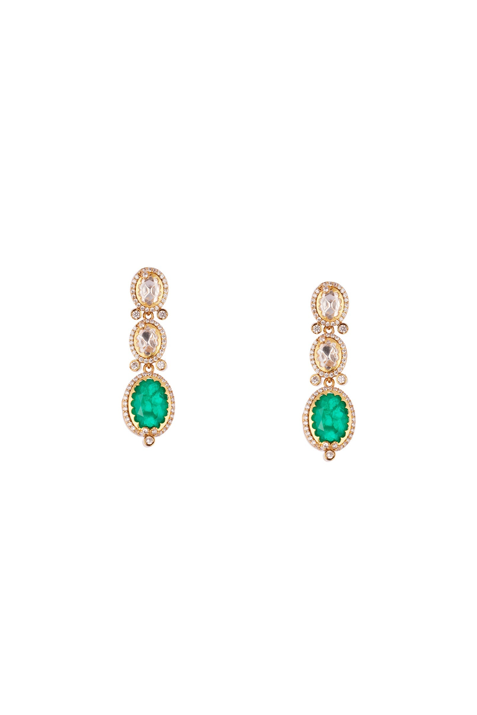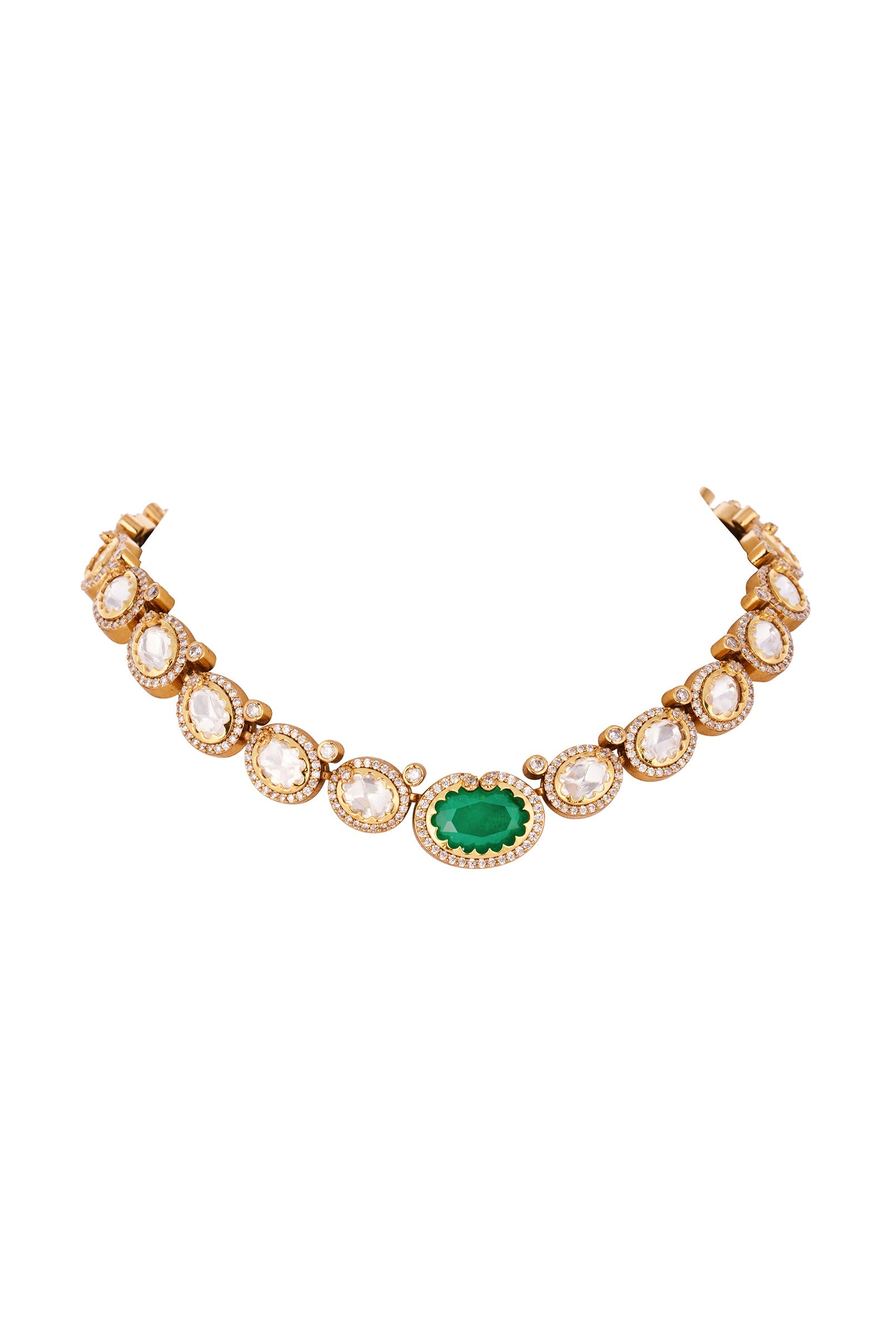 A refined green and gold necklace set featuring Polki uncut diamonds crafted in the traditional Kundan Jadau technique. Enhanced with semi precious emerald detailing, this handcrafted Indian jewelry piece brings... More Product Details