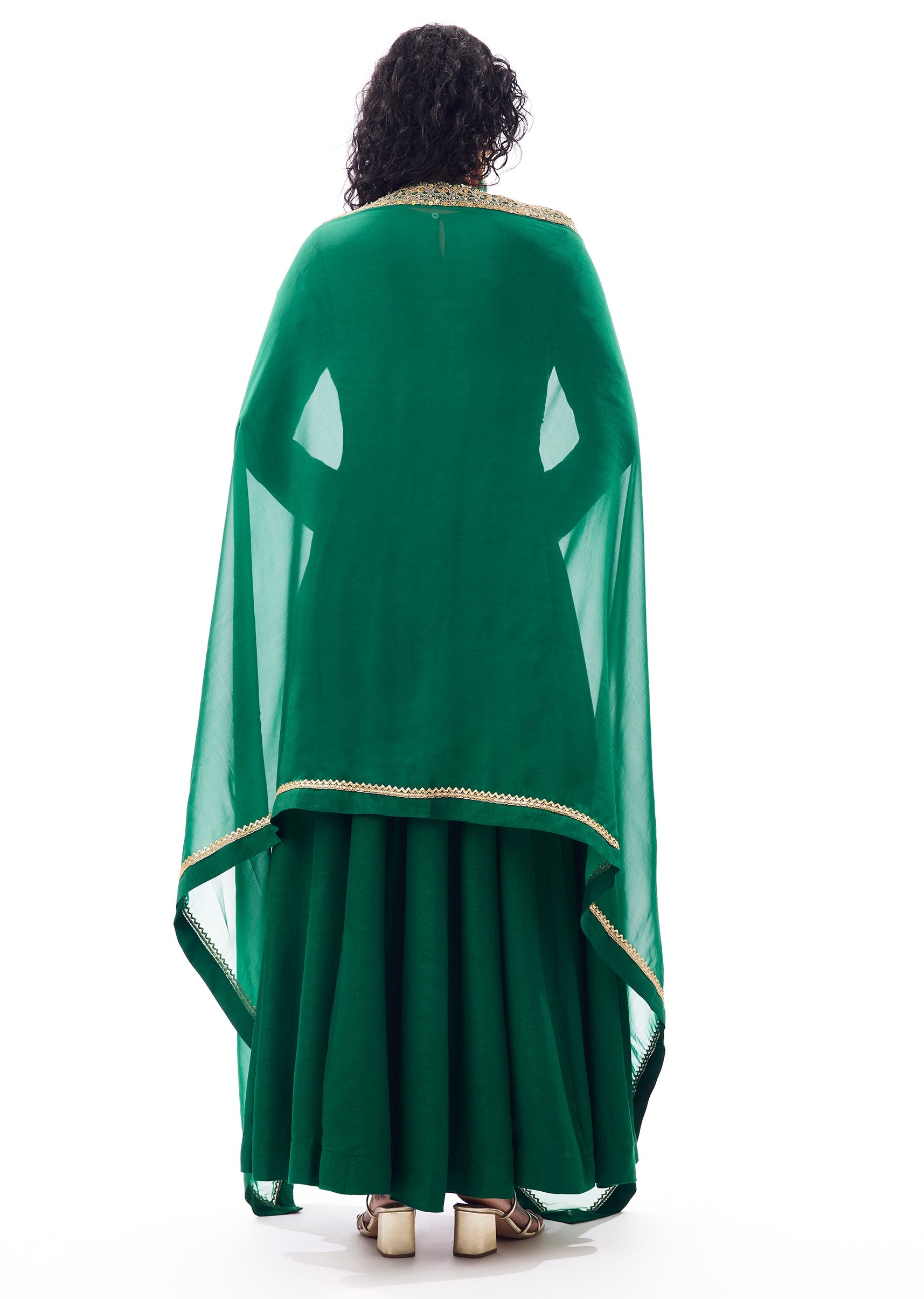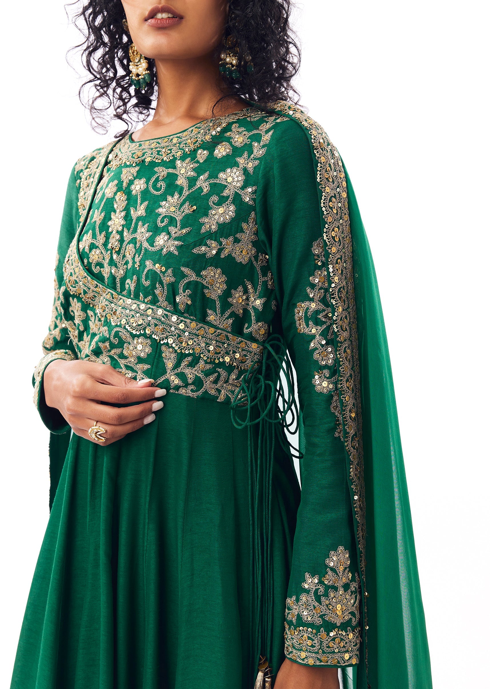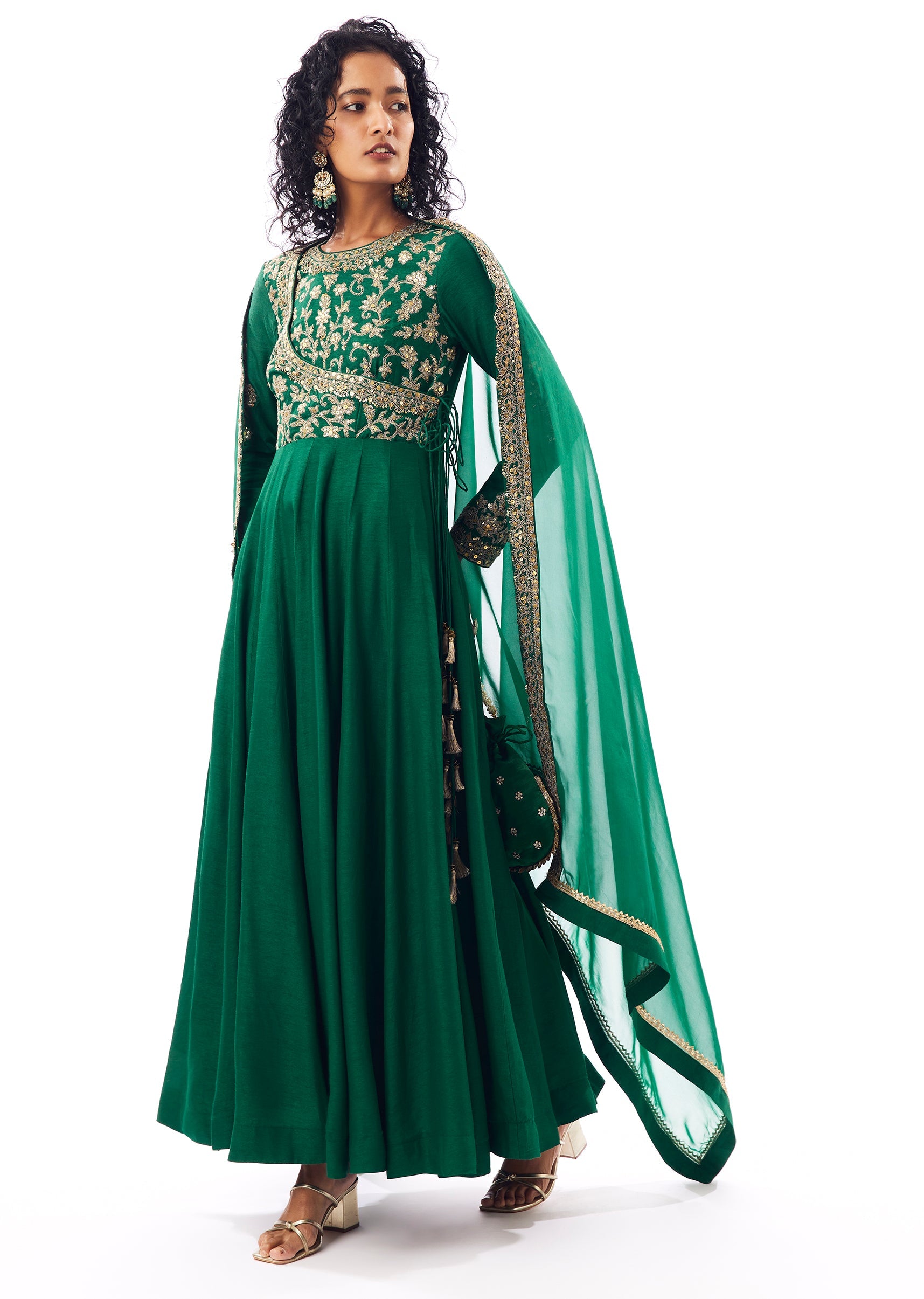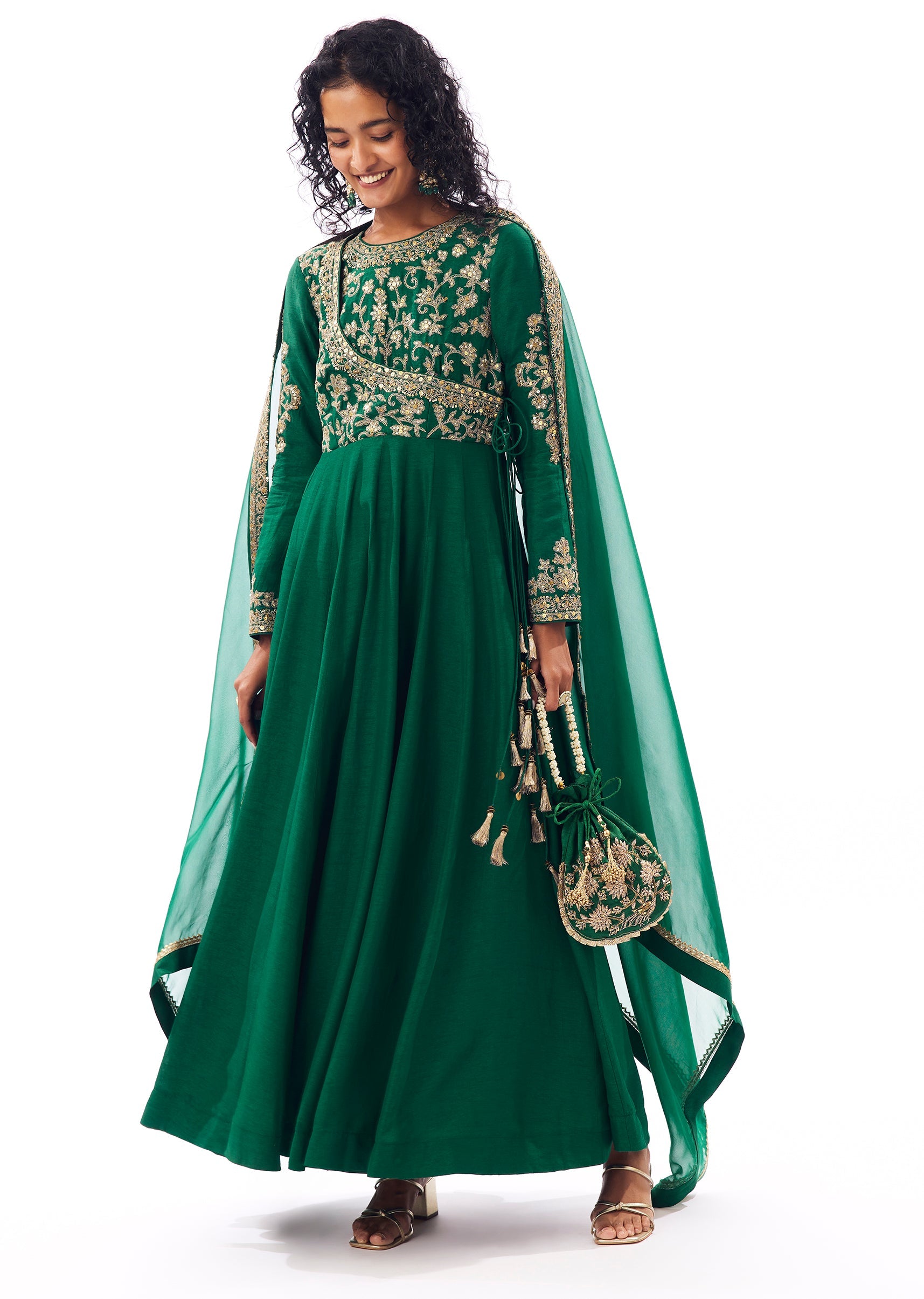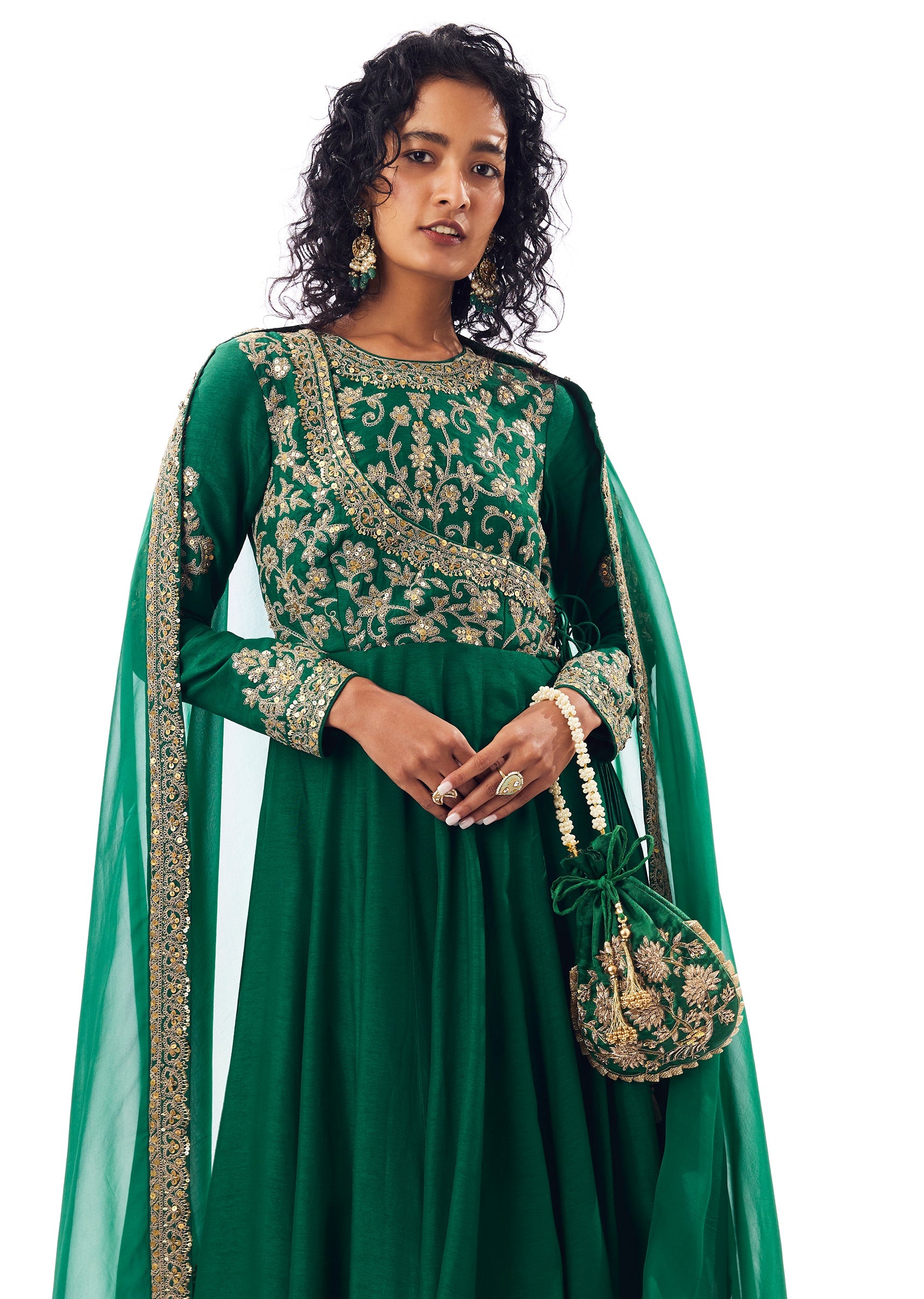 A floor-length anarkali crafted in silk (dola silk) with zari and sequin work in an angarkha-style design. Finished with full sleeves and a round neckline, it comes with an organza... More Product Details