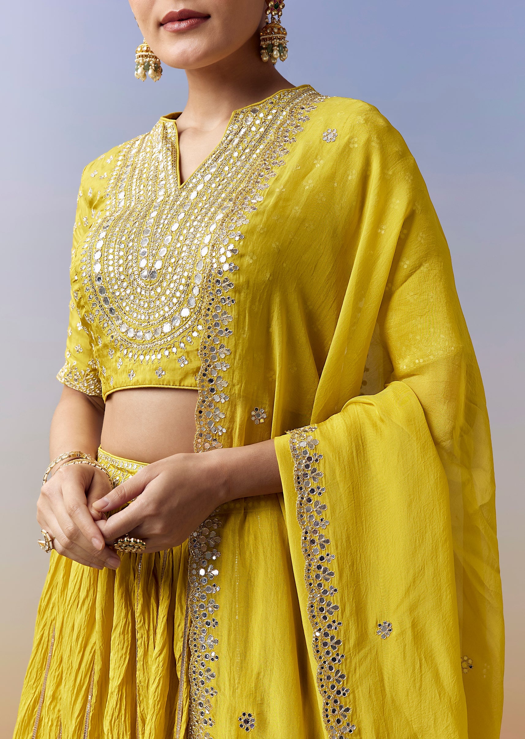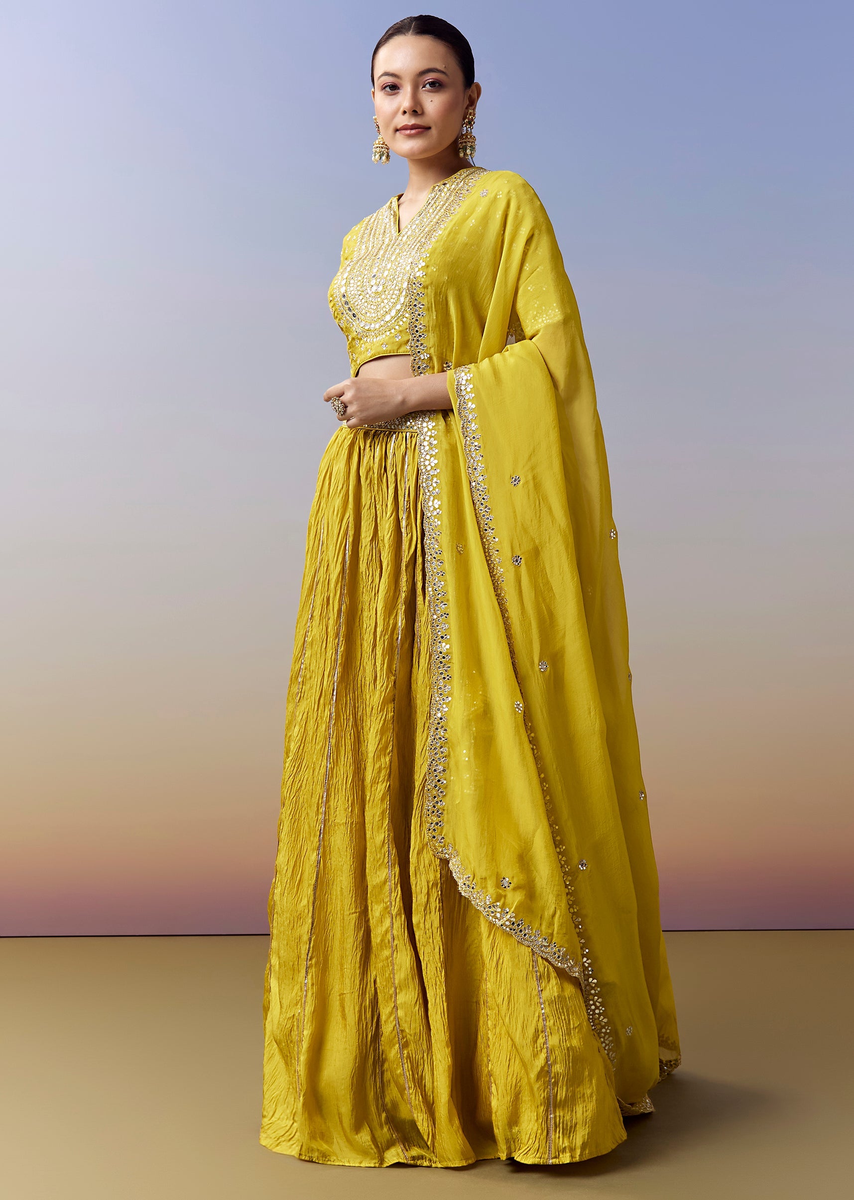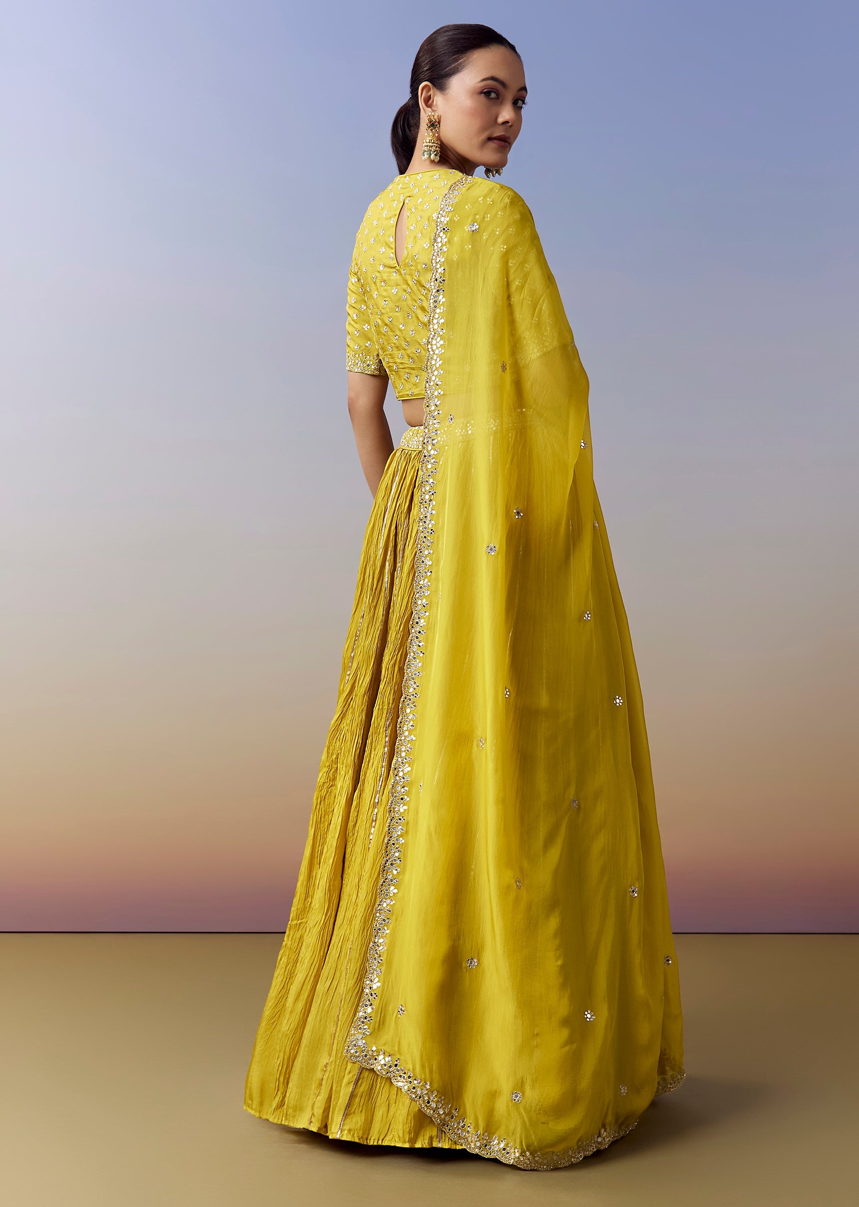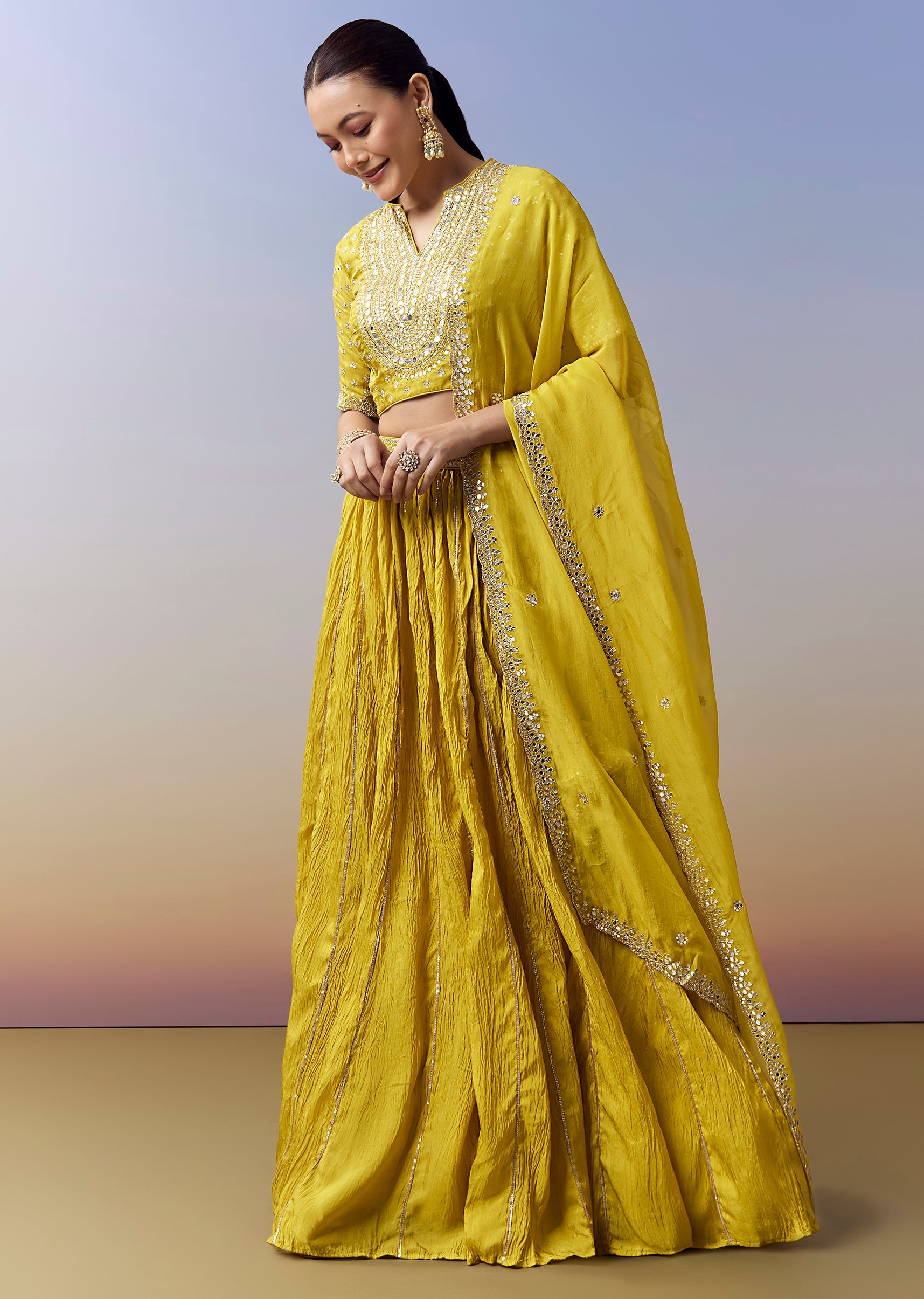 This green bridesmaid lehenga is crafted in vibrant chinon and designed in a graceful circular silhouette that brings fluid movement to every step. The lehenga is elevated with foil mirror and zari detailing that adds a festive glow, while the choli is adorned with delicate gotta lace accents. The notched neckline and half sleeves create a refined and elegant look, perfect for haldi, mehendi, and wedding celebrations. Paired with a coordinating dupatta, this ensemble blends color pop freshness with timeless bridesmaid charm. Awarded as the Most Trusted Brand, we're delivering styles you love, just as promised.